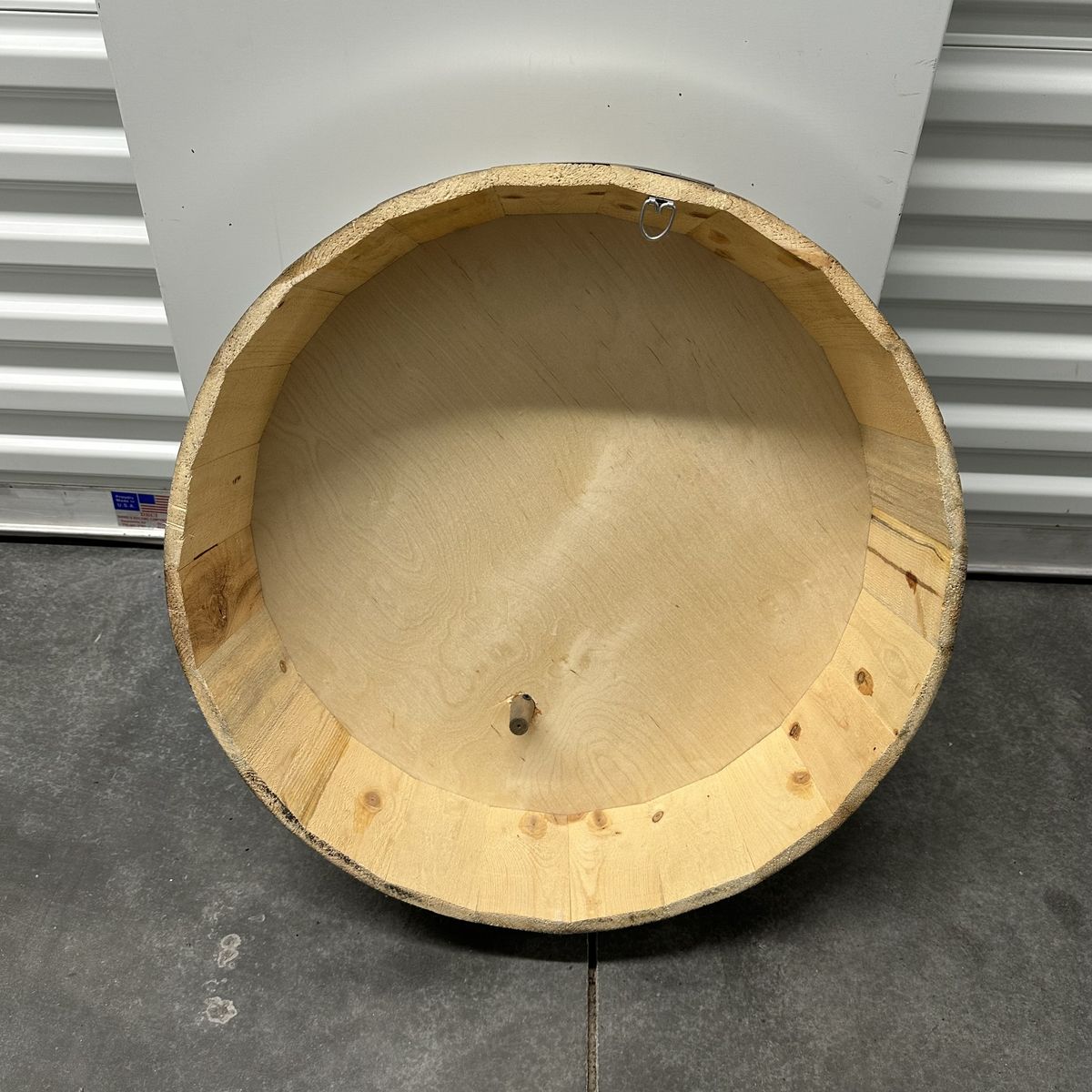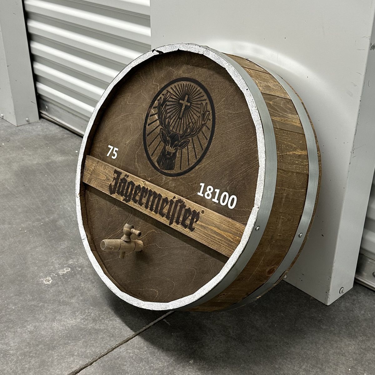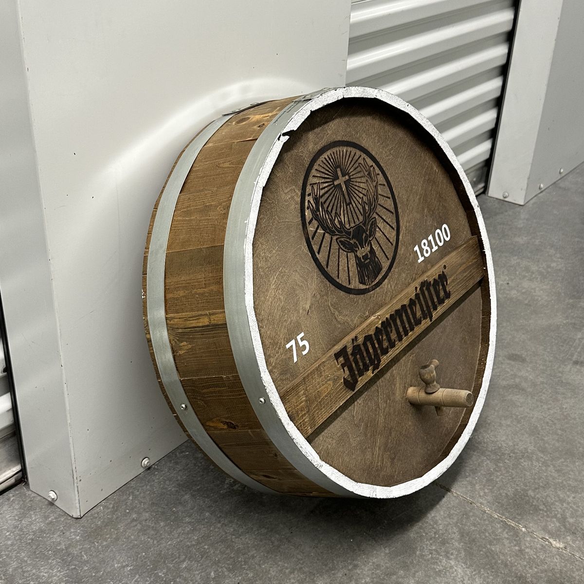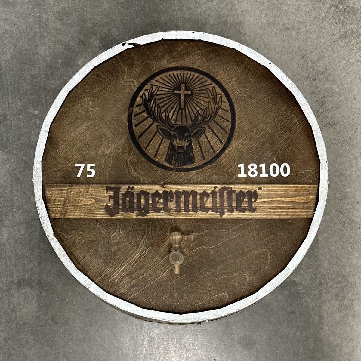 VenmoJagermeister Whiskey Barrel Head. This item is in excellent condition with no defects or damage. The diameter of this item measures 21.5"; this item measures 7" deep.