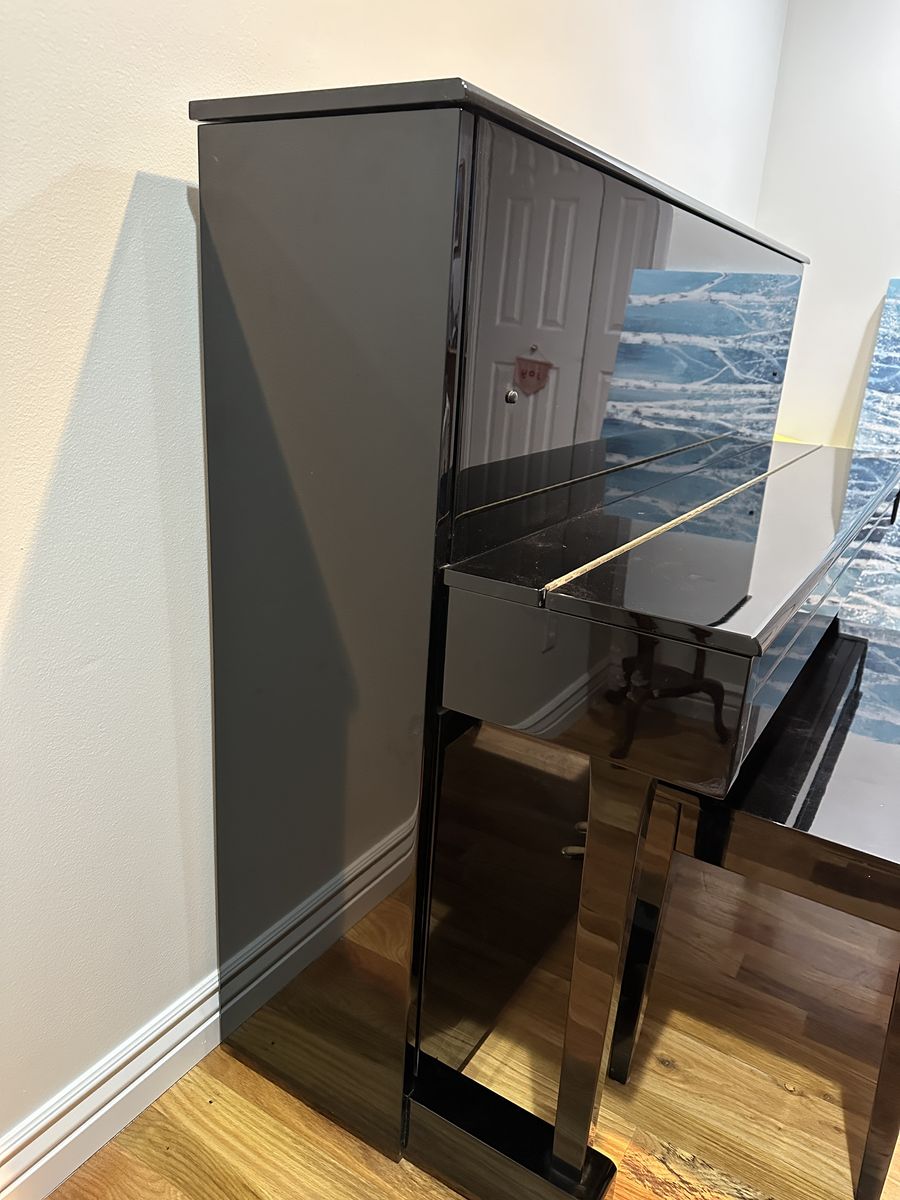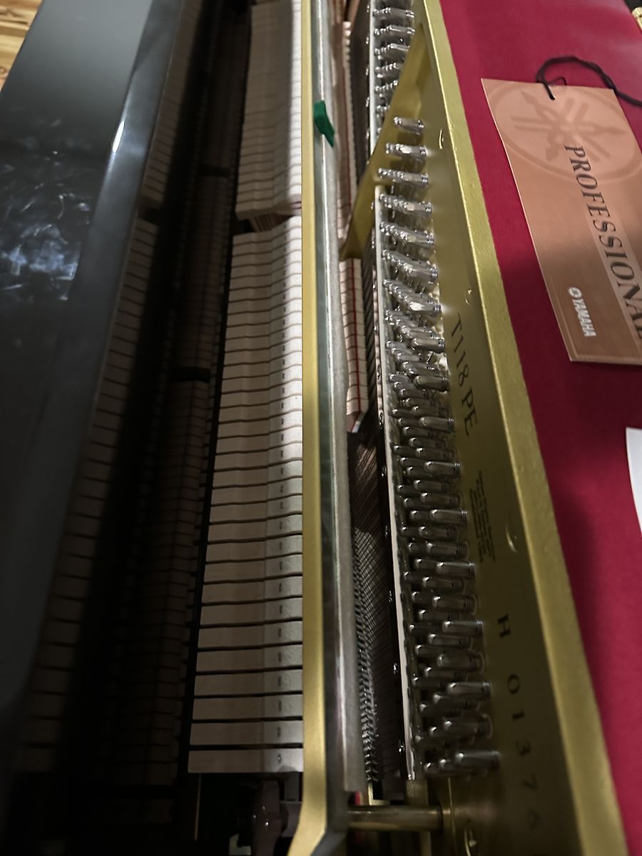 VenmoBeautiful Yamaha T118 PE upright piano in polished ebony finish. This is a high-quality studio upright made by Yamaha, known for reliability and great tone.
