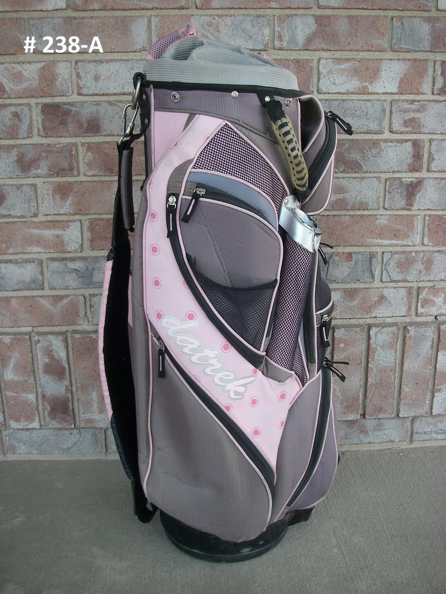 #238 See 2 Photos, DATREK, WOMENS, Cart Bag, Grey / Pink, 3 Handles & Shoulder Strap, 14 Dividers, 9 Pockets, Rain Fly, Good Condition (but has some small, dirty spots), $49