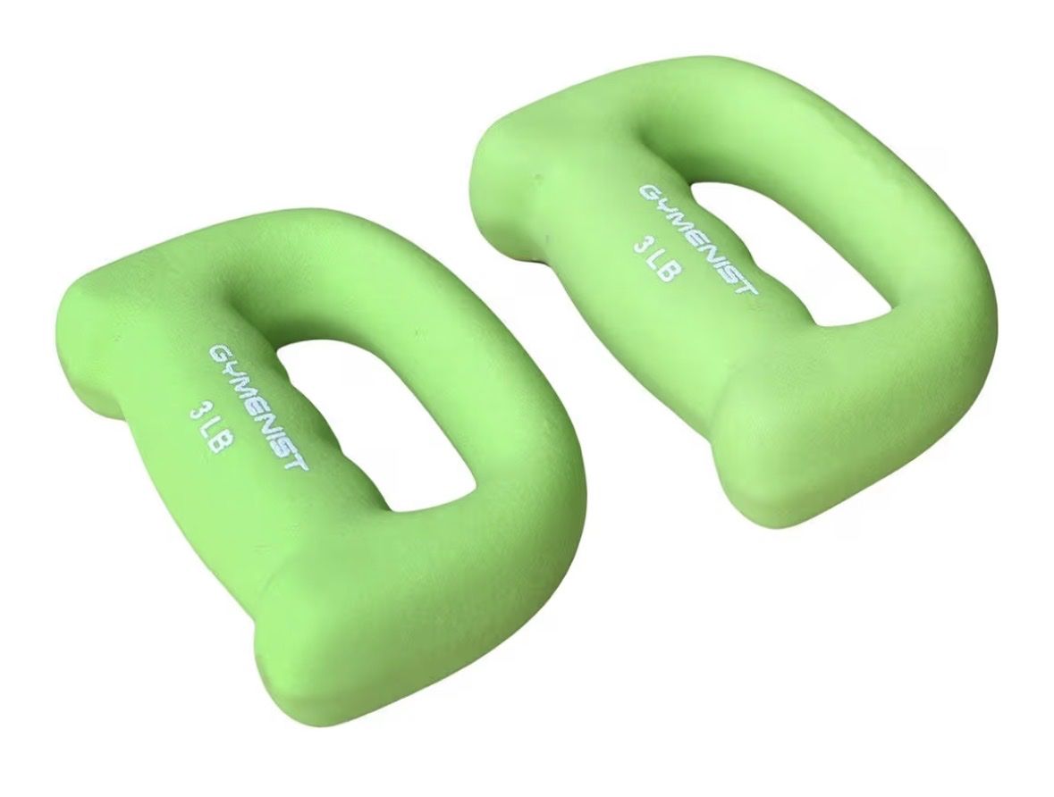 Green Gymenist 3lb hand-shaped dumbbells Retails for $25 Pick up in Centerville These are made with a soft neoprene coating. This pair of weights has an ergonomic grip design for walking or jogging. Each weight is 3 pounds and features a bright lime green color.