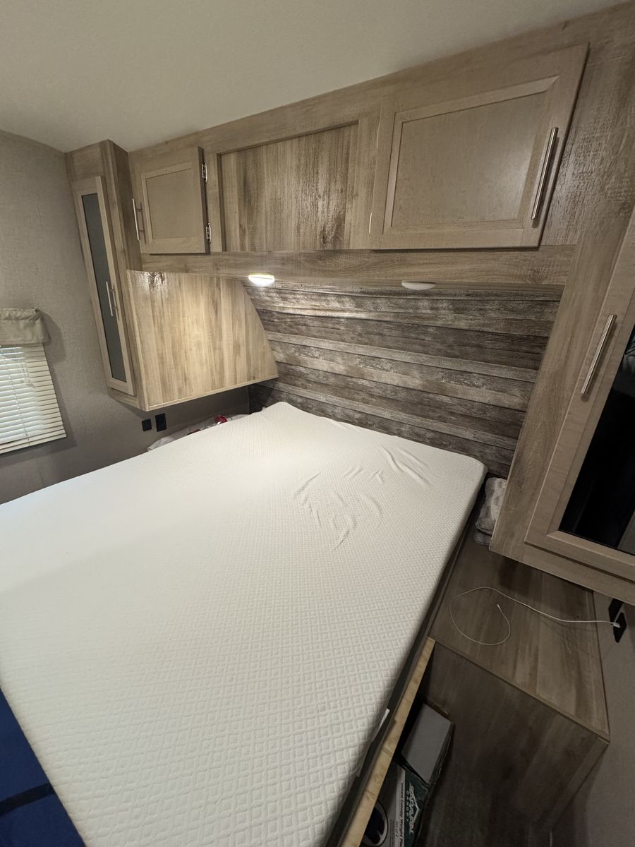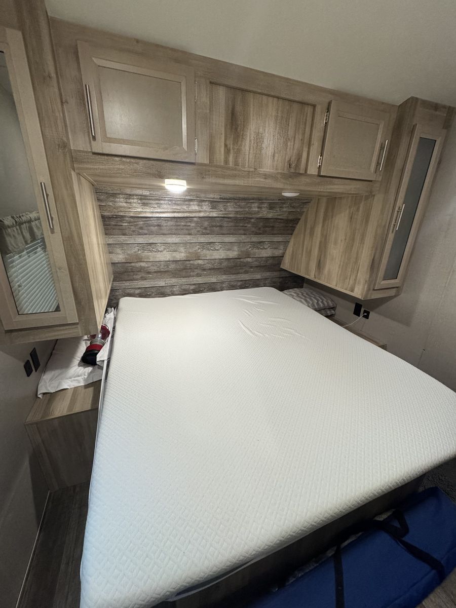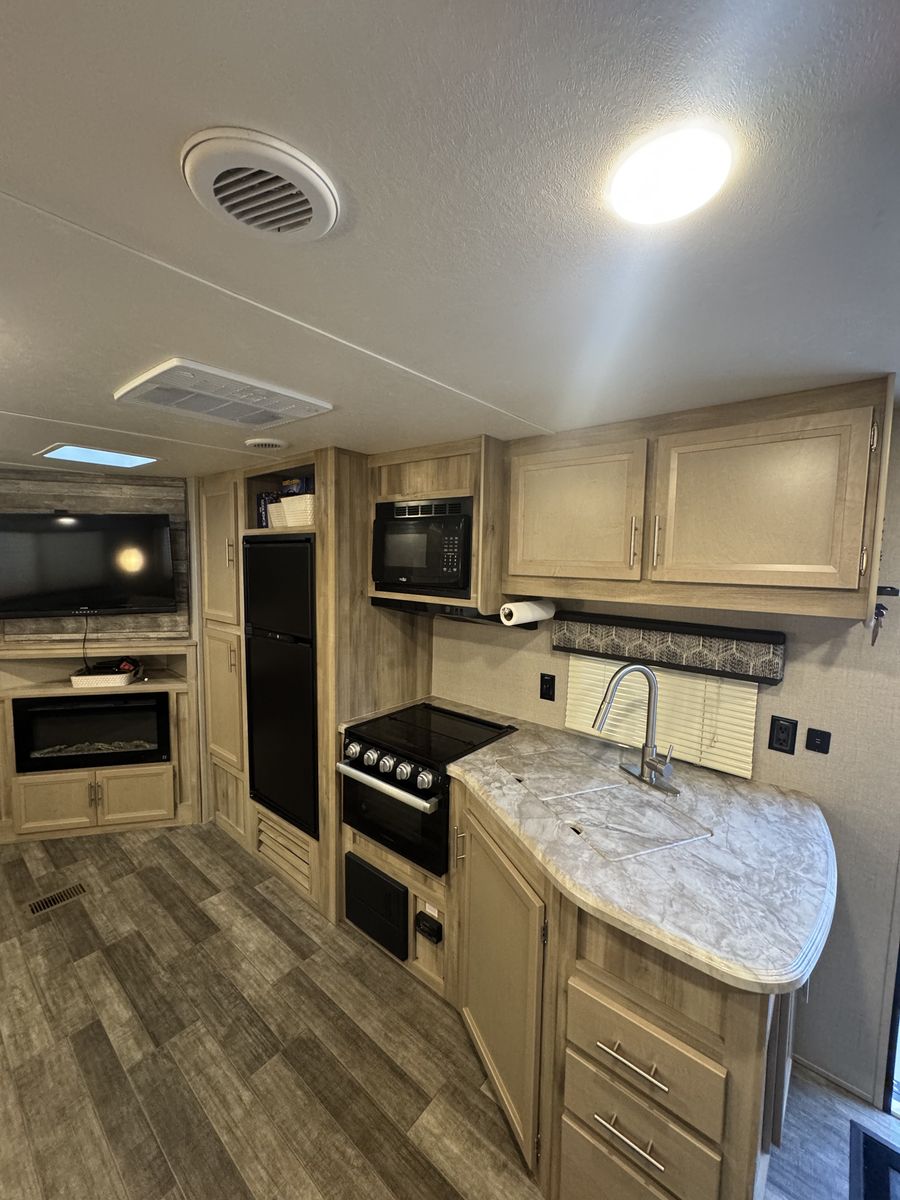 Queen bed in master with large closet area, double over double bunks in rear , u shaped dinette, entertainment center with fireplace, outdoor kitchen, lots of cabinet space with large panty, sleeps 9-10