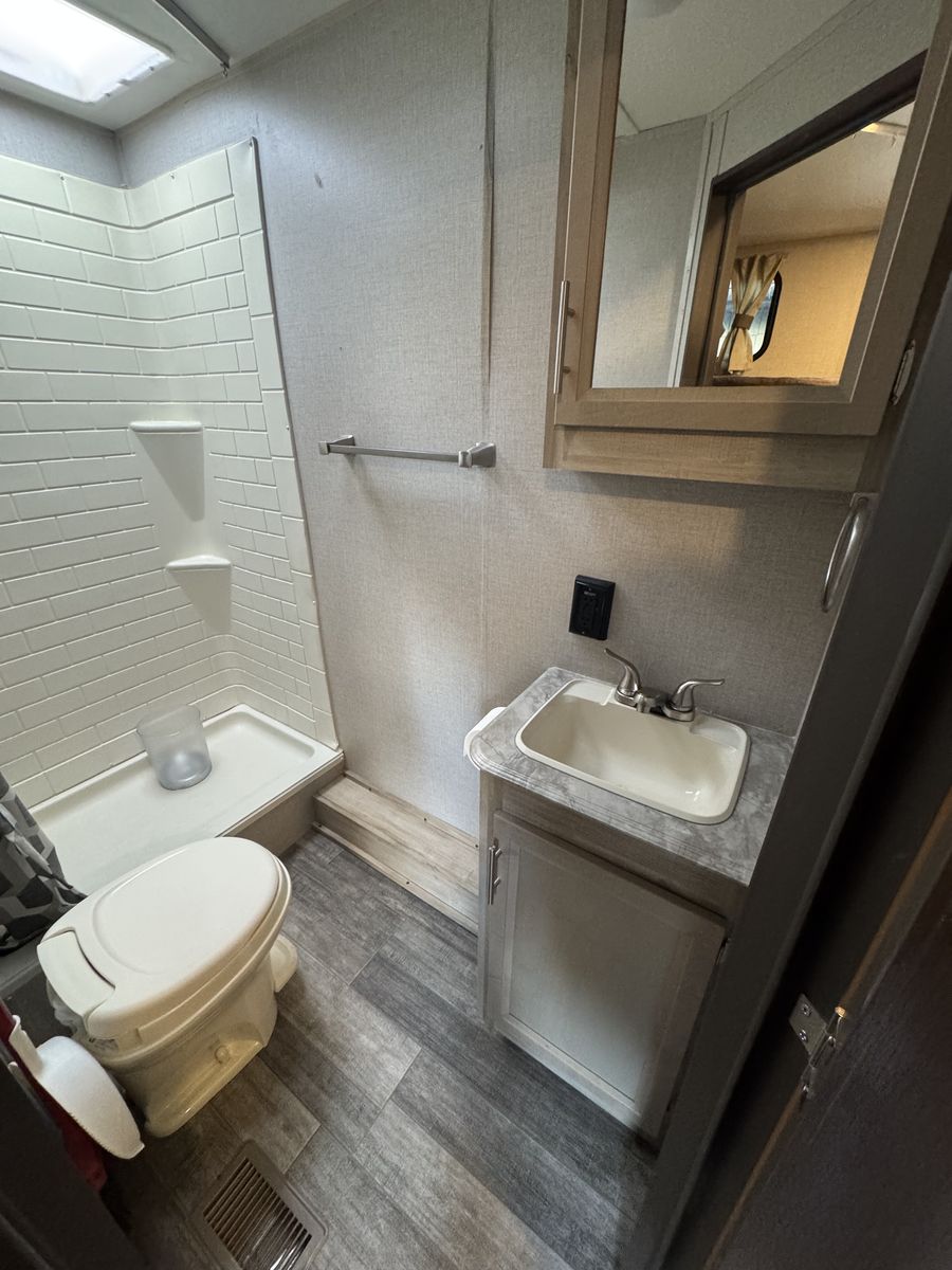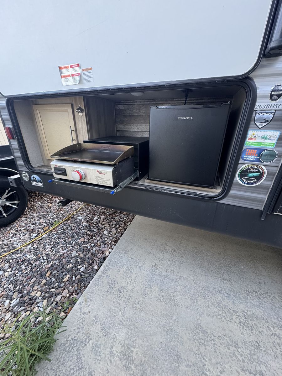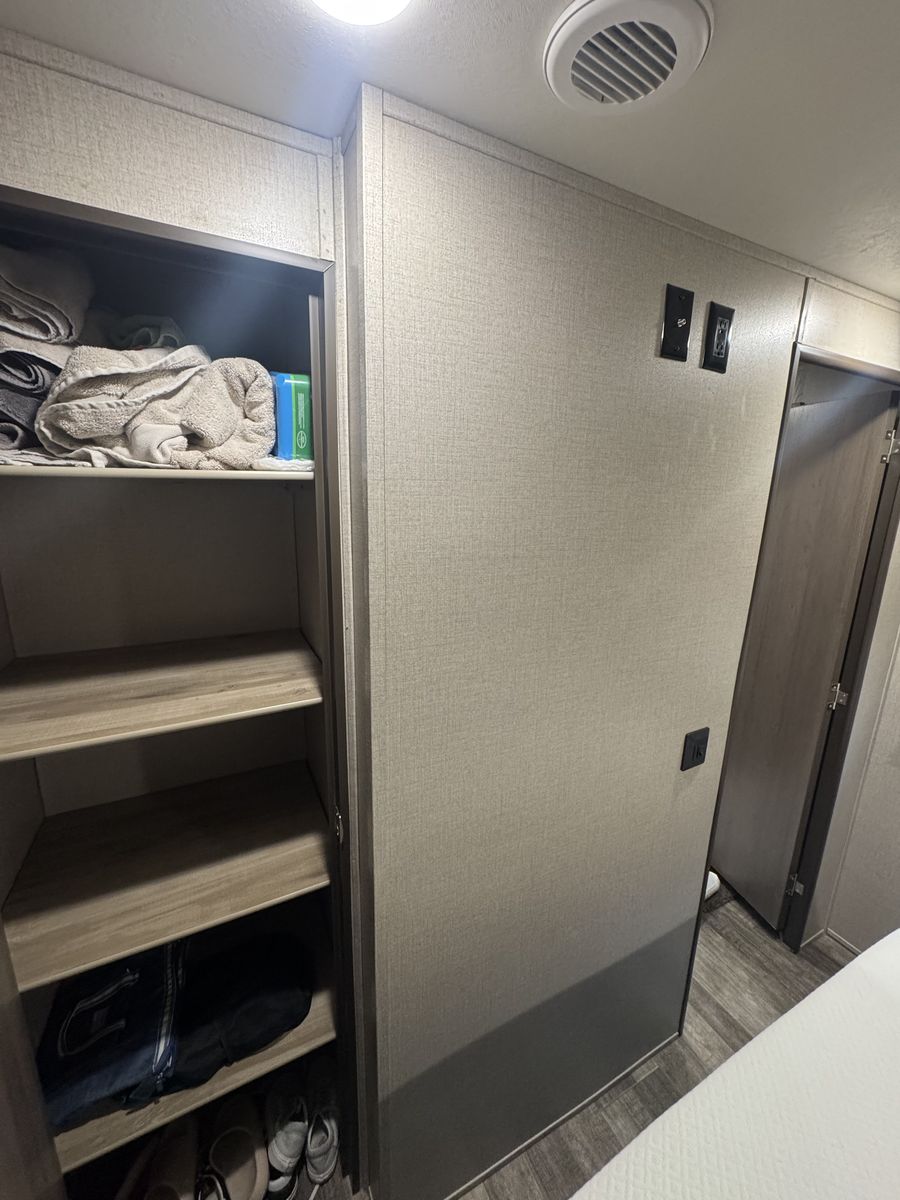 Queen bed in master with large closet area, double over double bunks in rear , u shaped dinette, entertainment center with fireplace, outdoor kitchen, lots of cabinet space with large panty, sleeps 9-10