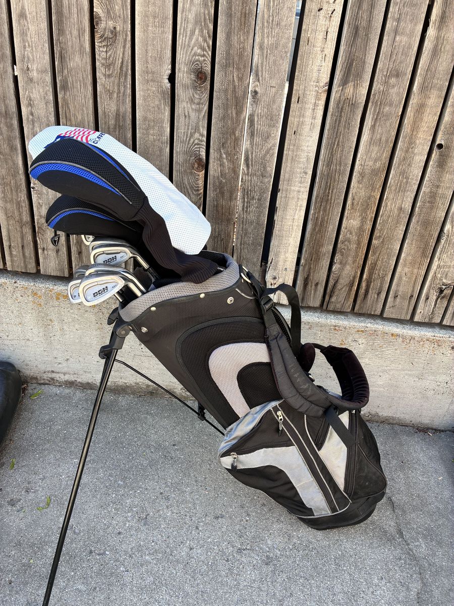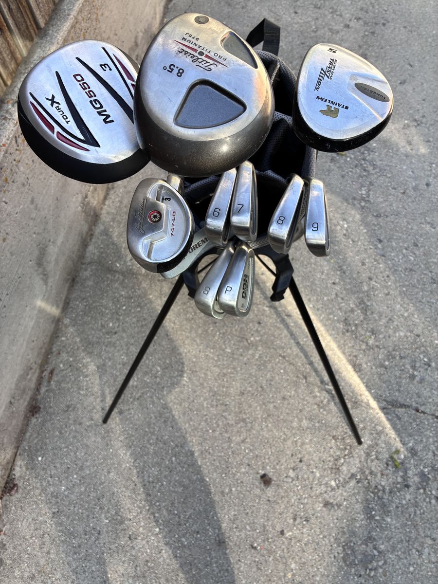 VenmoNice starter to intermediate set of men's standard length golf clubs for sale. Set includes Titleist driver, Tour X 3 wood, Nicklaus 5 wood and 3 hybri,d, Dunlop (Titleist style) stainless steel cavity back irons 5-sw, a blade putter, nice lightly used stand carry golf bag, golf balls, tees, ball markers etc. Set is ready to take to the range or course near you. Message or text Lorin 801-386-0027 if interested.