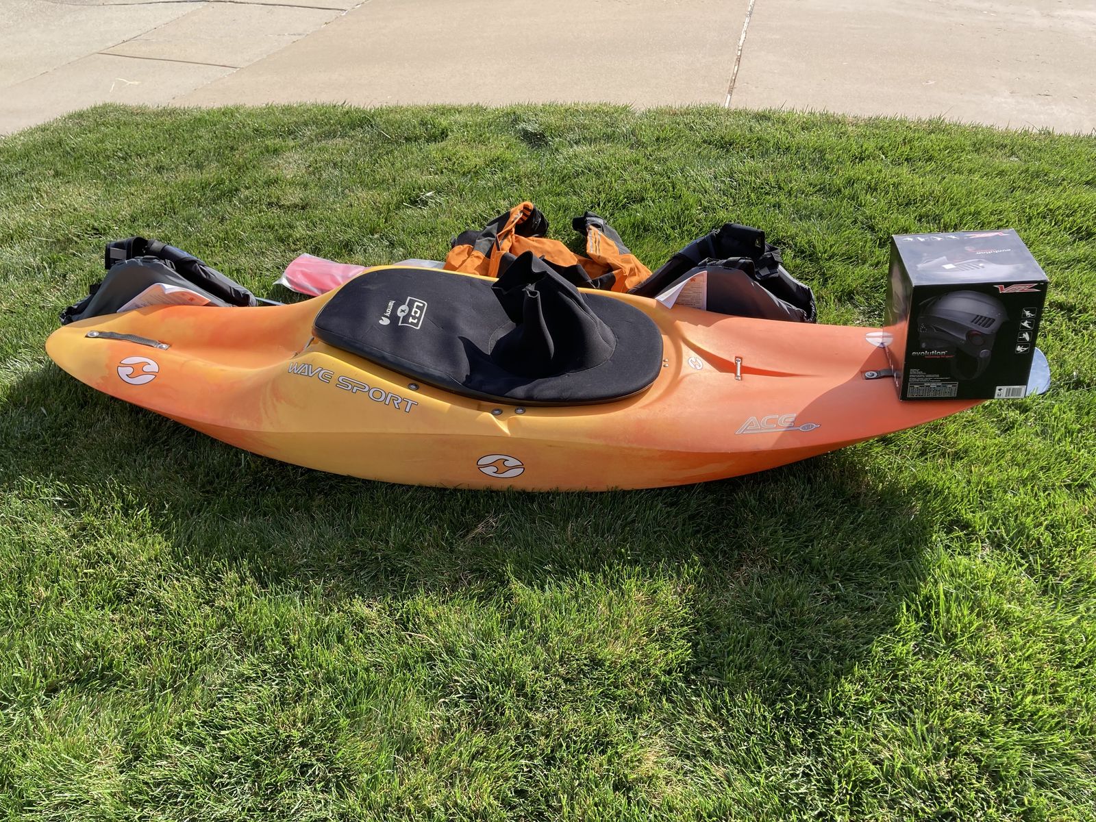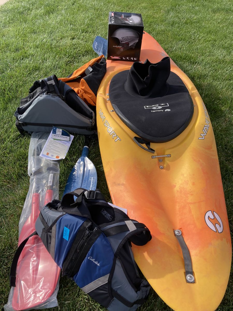 This is a new wave sport ace kayak in great condition. It includes a new evolution helmet. The skirt and the helmet are both mediums. It also includes two new Cabela's Stearns adult flotation devices that fit chest 44 to 46 inches for peopleover 90 pounds. There is an Adidas jacket and a used one piece paddle and a brand new two-piece paddle. It also includes the skirt. I am selling everything together and will not separate things.