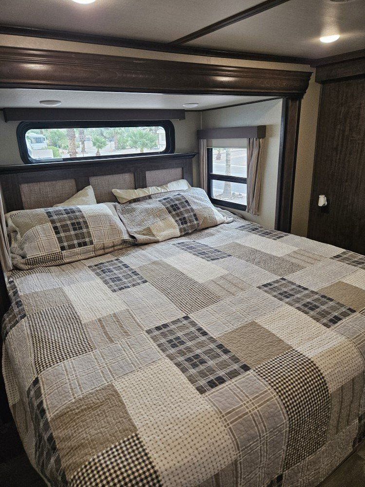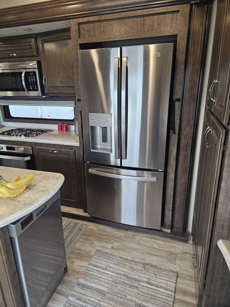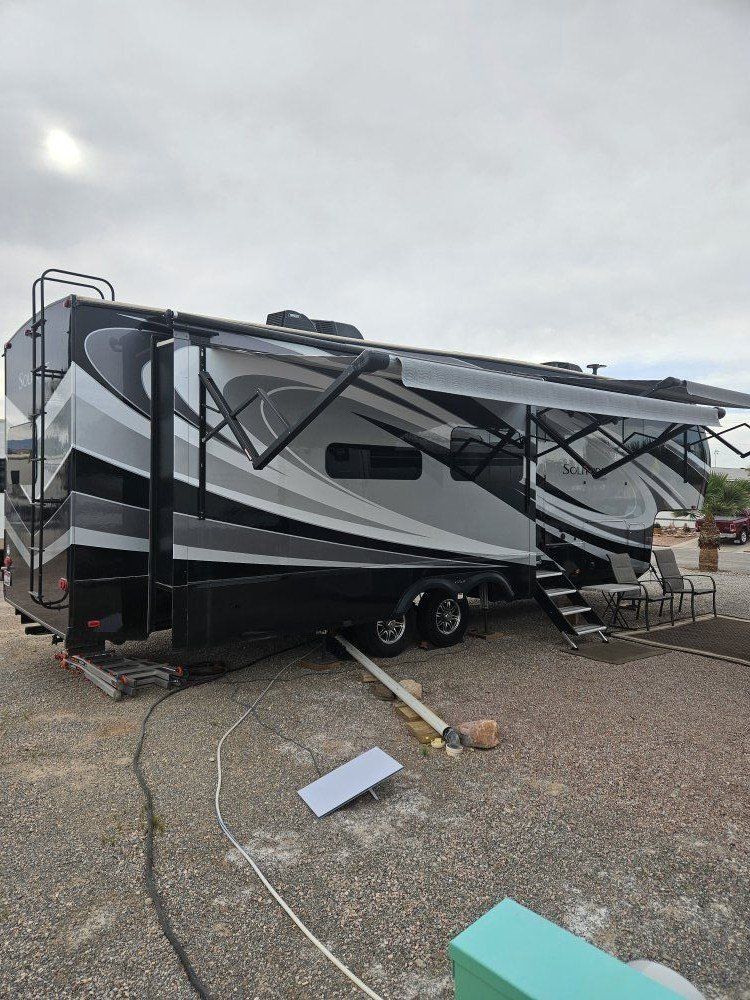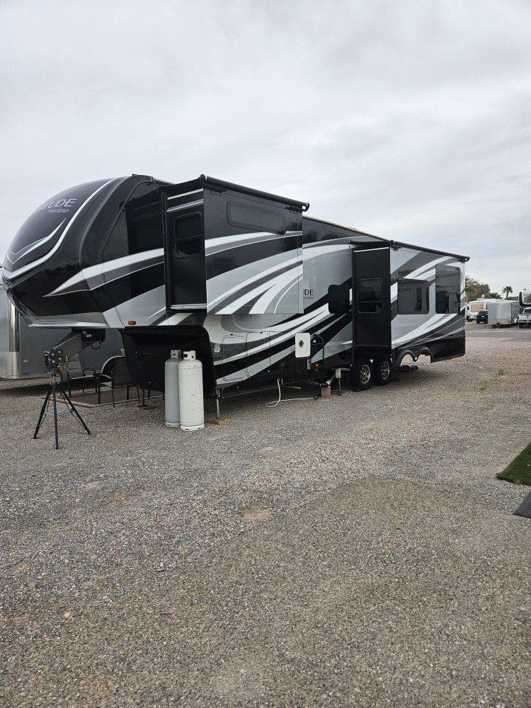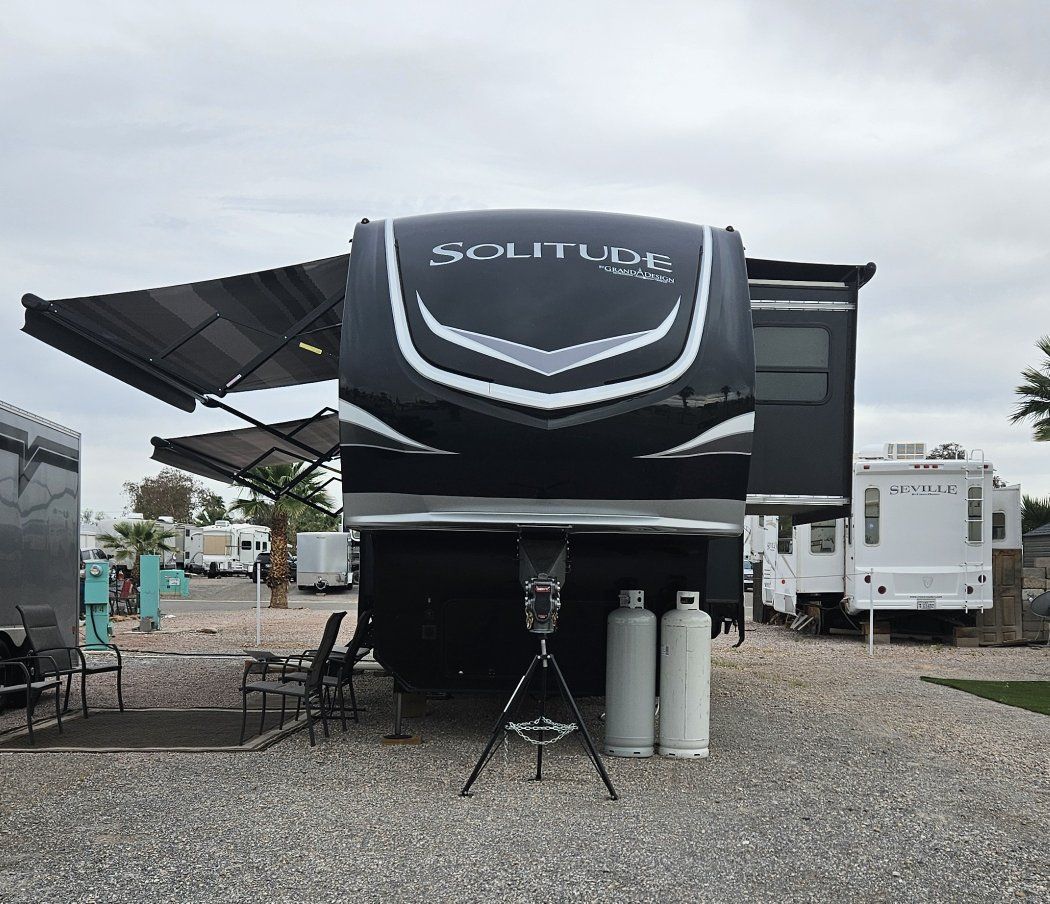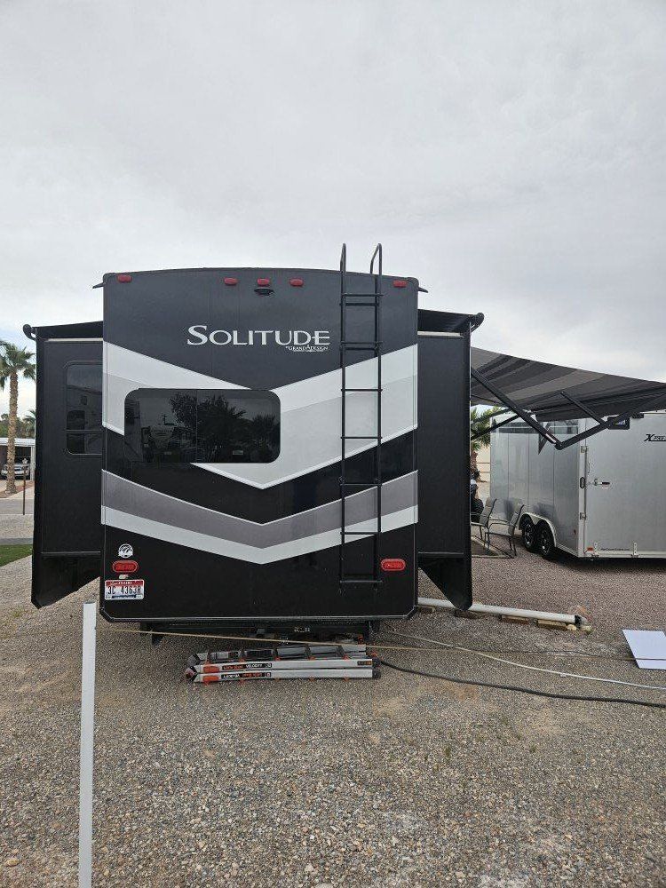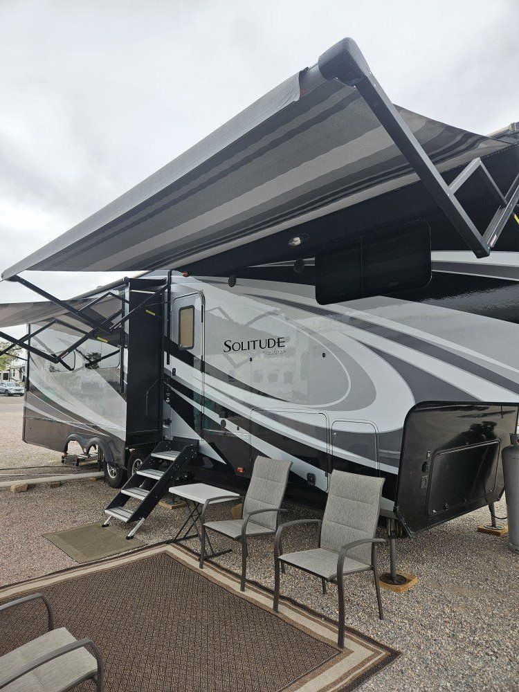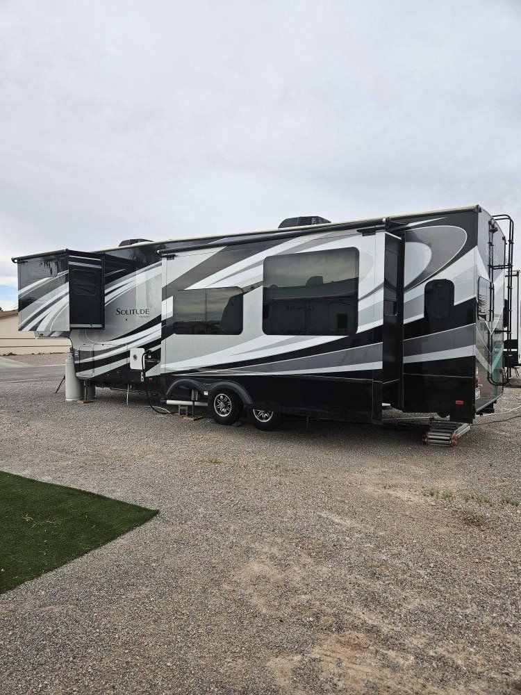 Very nice Solitude plus many upgrades. Built in 2018 (before covid) but stored inside and not used until fall of 24. Many upgrades including: new (2024 GE fridge), dishwasher, washer and dryer, on demand water heater (never run out) , 200 amp hrs nicad batteries, GenY hitch plus tow hitch on back, extra solar panels (enough to run the fridge and lights). Factory installed Cummin/Onan generator with less than 5 hrs on it (runs on the propane system). It has custom factory full body paint. No decals to fade and crack. Fire place, 2 tv's (main TV is retractable for counter space if desired). The love seat is electric reclining with heat and message. Sofa folds out for extra sleeping space. King size bed with lift up storage under and end pull out for storage or clothes hamper. Large closet with built in pocket shelves. 2 matching chairs for dining (currently stored under bed) if needed. Entertainment system with inside and outside speakers. We use it mainly inside with TV. Out side shower hookup. Pass through storage outside. EZ flush hose connection for cleaning holding tank. 14 ply tires(less than 5000 miles) with custom aluminum rims. It has only been used 2 seasons in Southern Nevada and otherwise stored inside a secure building. $67,995 OBO only selling because we like it so much here we built a house.