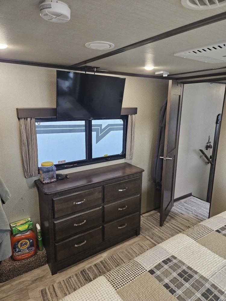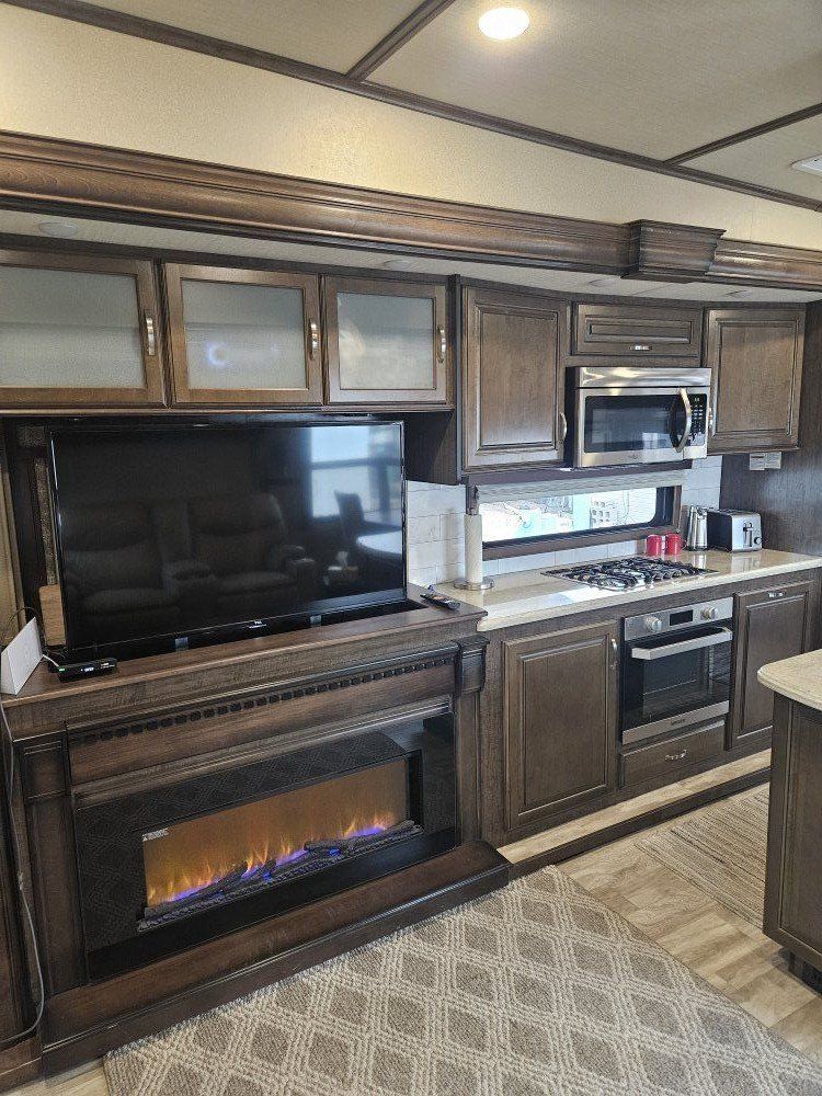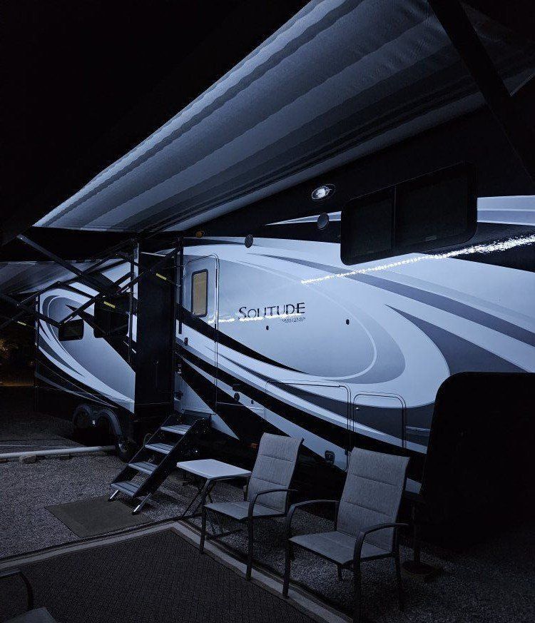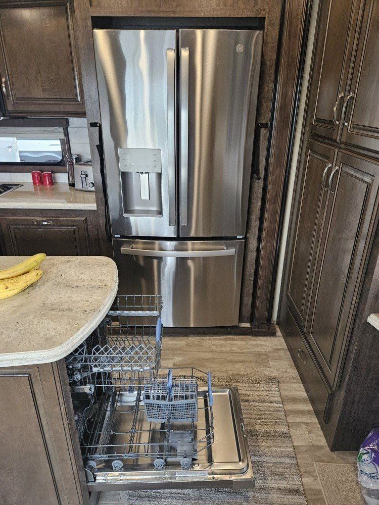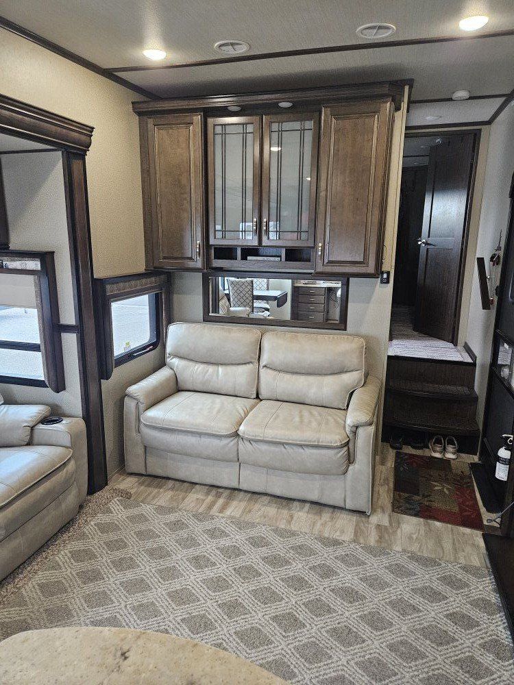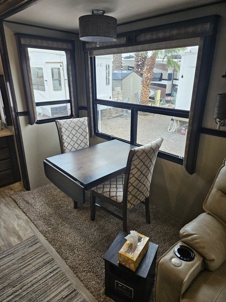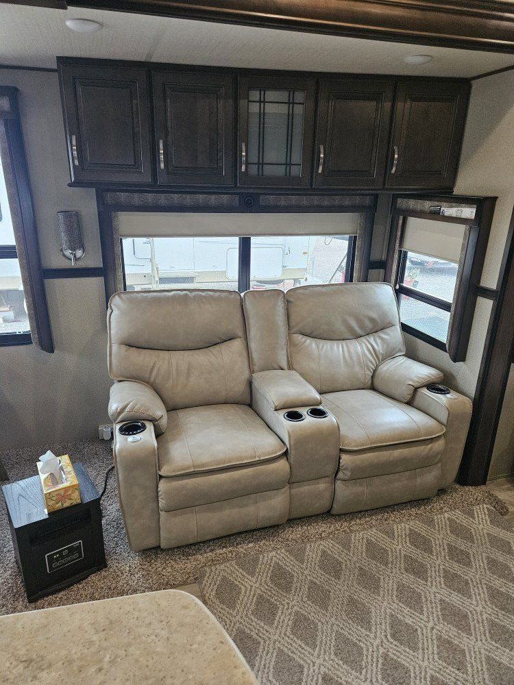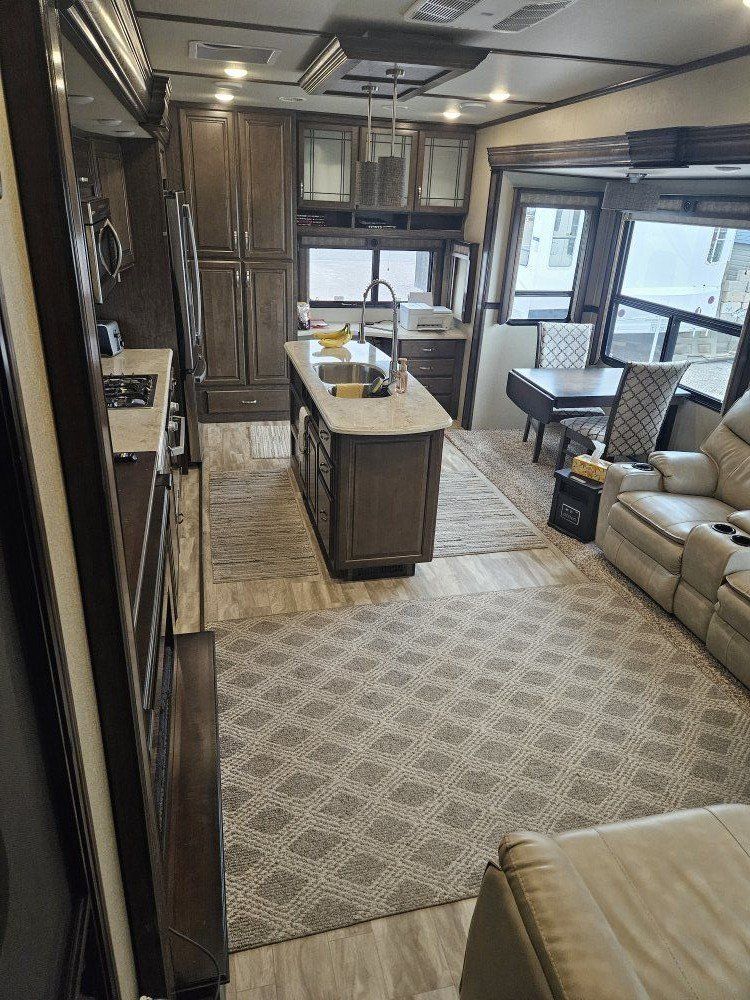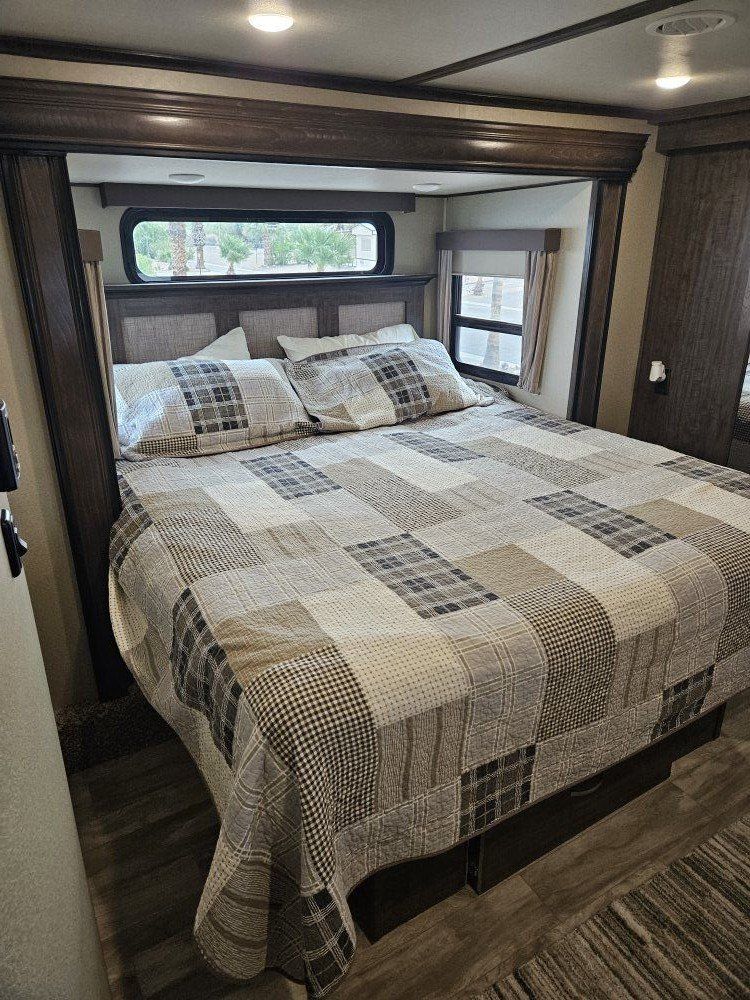 Very nice Solitude plus many upgrades. Built in 2018 (before covid) but stored inside and not used until fall of 24. Many upgrades including: new (2024 GE fridge), dishwasher, washer and dryer, on demand water heater (never run out) , 200 amp hrs nicad batteries, GenY hitch plus tow hitch on back, extra solar panels (enough to run the fridge and lights). Factory installed Cummin/Onan generator with less than 5 hrs on it (runs on the propane system). It has custom factory full body paint. No decals to fade and crack. Fire place, 2 tv's (main TV is retractable for counter space if desired). The love seat is electric reclining with heat and message. Sofa folds out for extra sleeping space. King size bed with lift up storage under and end pull out for storage or clothes hamper. Large closet with built in pocket shelves. 2 matching chairs for dining (currently stored under bed) if needed. Entertainment system with inside and outside speakers. We use it mainly inside with TV. Out side shower hookup. Pass through storage outside. EZ flush hose connection for cleaning holding tank. 14 ply tires(less than 5000 miles) with custom aluminum rims. It has only been used 2 seasons in Southern Nevada and otherwise stored inside a secure building. $67,995 OBO only selling because we like it so much here we built a house.