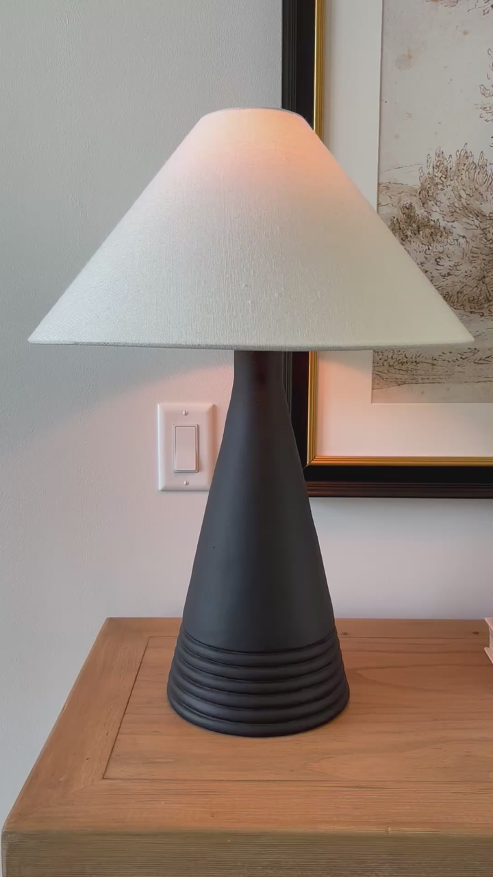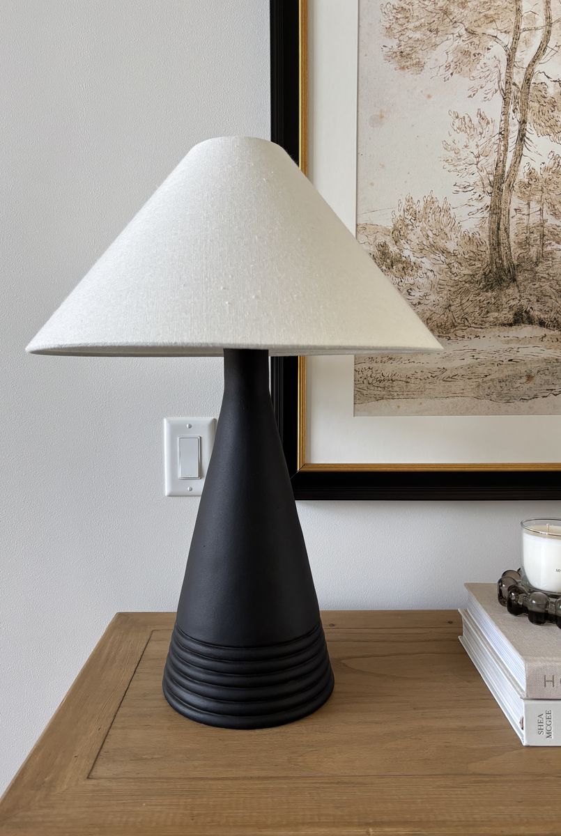This stylish Target Threshold lamp features a textured black base with a tapered (empire-style) white shade. It has a clean, modern look that works well in living rooms, bedrooms, or offices. Includes an on/off switch and comes ready to use.