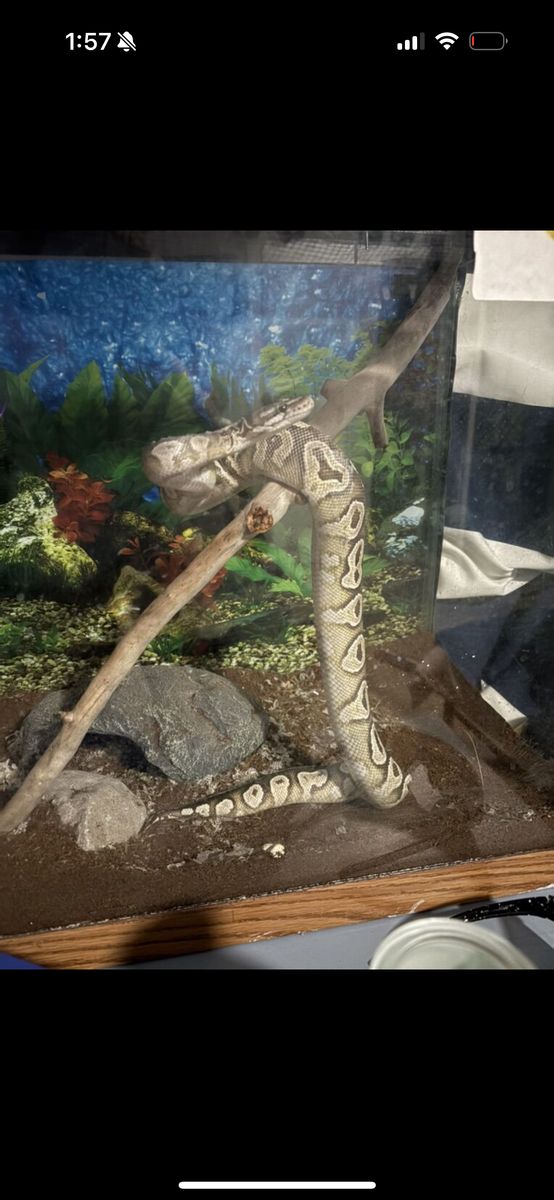 VenmoI don’t have the time or money to take care of her anymore. She has a problem with her shedding and needs proper care. Incudes the enclosure (not sure what size) heating lamp, lighting lamp, and everything in enclosure so basically everything needed but food. 3 years old female - eats live mice