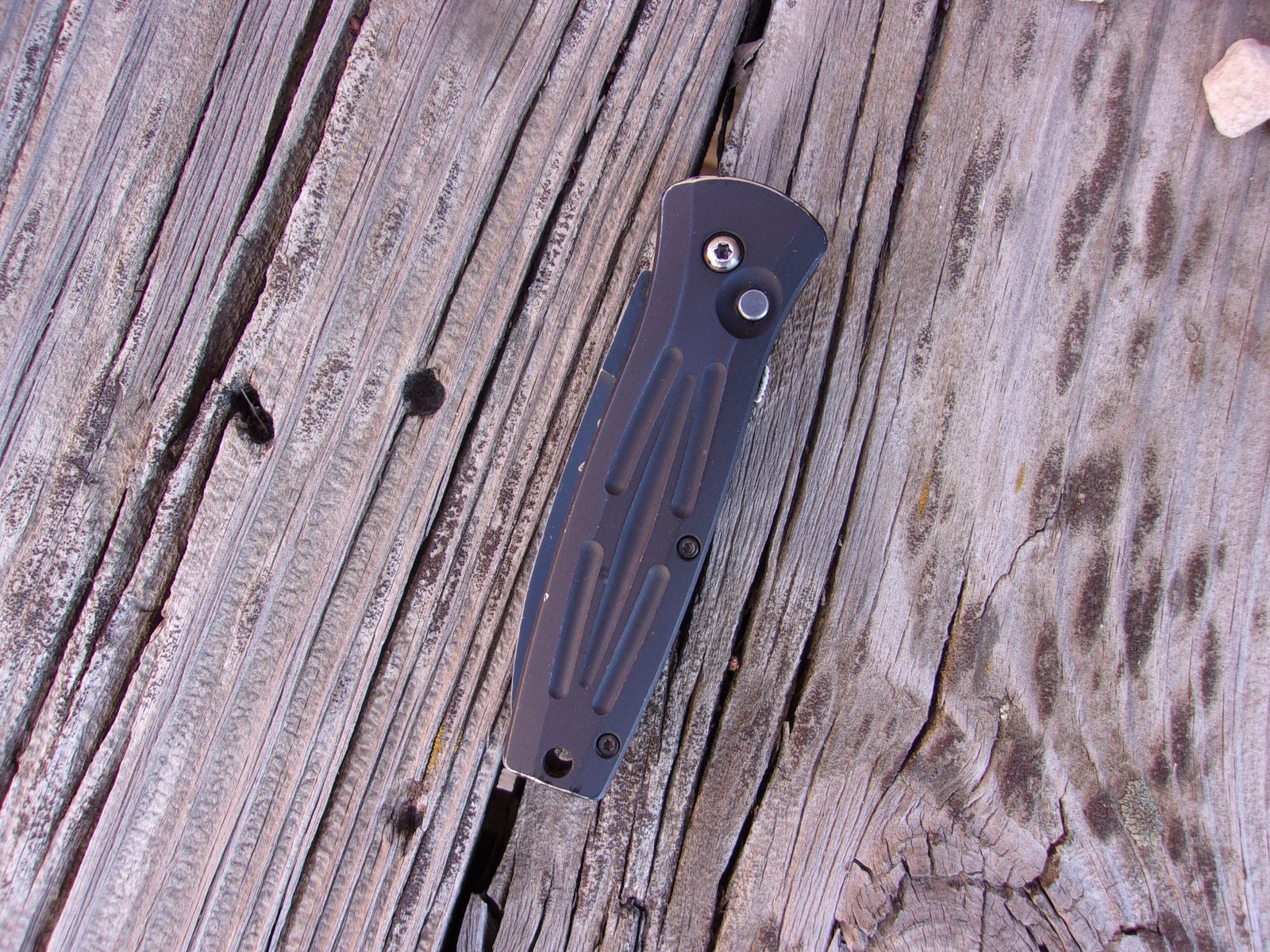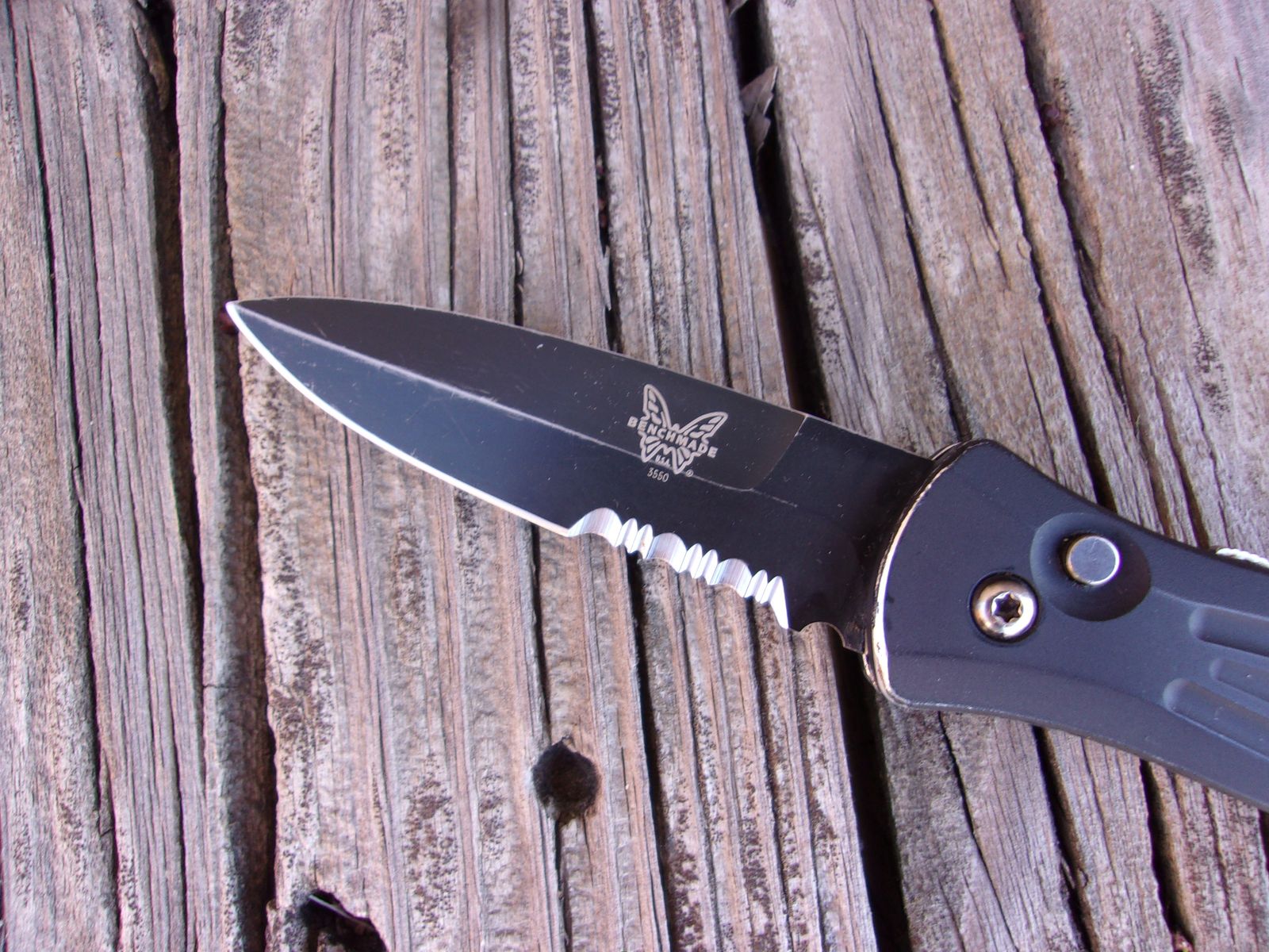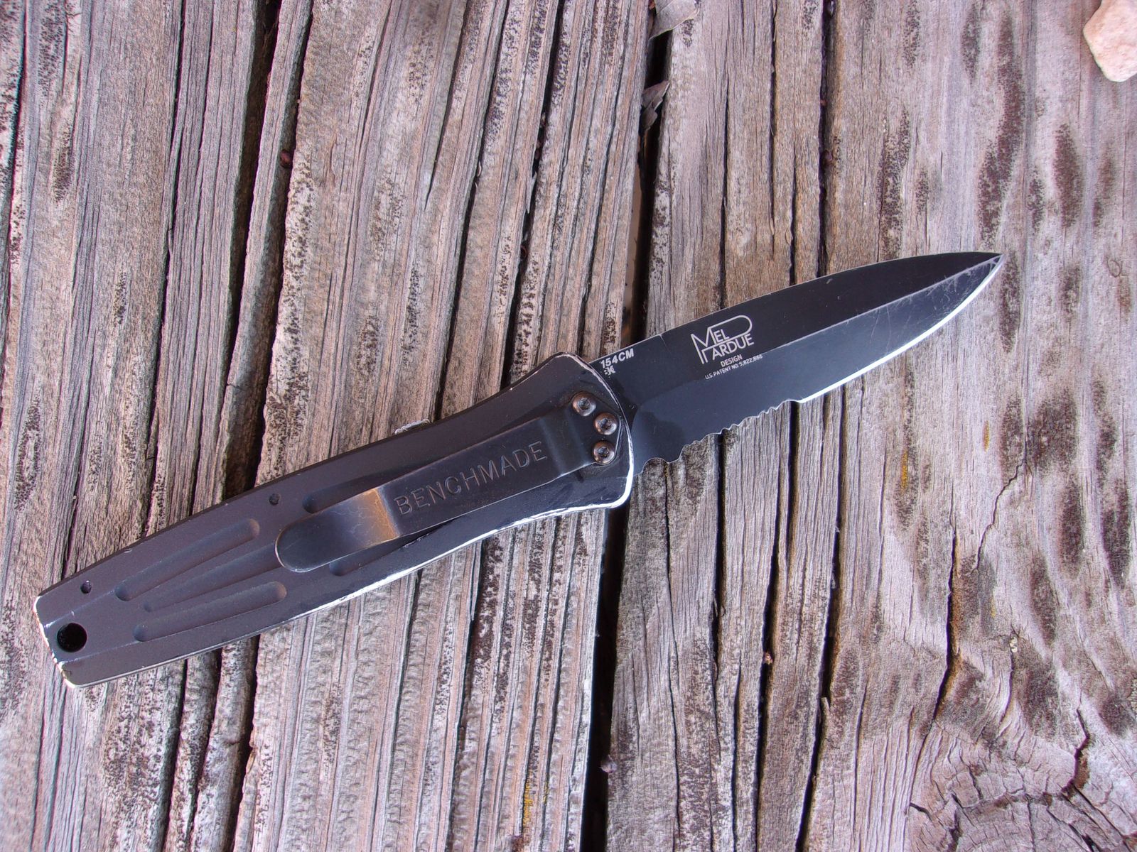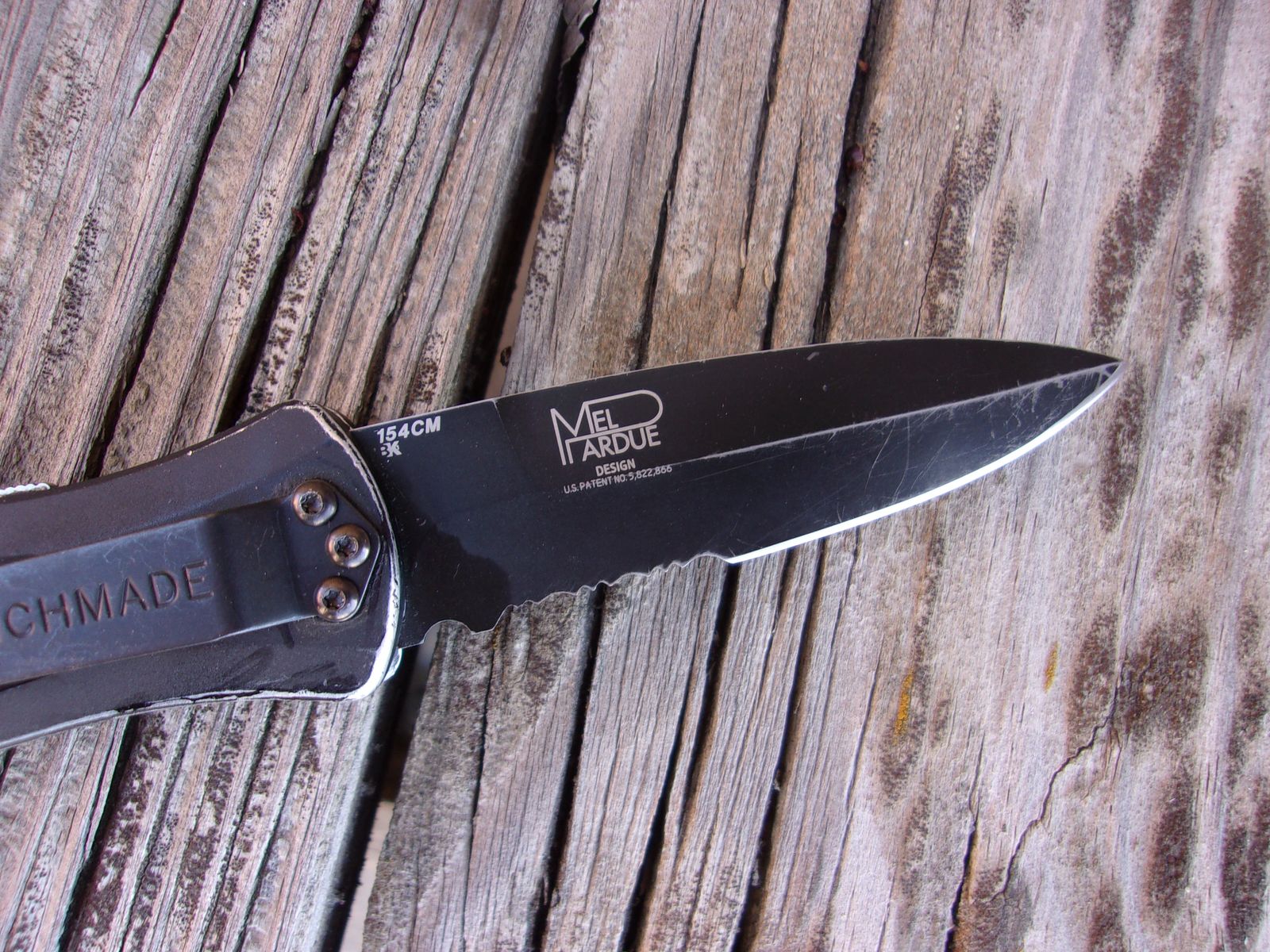The Mel Pardue Benchmade 3550 knife has a 154-CM combo blade which snaps out quickly. It is extremely slim and makes for a good carry knife. The handles have a great feel and grip. They are black anodized T-6 aluminum. This all-around great knife also has a sliding safety that works nice, and smooth.