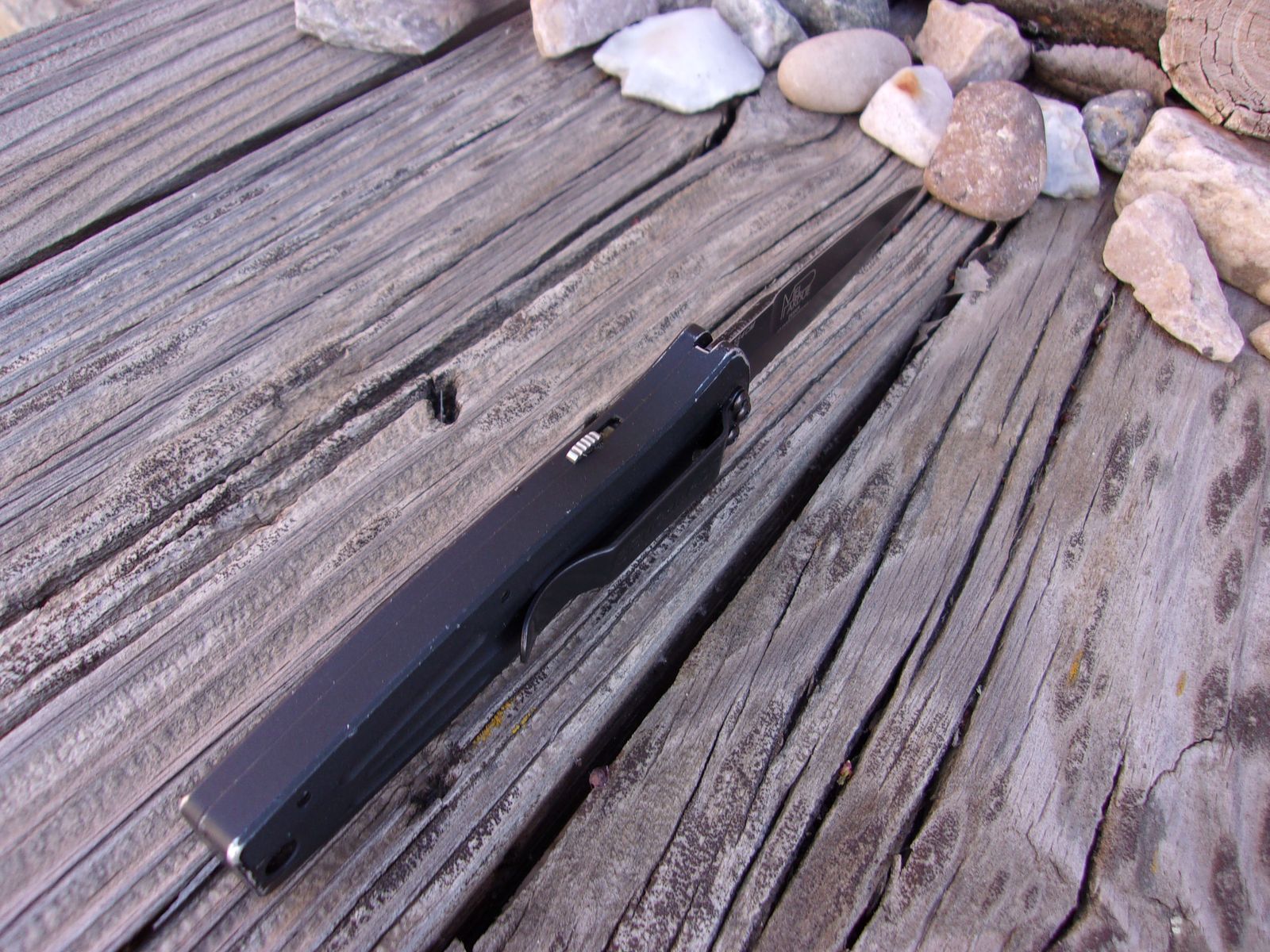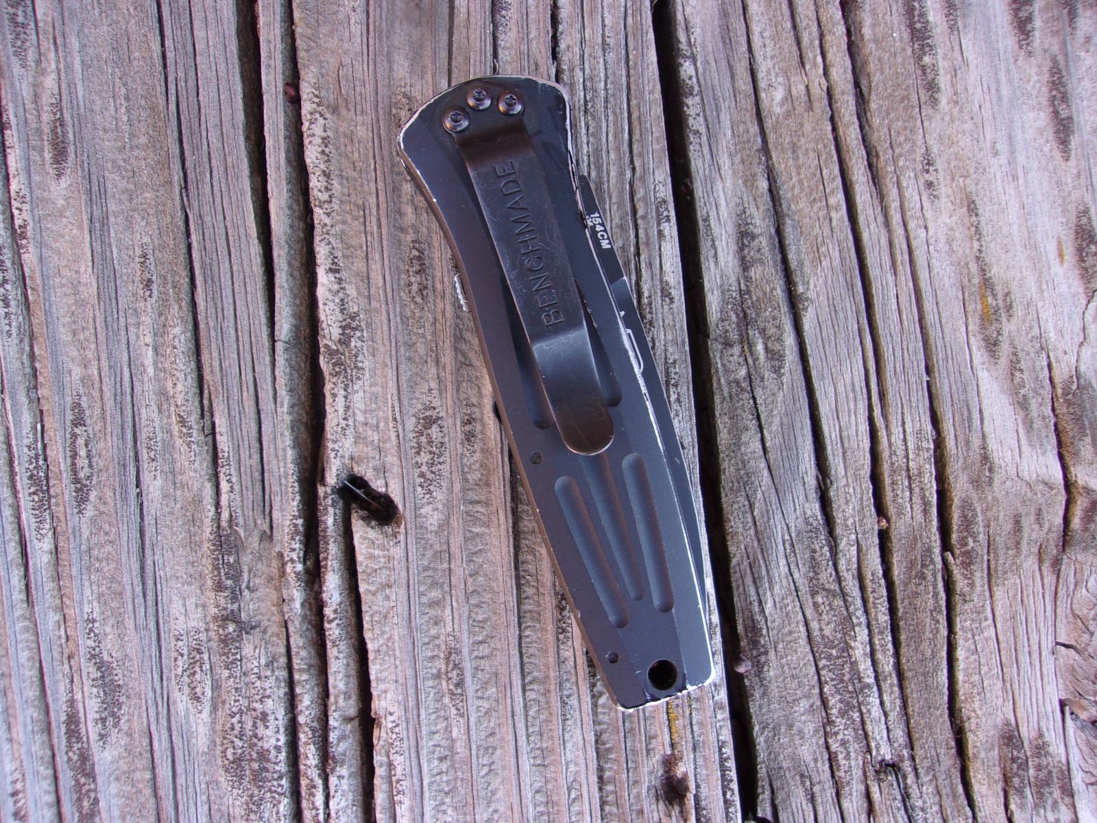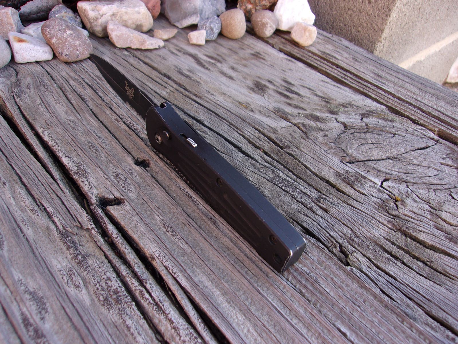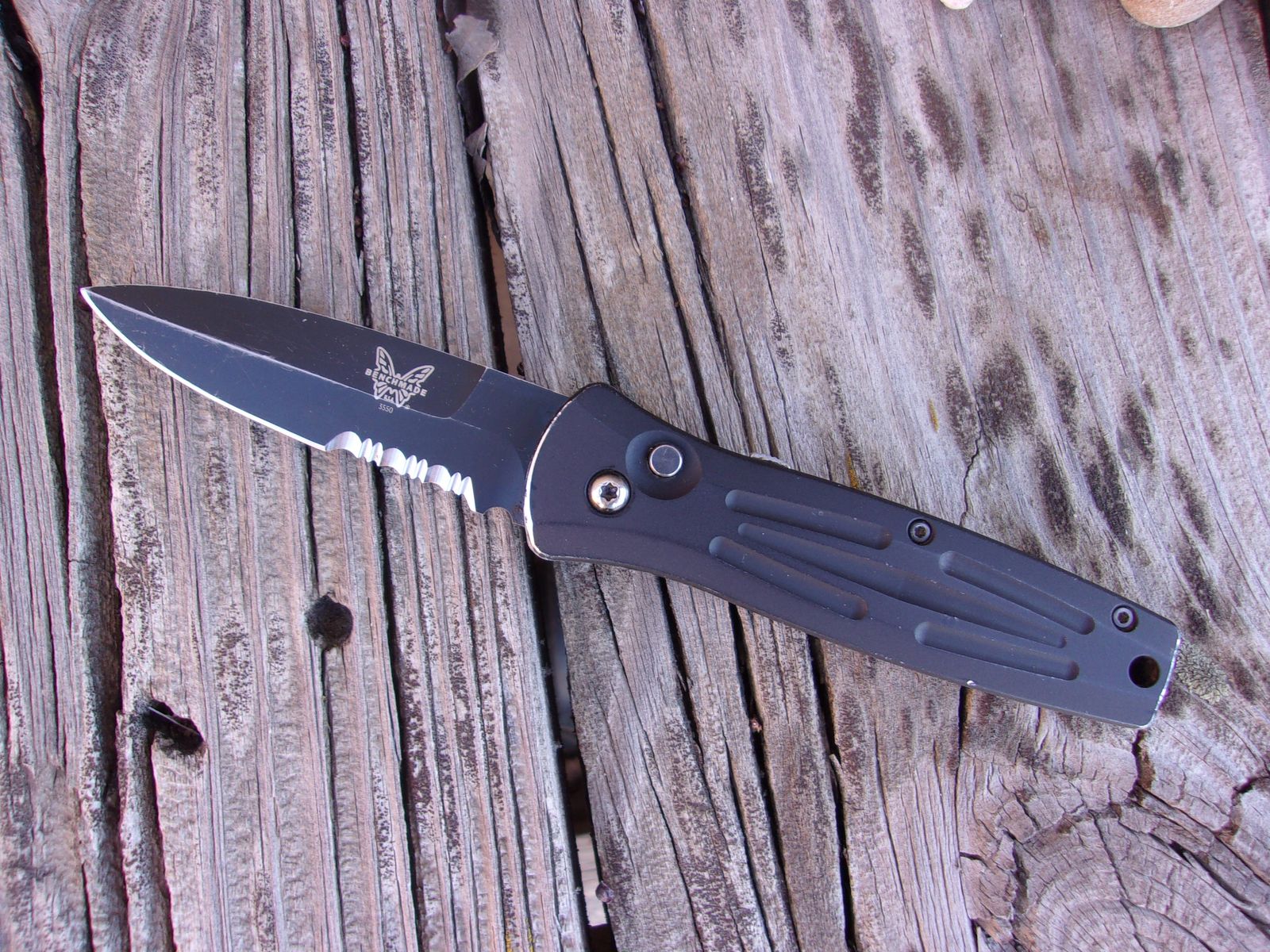 The Mel Pardue Benchmade 3550 knife has a 154-CM combo blade which snaps out quickly. It is extremely slim and makes for a good carry knife. The handles have a great feel and grip. They are black anodized T-6 aluminum. This all-around great knife also has a sliding safety that works nice, and smooth.