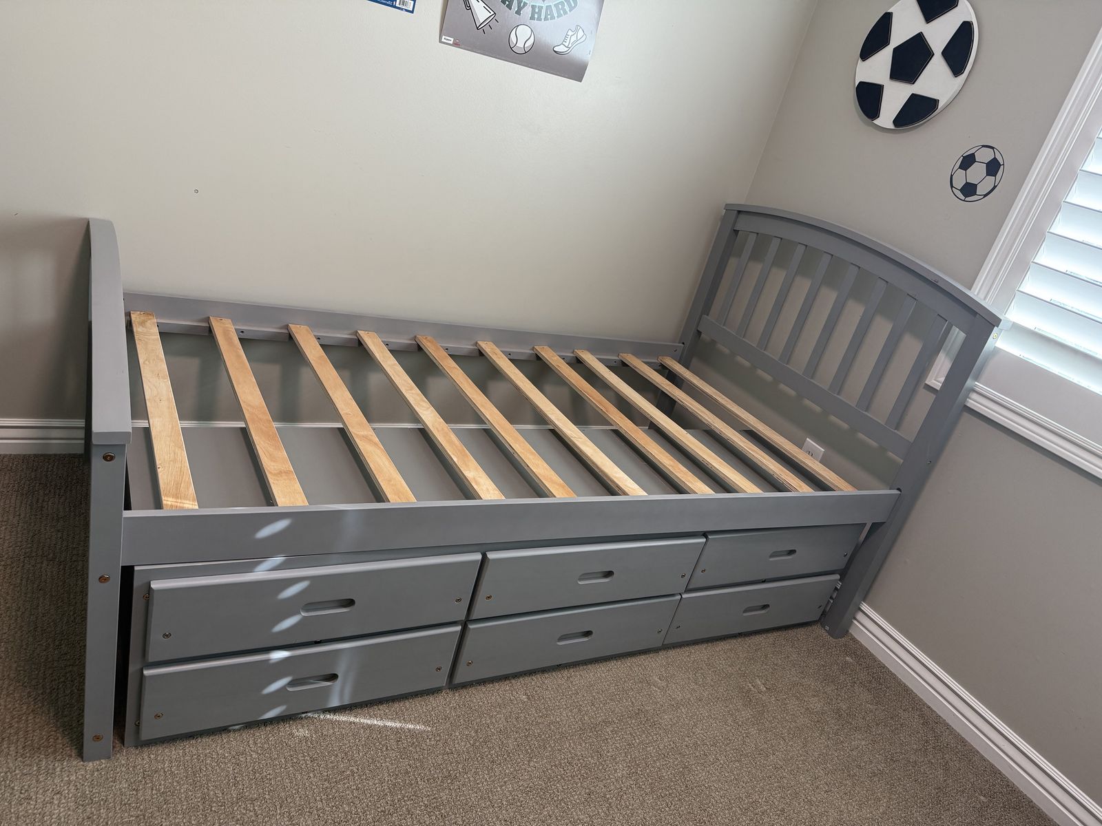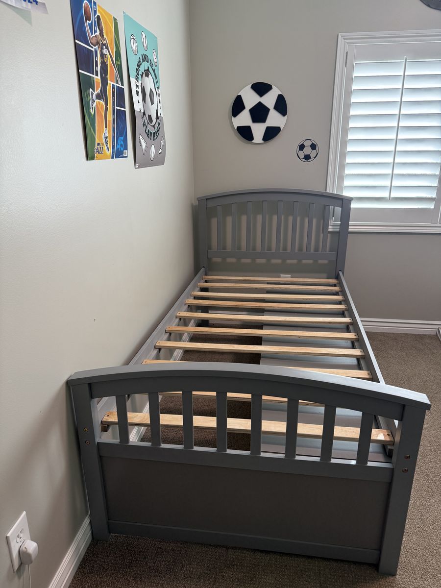 I have two of these awesome grey twin beds that come with six drawers of storage underneath! Our boys got their own rooms with bigger beds so we no longer need them. In excellent shape and you can have the mattresses with them as well. $100 each bed. I included the Amazon pics as well.