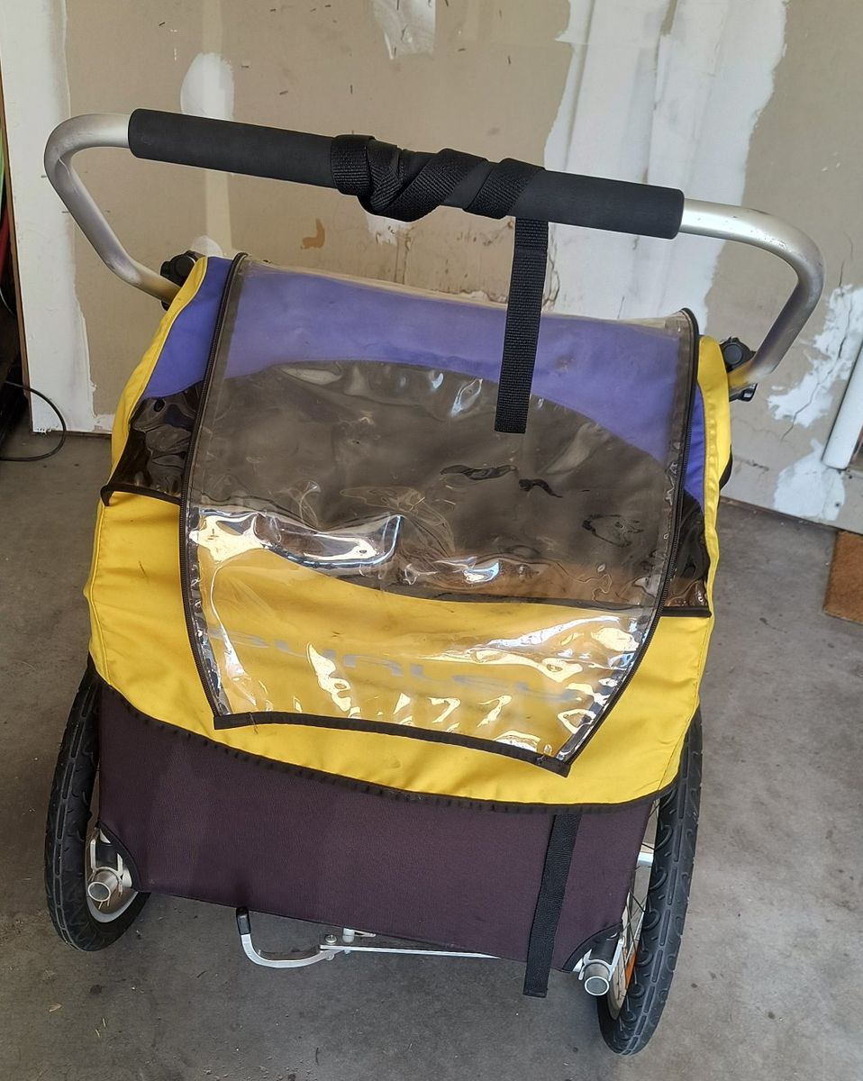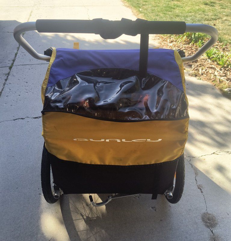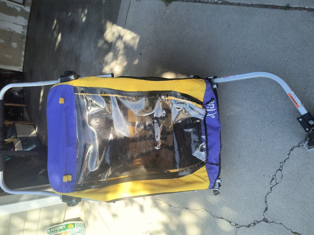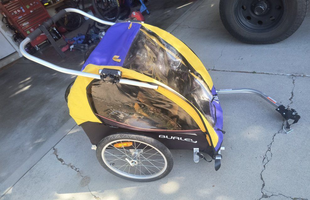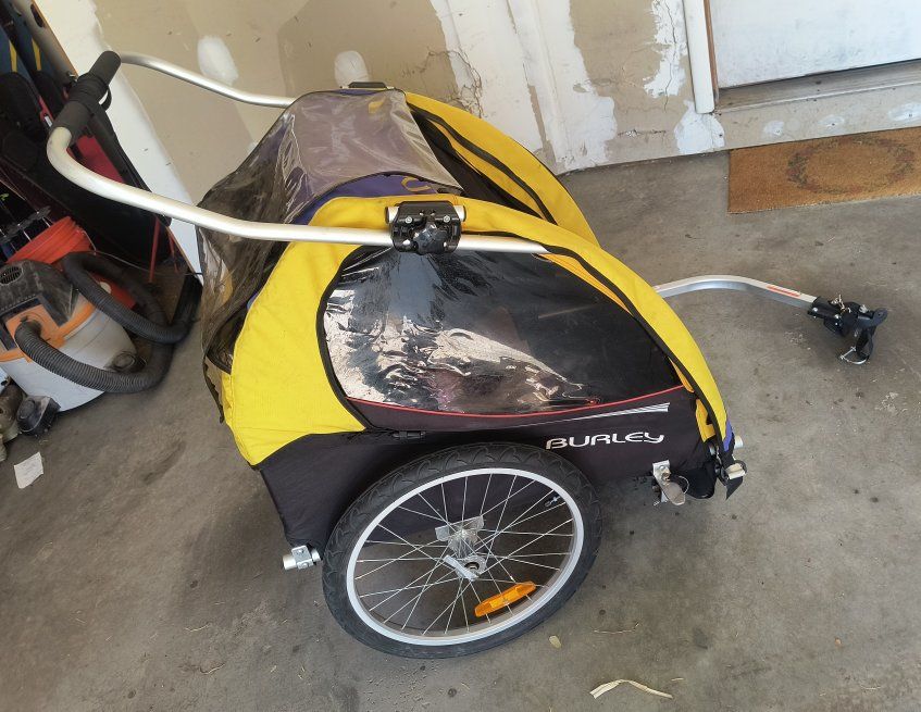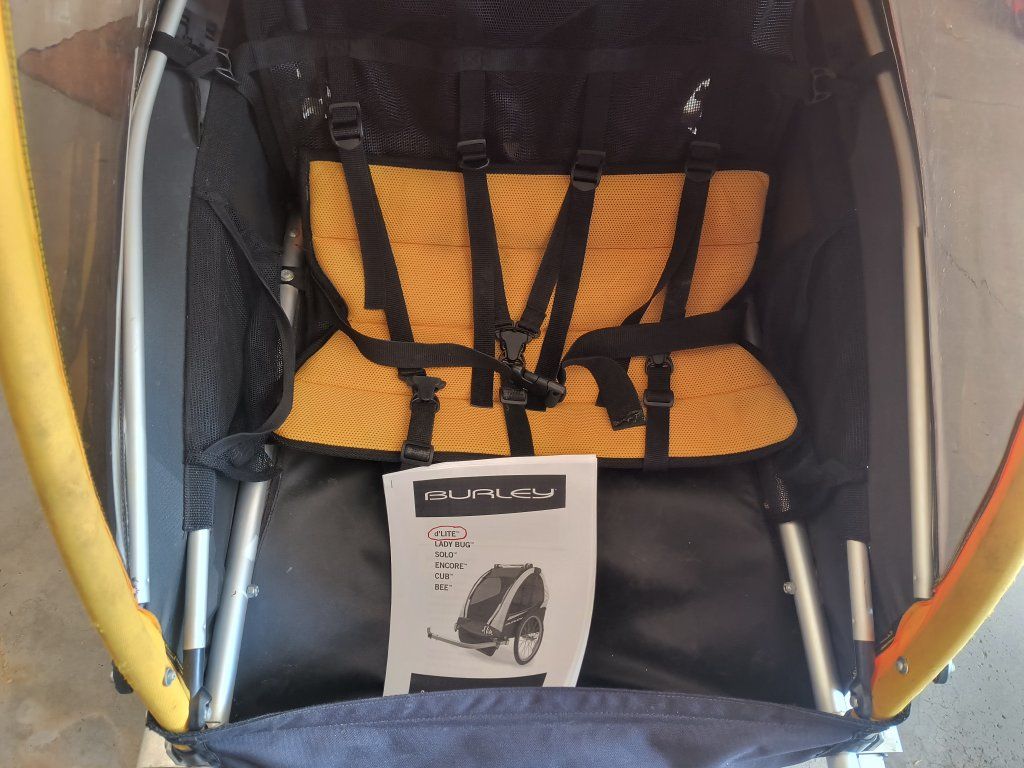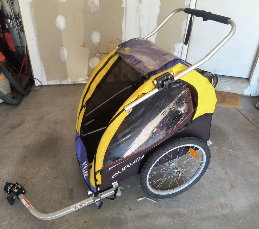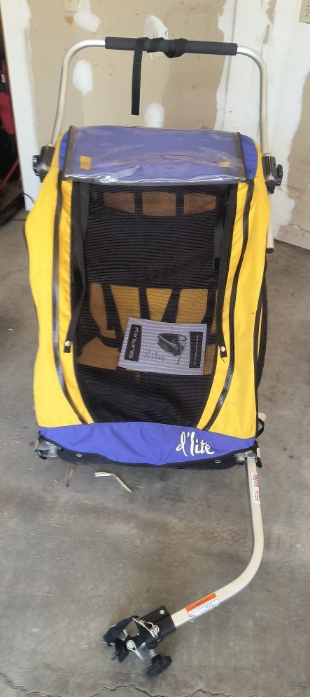 Used Burley d'lite bicycle trailer / stroller. 1 or 2 seat capable. Good overall condition. Hasn't been used in several years. Brand new tubes put in the tires on March 28. Comes with the standard (12mm qr quick release) axle hitch mount. Other options can be purchased from Burley: