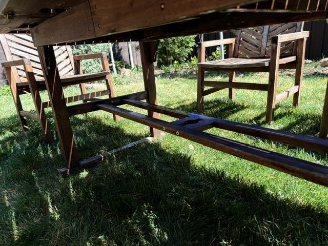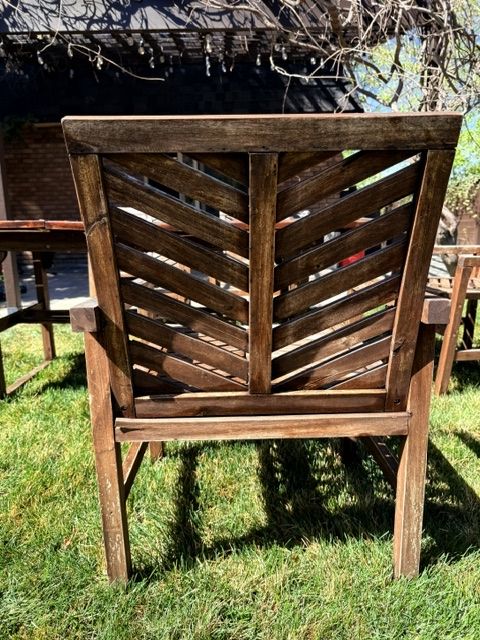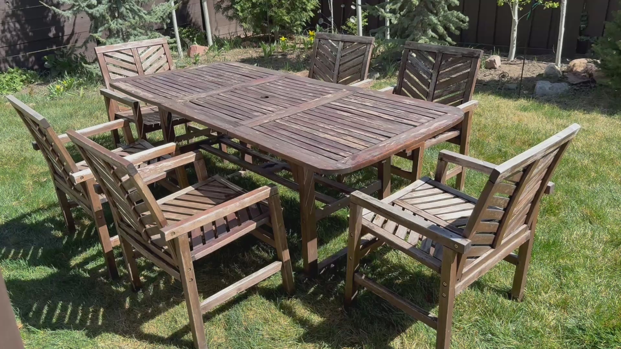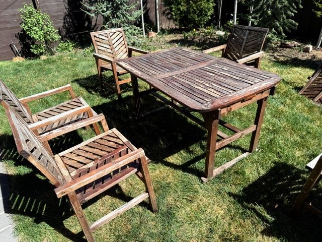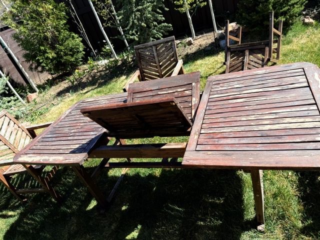 This acacia wood set designed for durability and outdoor use. It features an extendable table with a butterfly leaf, making it great for both everyday use and hosting gatherings.