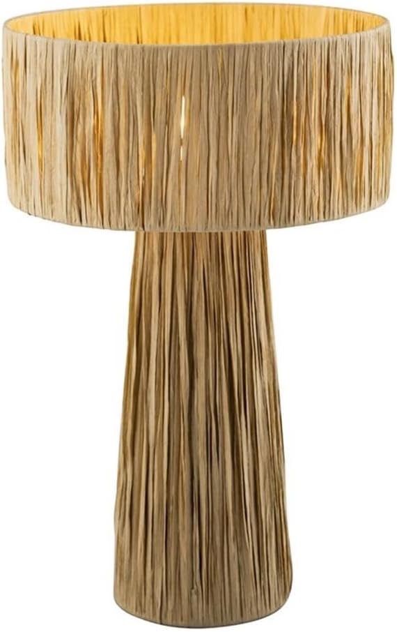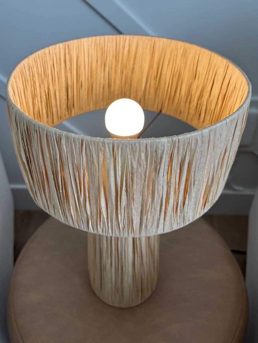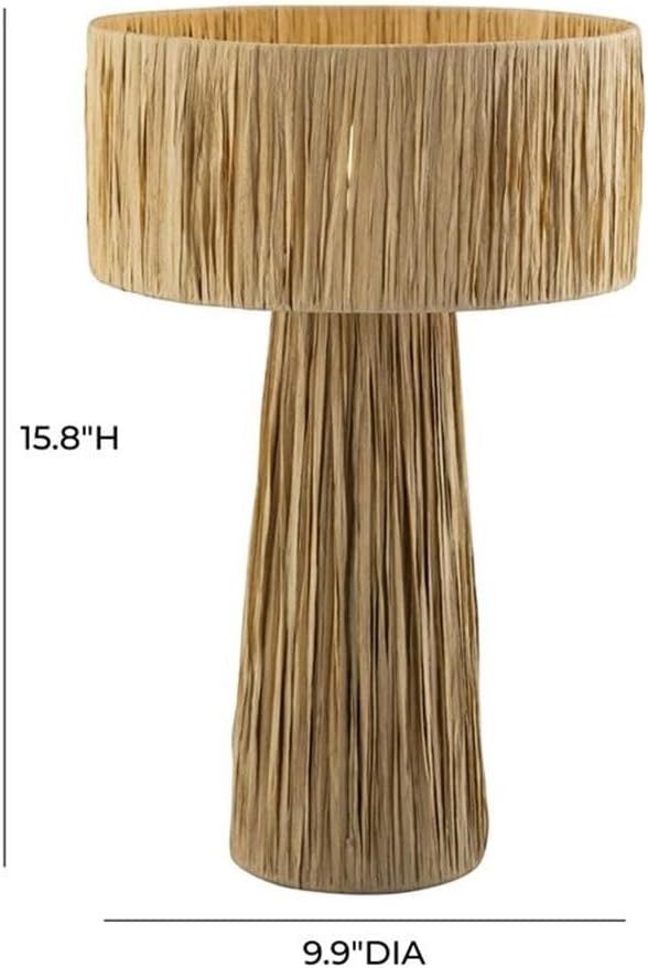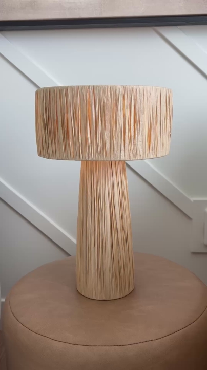 Cute safari-chic table lamp with a handwoven natural raffia shade and sturdy iron base. Perfect small-scale accent lamp for nightstands, side tables, desks, or shelves. Adds nice texture and a coastal/boho touch to any room.
