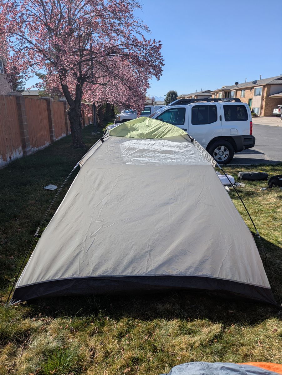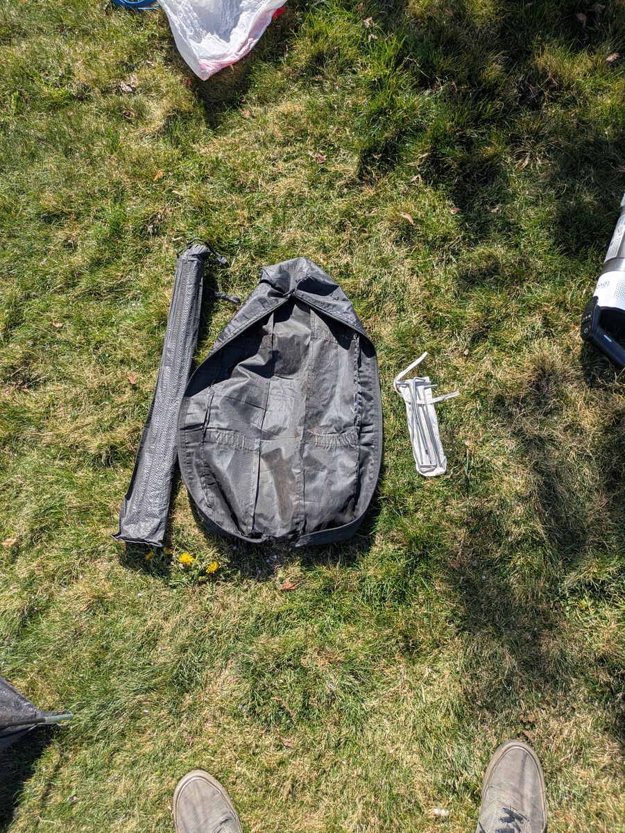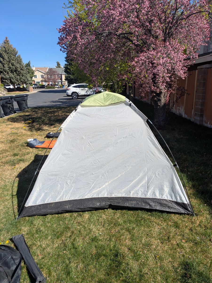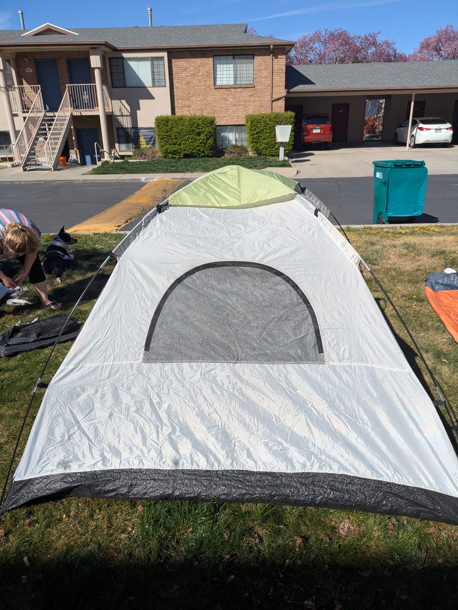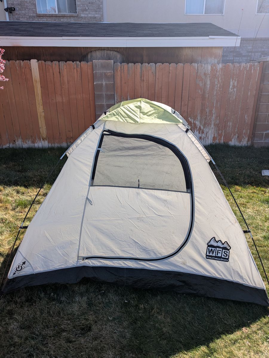 VenmoCamping tent, sleeps 2 with fiberglass poles, rain fly, stakes, and storage bags. Zipper on main storage bag has some damage to end, causing zipper to run off if not careful. Otherwise, nothing wrong with tent, we just out grew it.