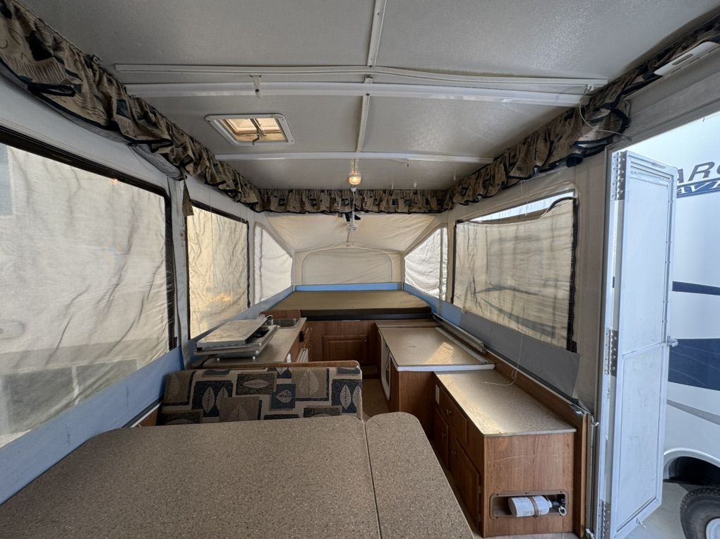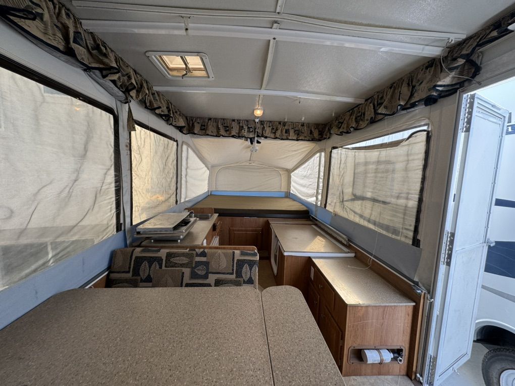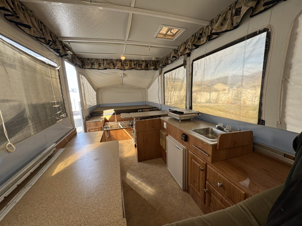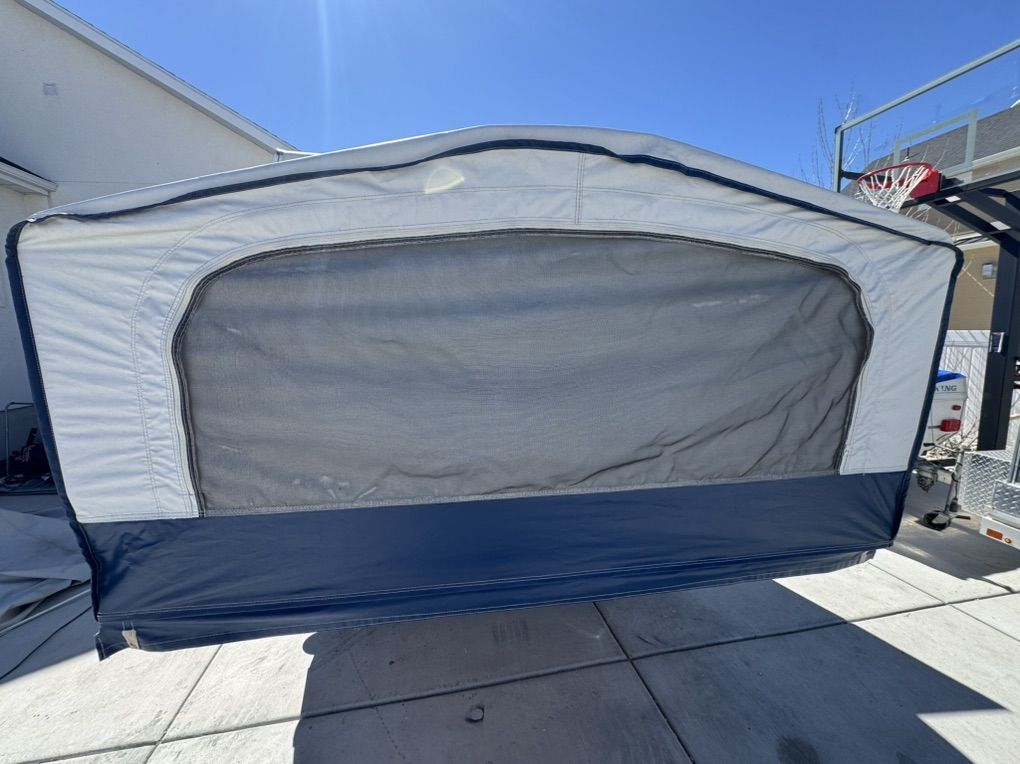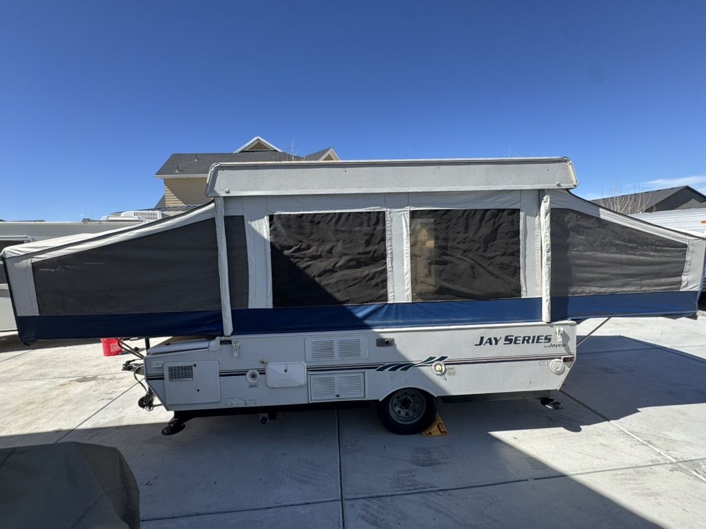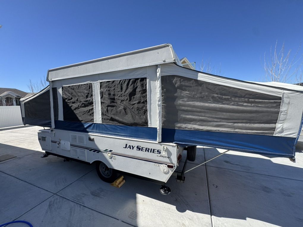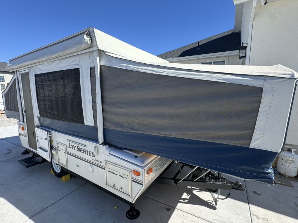 VenmoMint Jayco 1008 popup Jayco builds one of the most solid maintenance and trouble free popups you can get- this is in Very nice shape and has been garaged or covered the majority of the time since new. Fully loaded model Full bathroom/shower enclosure huge king bed up front. Double bed in rear, Plus a table that folds to a twin bed Outside shower/inside shower Tons of storage - huge durable storage box up front for gear that is in perfect condition with secure latches canvas and screens are in amazing condition No pets or smoking All curtains on excellent shape Roof is in perfect like new condition it has never leaked and the solid built storage box is in outstanding shape and will hold up for many years unlike most that are cracked or leak 19k btu Thermostat controlled heater. Co2 detectors Bunk overhead lights/fans Comes loaded with camping supplies water hoses Two 5g propane tanks brand new $400 toilet holding tank just installed today- brand new/empty Tires and spare are in excellent condition Electric brakes Bearing buddies on the axles for quick servicing- no need to pack bearings! The crank is smooth and and effortless a child could raise it up and the beds slide very smoothly.