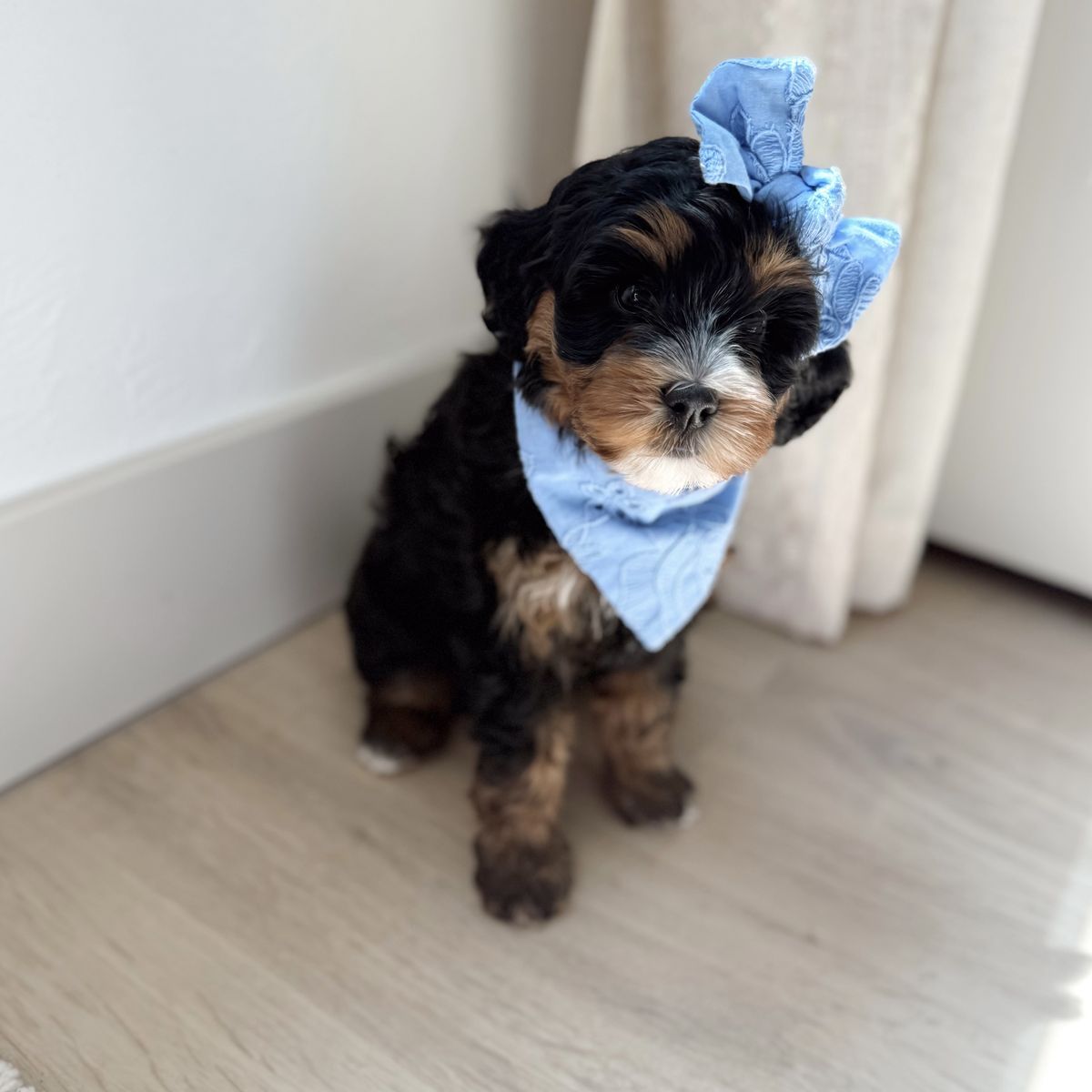 About Moby: Moby is sweet, goofy, easy-going and just the perfect amount of lazy. He has insane genetics for a bernedoodle with a gorgeous coat and one blue eye. Genetic/health tested
