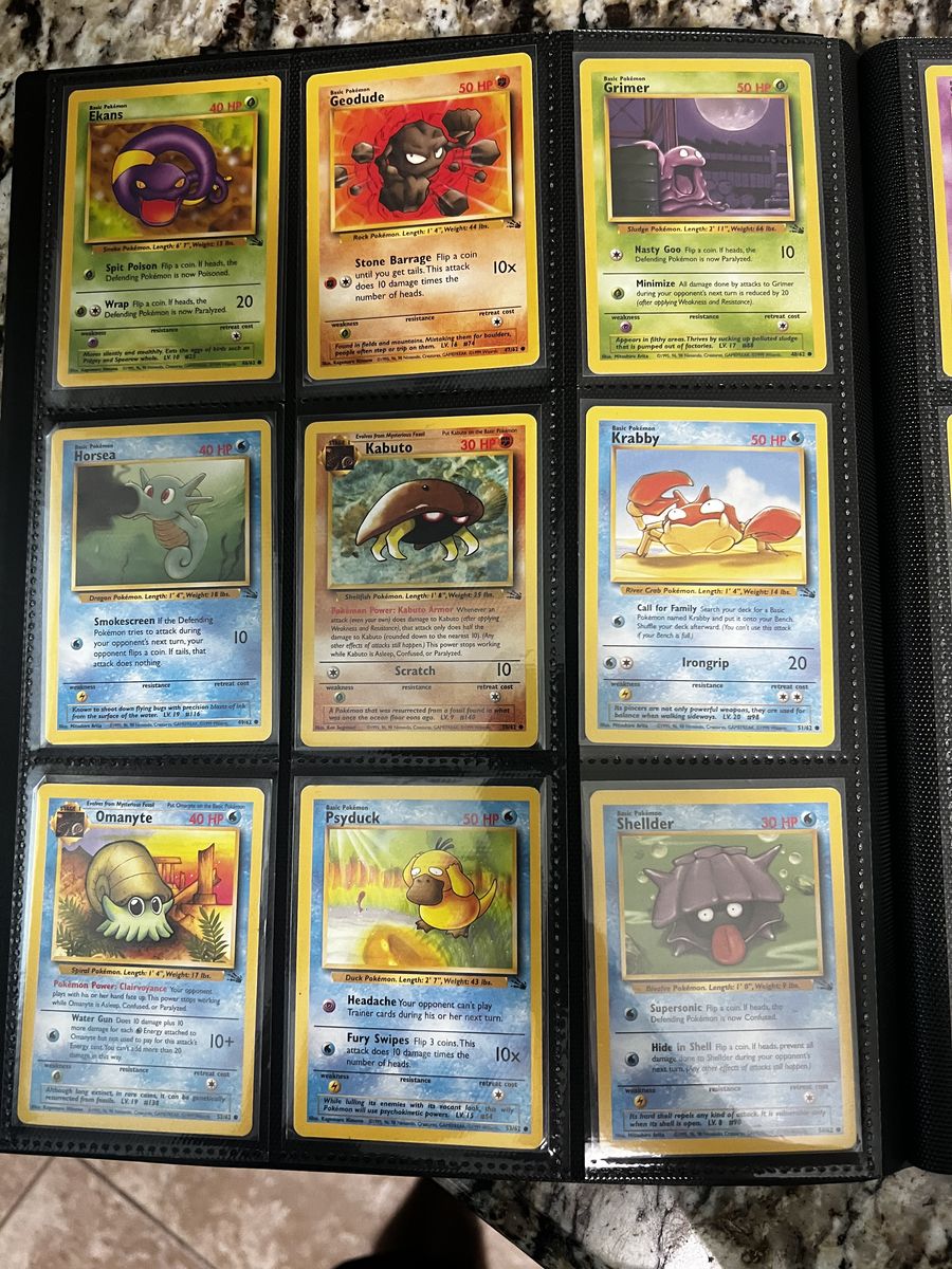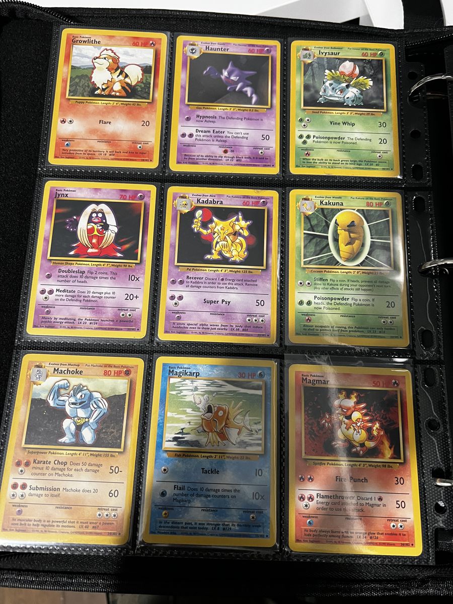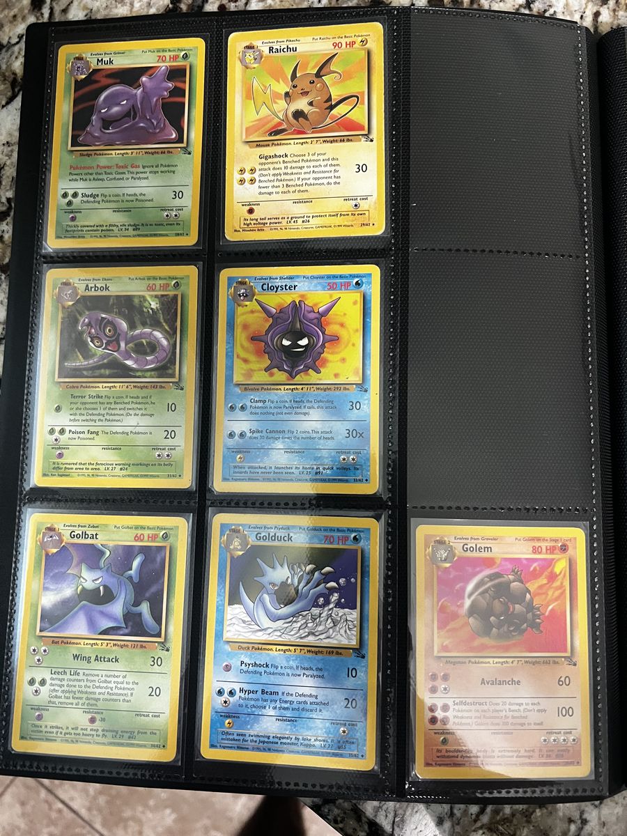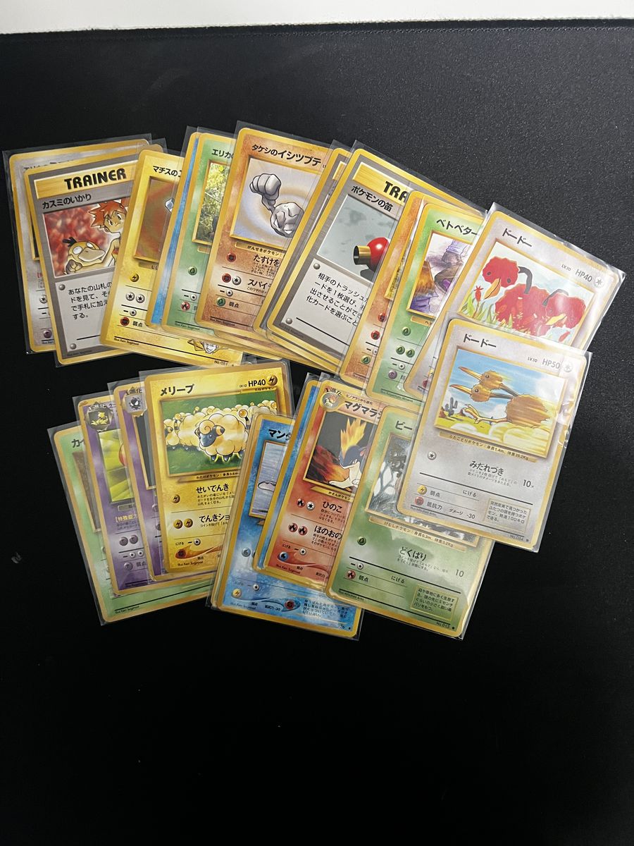 Almost complete base set. Fossil set not complete Jungle set not complete Miscellaneous first edition cards and shadowless cards. Miscellaneous pocket monsters cards Miscellaneous gym challenge cards.