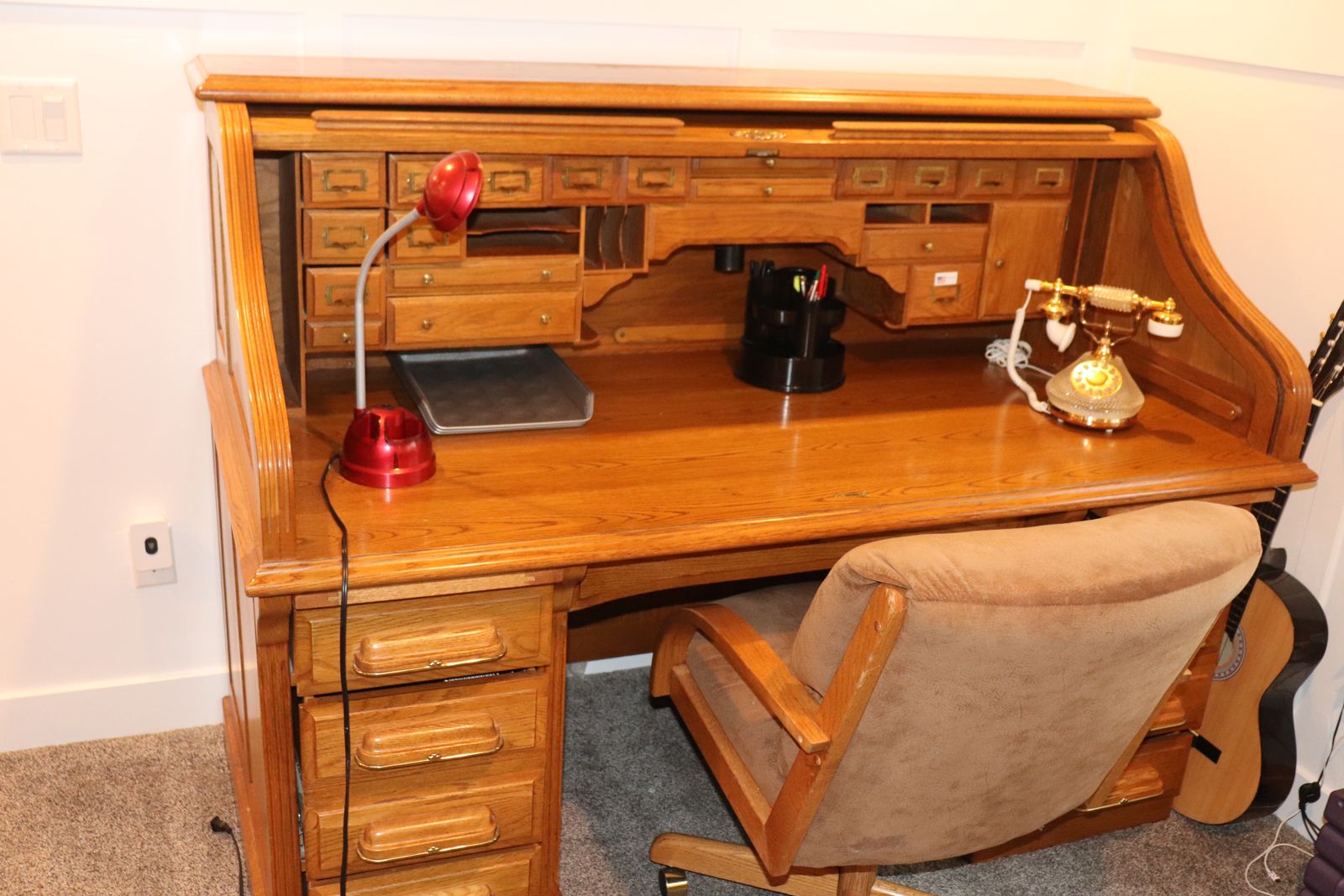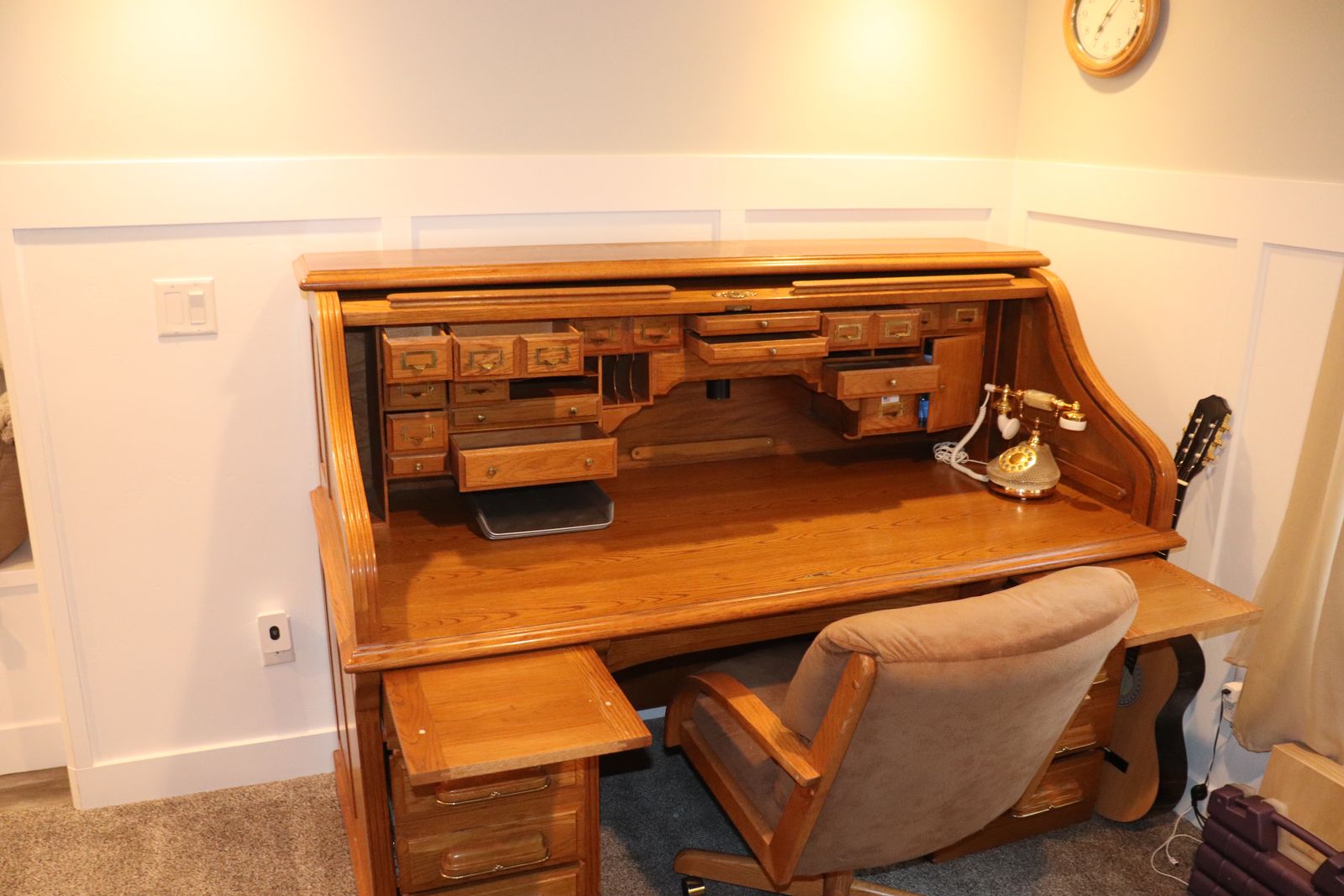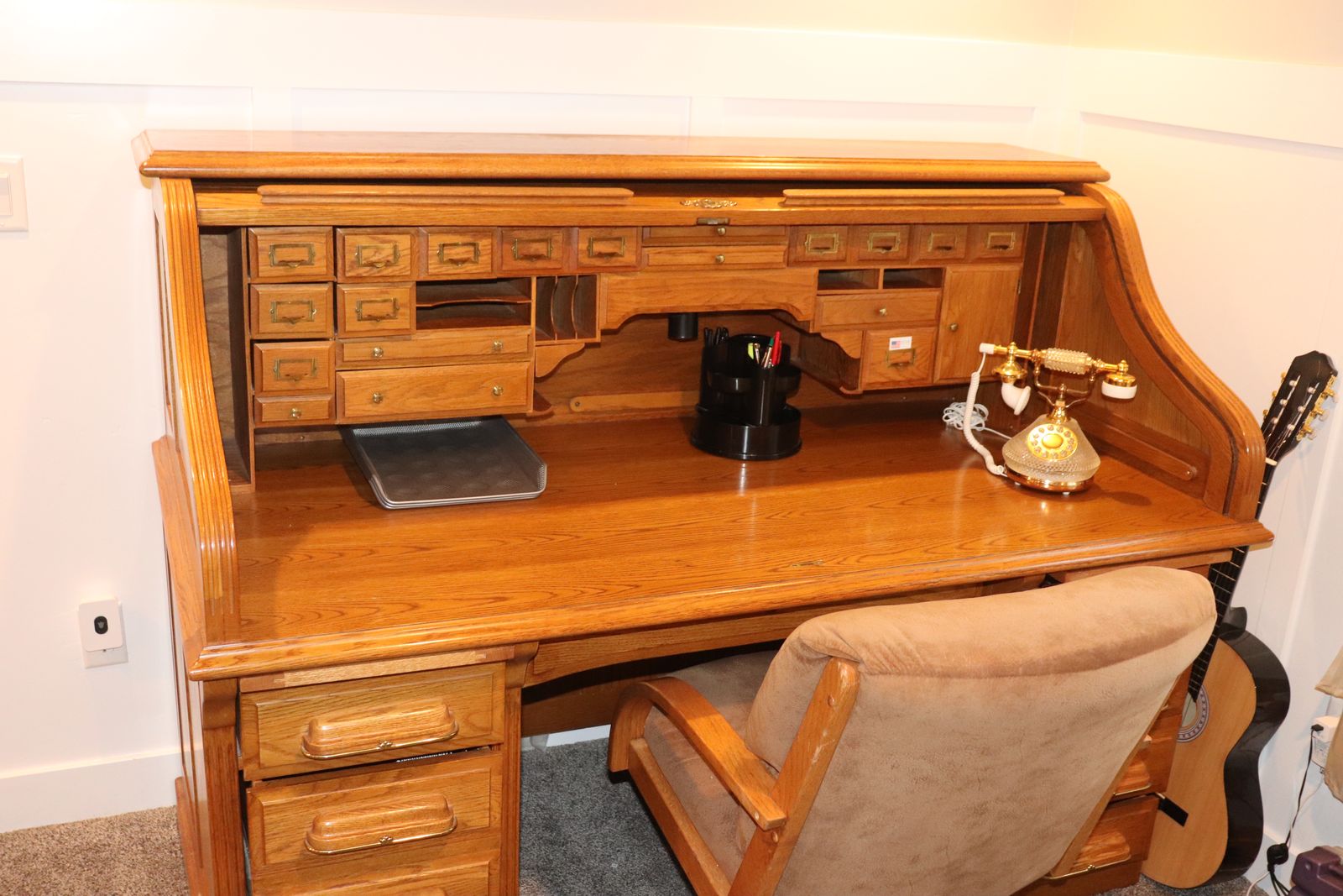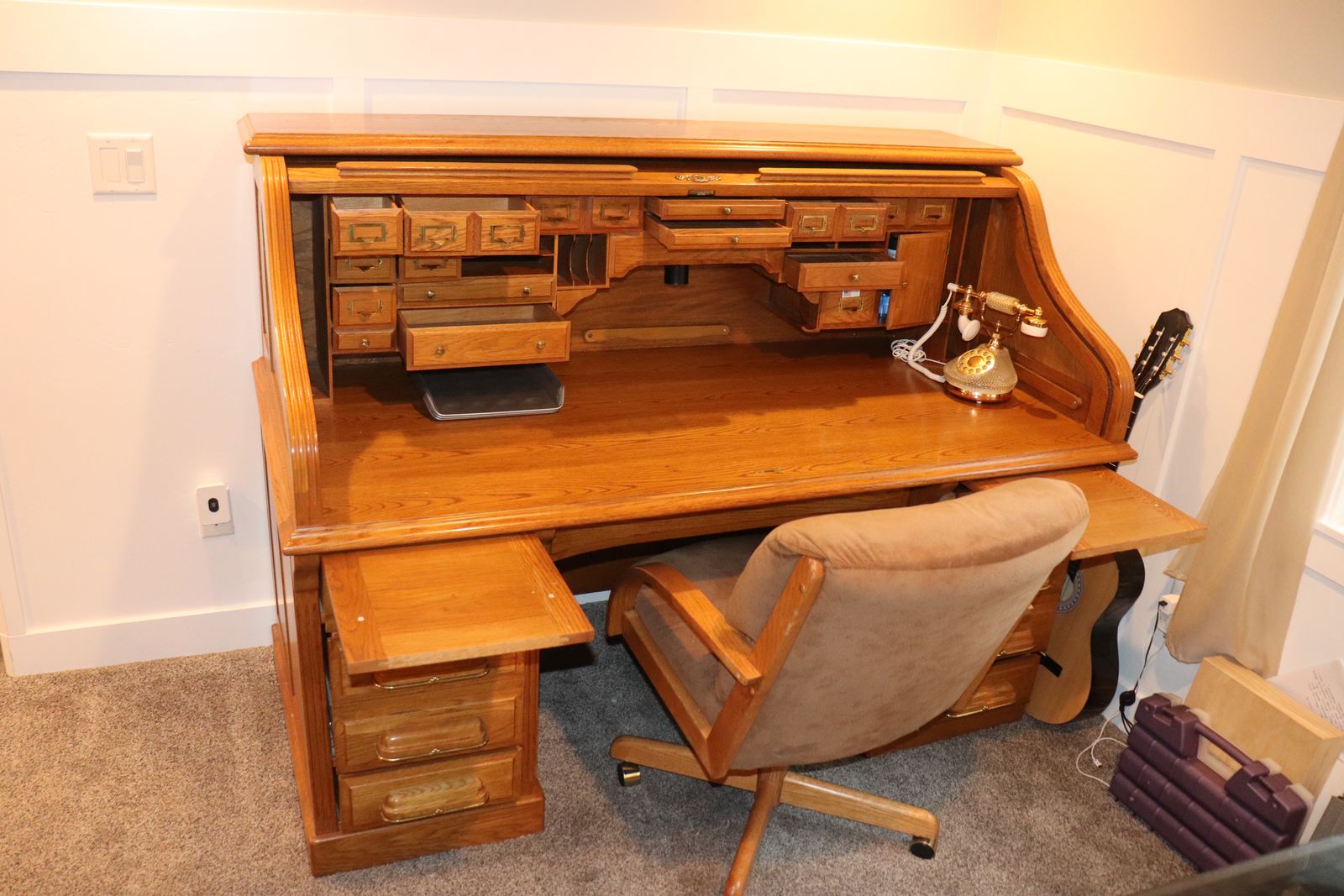 ApplePay🪵 Beautiful, classic solid wood roll-top desk with original charm and craftsmanship you don’t find in modern furniture. This is a true roll-top (tambour) desk, featuring the signature sliding wood cover that tucks away smoothly to reveal a highly functional workspace with multiple drawers, cubbies, and compartments—perfect for organizing everything from office supplies to paperwork.
