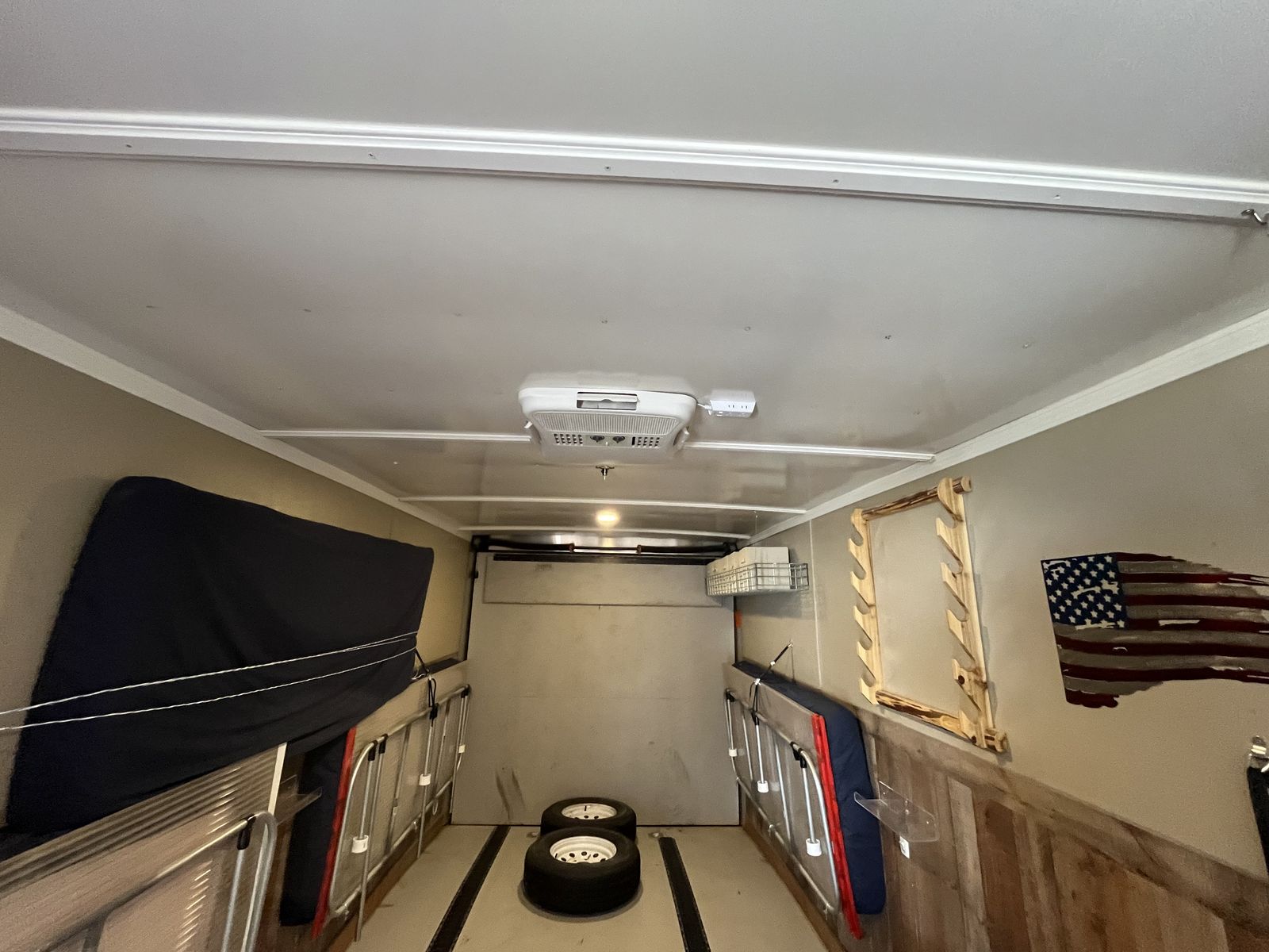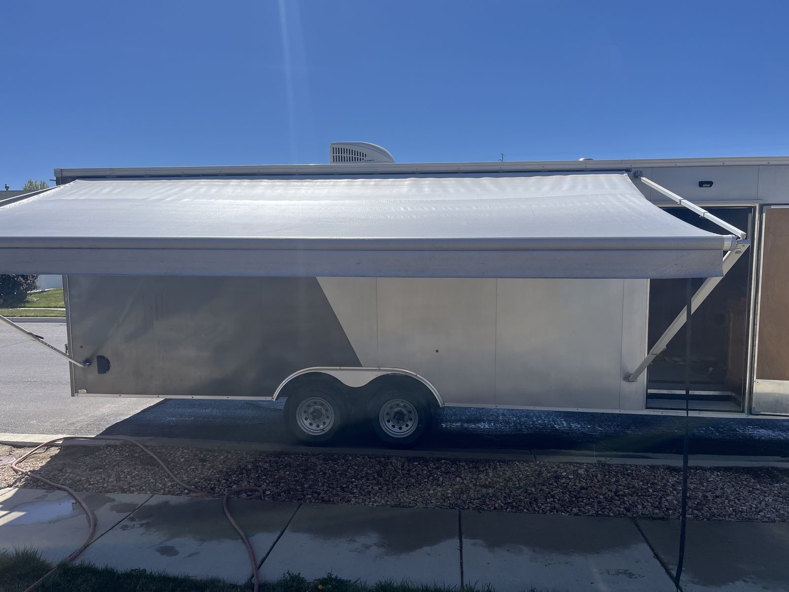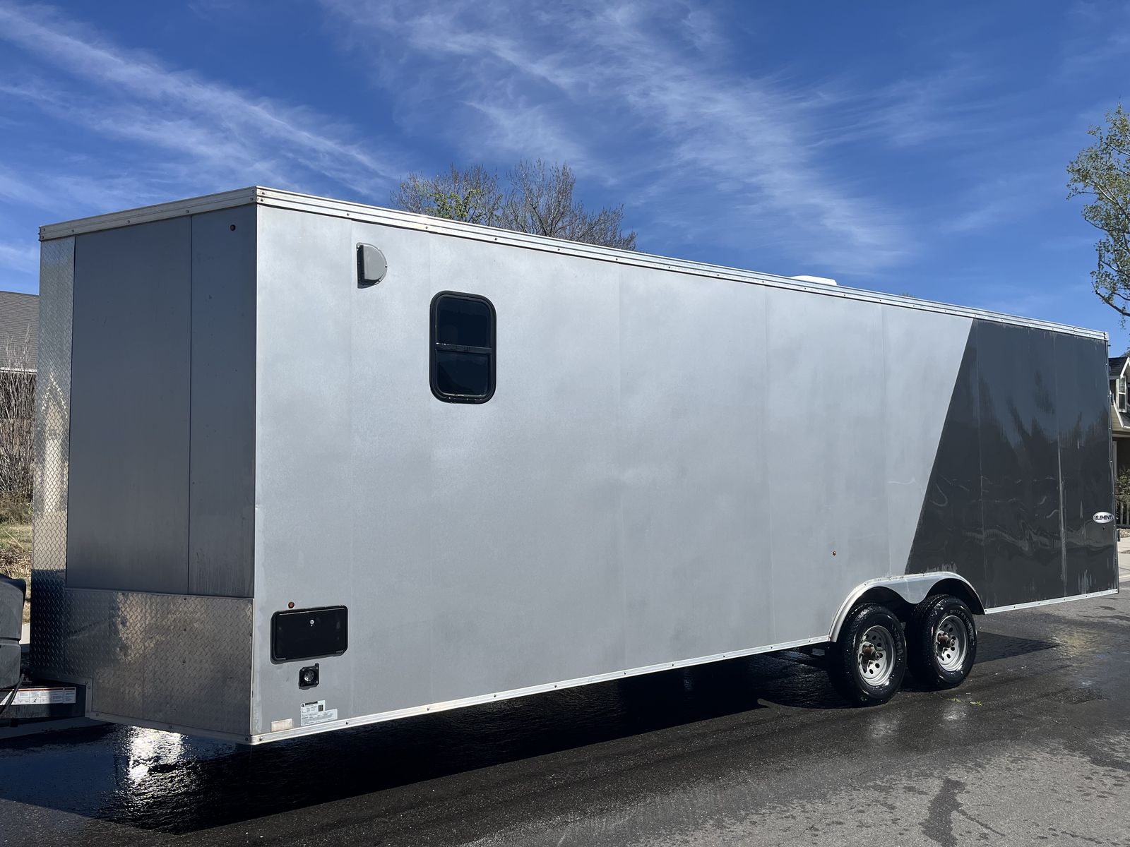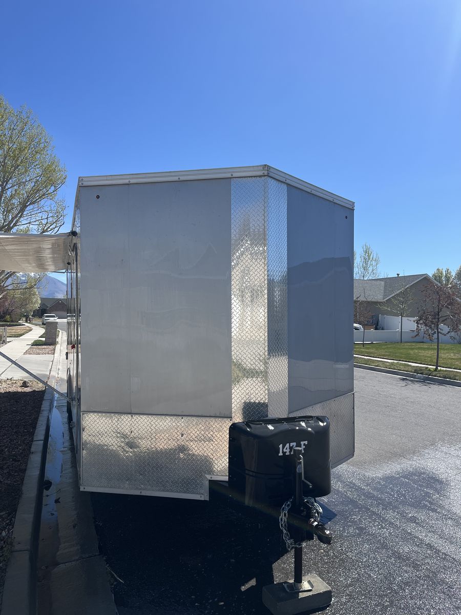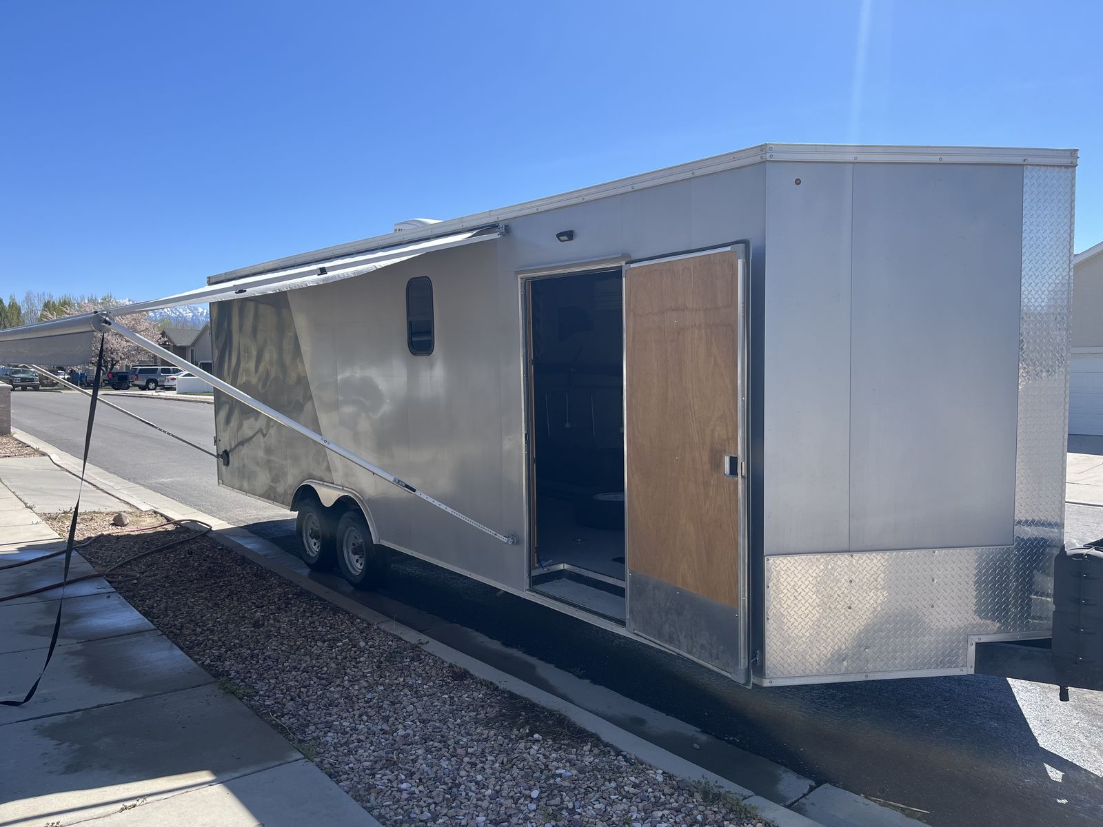26’ 2020 look element. I had this trailer custom made with piles of options. I still have the build sheets if you are interested. Then I took the inside apart ran wiring all throughout for lighting,usb chargers,air conditioner,power max converter and more. Then isolated the walls and ceiling wit 1.5” ridgid foam. And built the inside out and painted everything, installed beds it has a total of 5 mattresses that can be used in a few different ways. We typically make a really big bed in the back and then 2 more. However there is options! Has 30 gal fresh water tank,propane piped thru out with QC fittings inside and out. 20’ awning in great shape, bright exterior led’s,can lights inside,On demand hot water heater. 15k dometic AC,outside shower,roof flashing for a tent stove it is awesome on the late season hunts. And I’m sure a pile more that I’m forgetting. Total inside is 28’6” to the V with extra height being 7’6” tall. cargo room is 24’6” I haul a ranger 1500 crew and general 2 seat in it. I have lots more pics it will only let me post 10 hit me up if you want to see more. Text or call 8zero18six624eight7