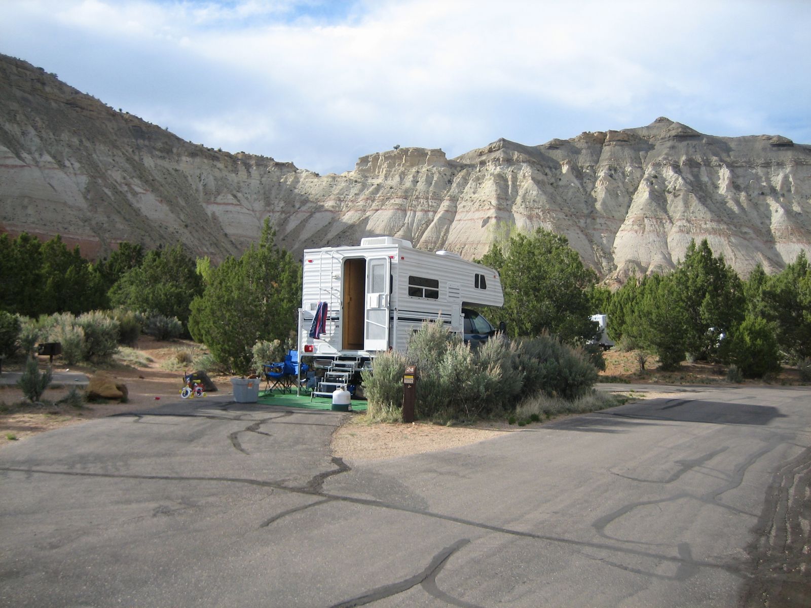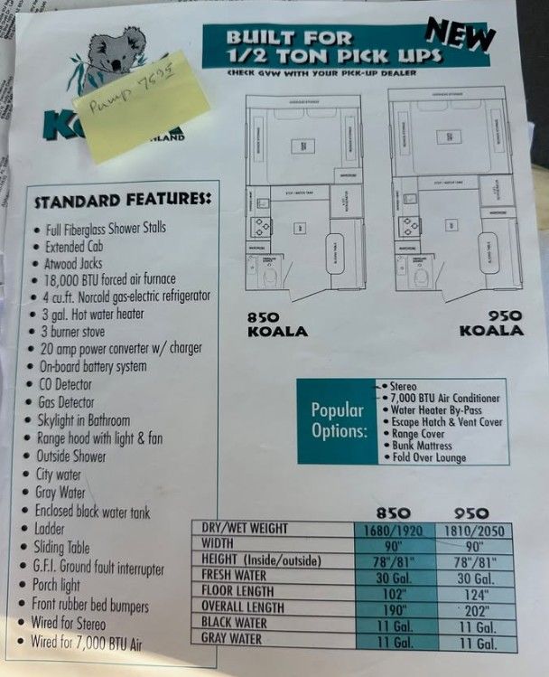 Has a Queen size bed over the cab. Couch folds down to make another bed. Lots of storage. Refigerator /freezer, Hot water heater, 3 buerner stove/over, 30 gal water tank, A/C unit(works but never use it). Bathroom and an exterior shower.