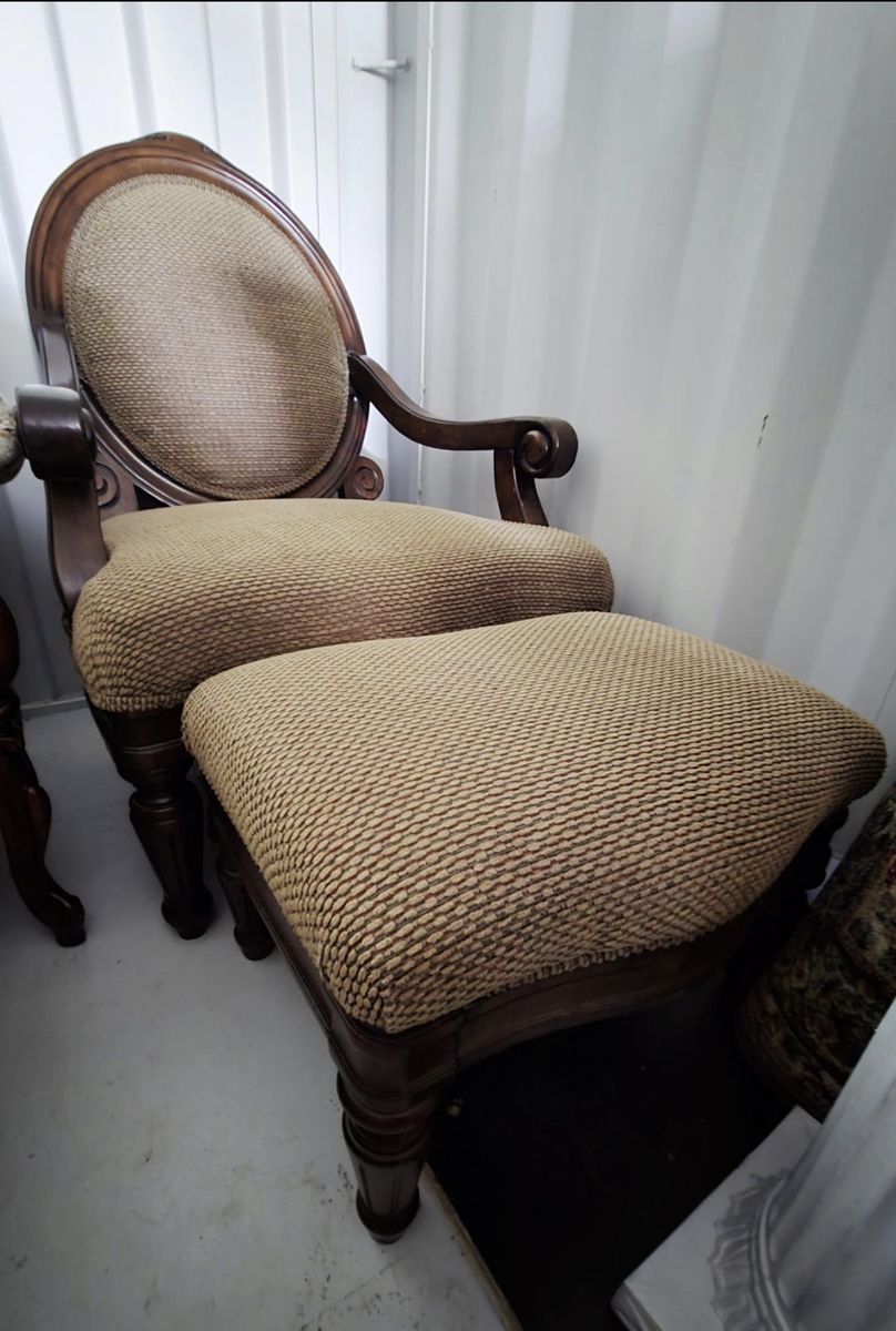 VenmoLike new neutral toned traditional chair & ottoman. In great shape all around and fitting many decors. Upholstery and wood in wonderful condition. Structurally solid all the way around. There are shadows in picture on the backrest but in reality it is the same as the ottoman in color and condition. Like new.