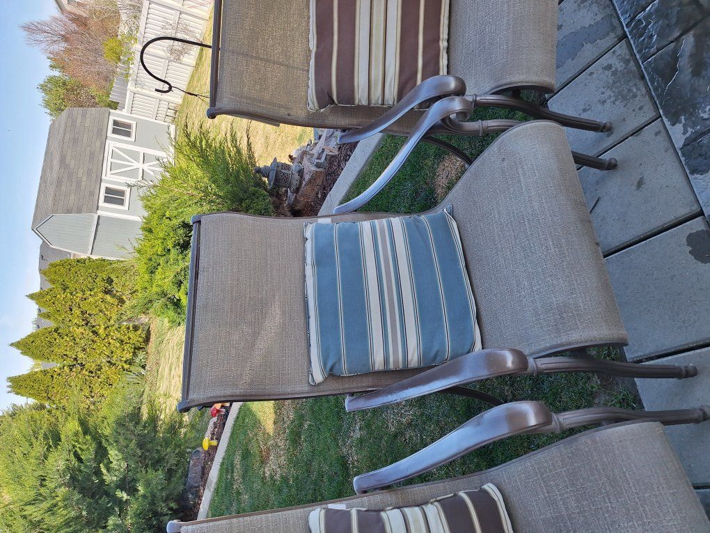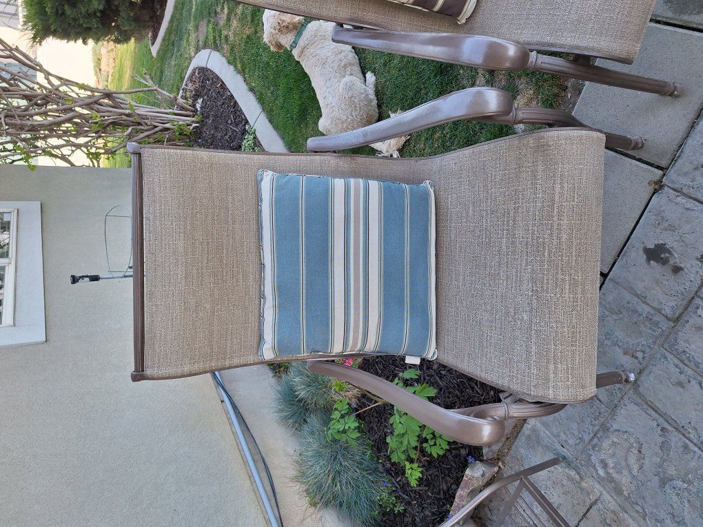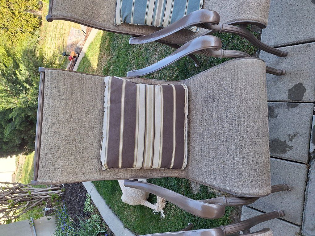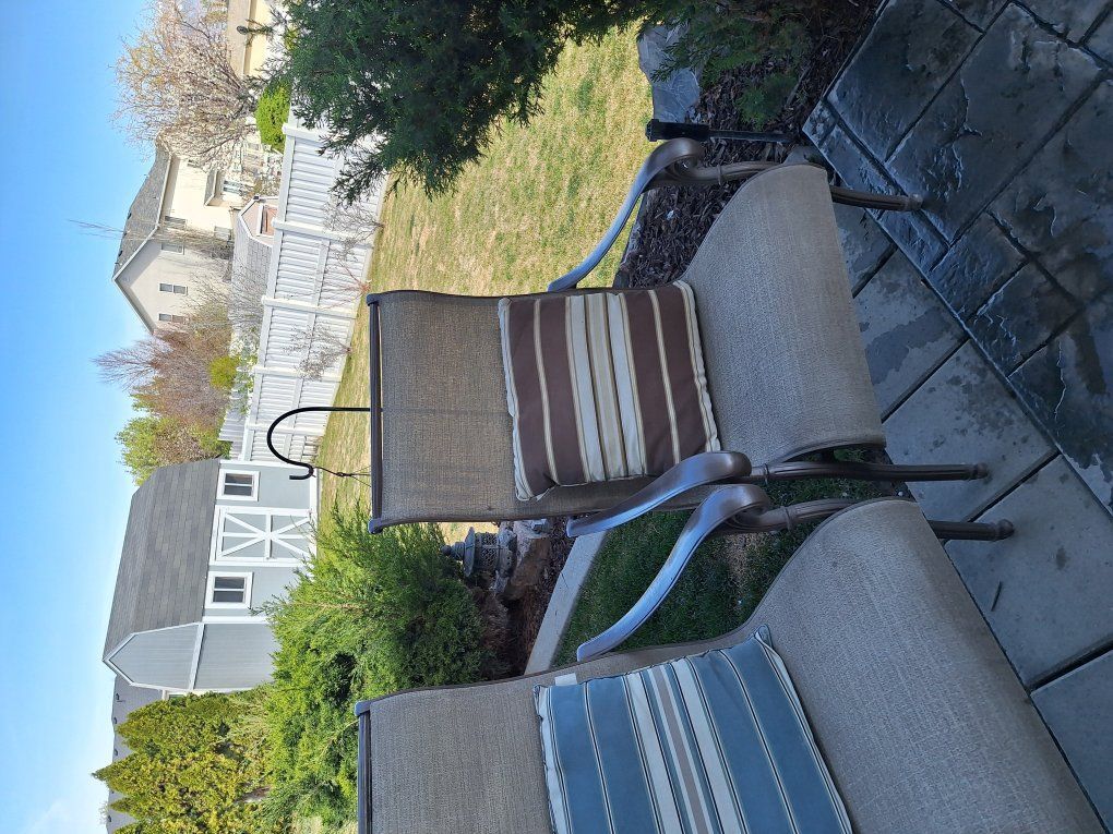 Venmo83x44 Costco Scrolled Aluminum frame, new Trex table top, 4 matching comfortable chairs with good fabric. HUGE TABLE WILL SEAT EIGHT. Seat cushions included. Good condition, and Costco superior quality. call Michael at 801 403-6450.