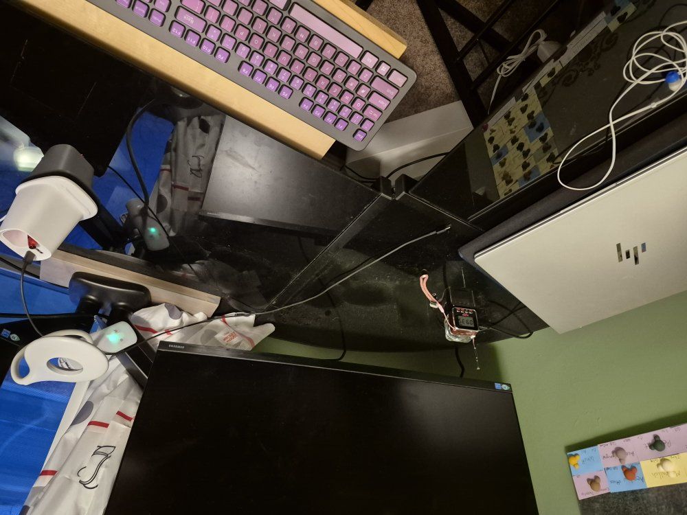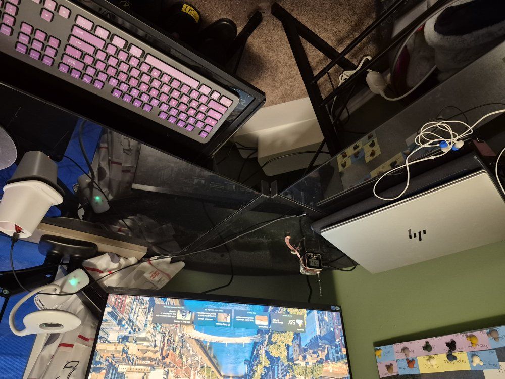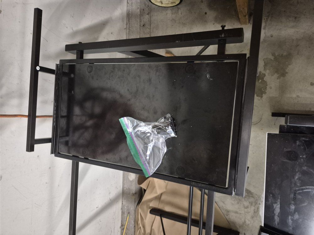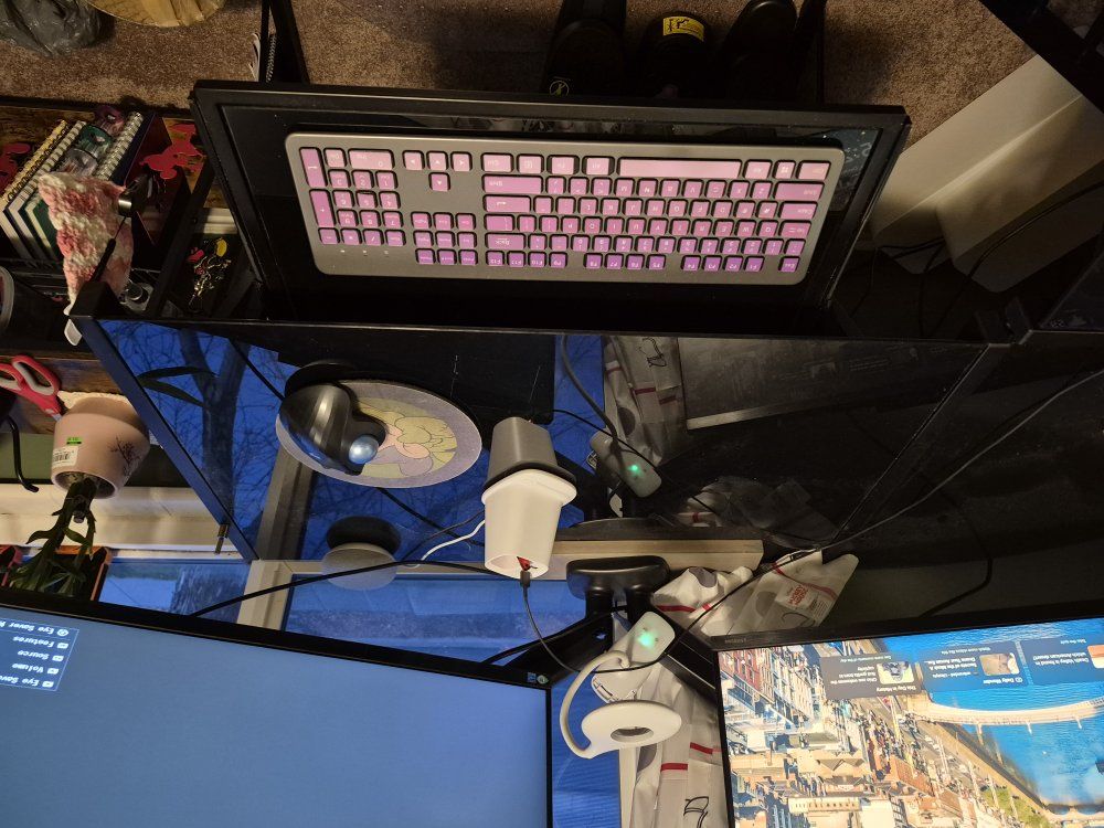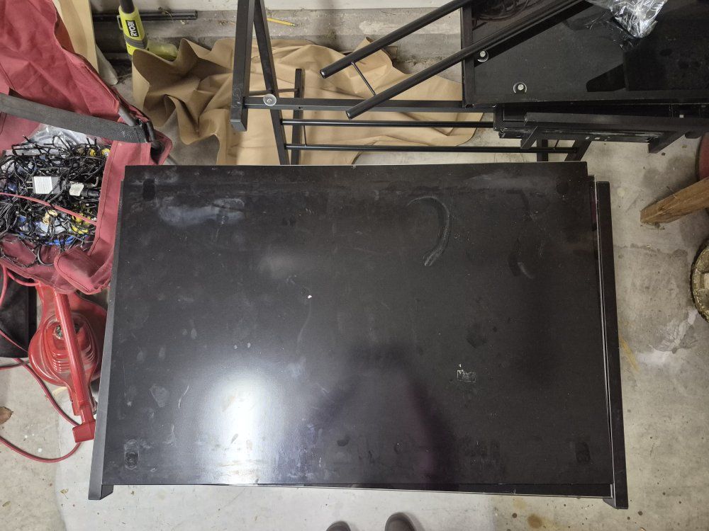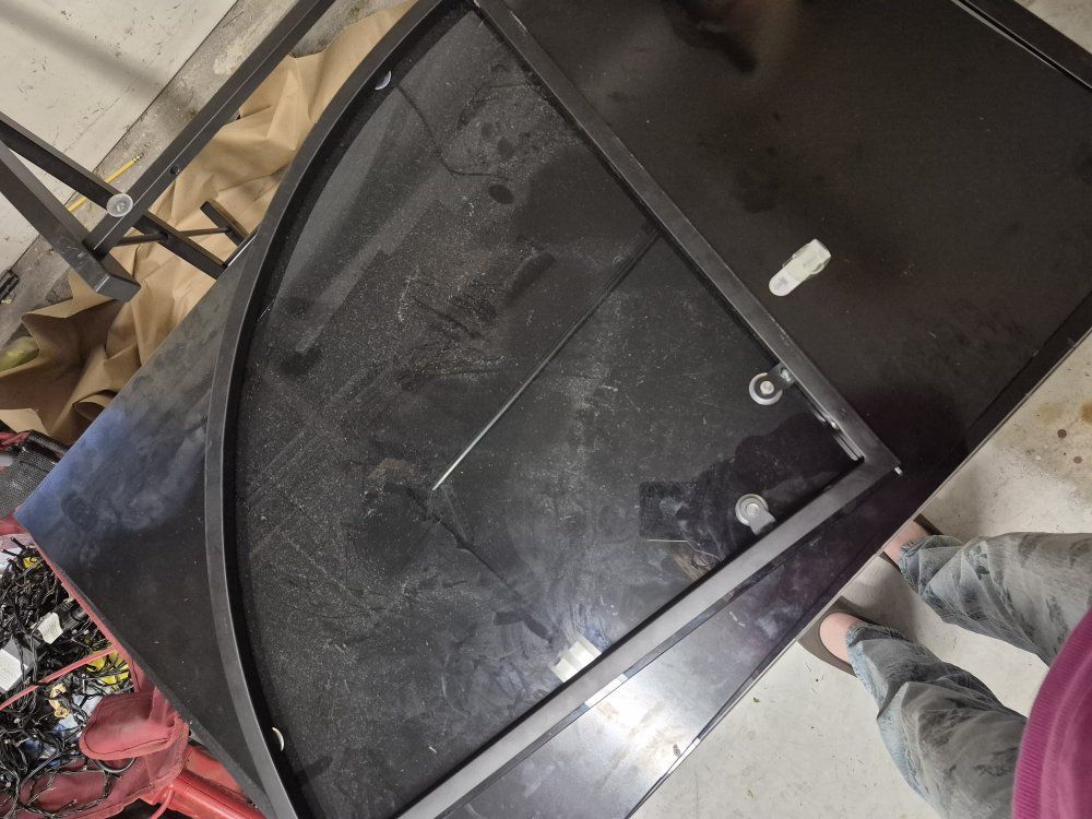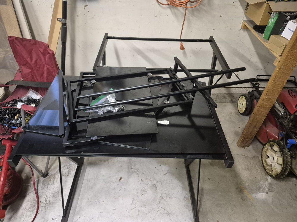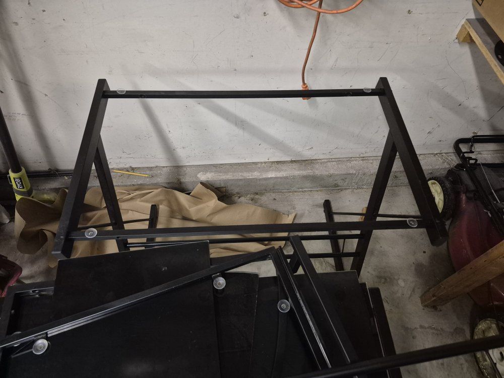 Spacious black L-shaped desk. Glass top and metal frame. Has a pull-out keyboard tray. Good for home office setup.
