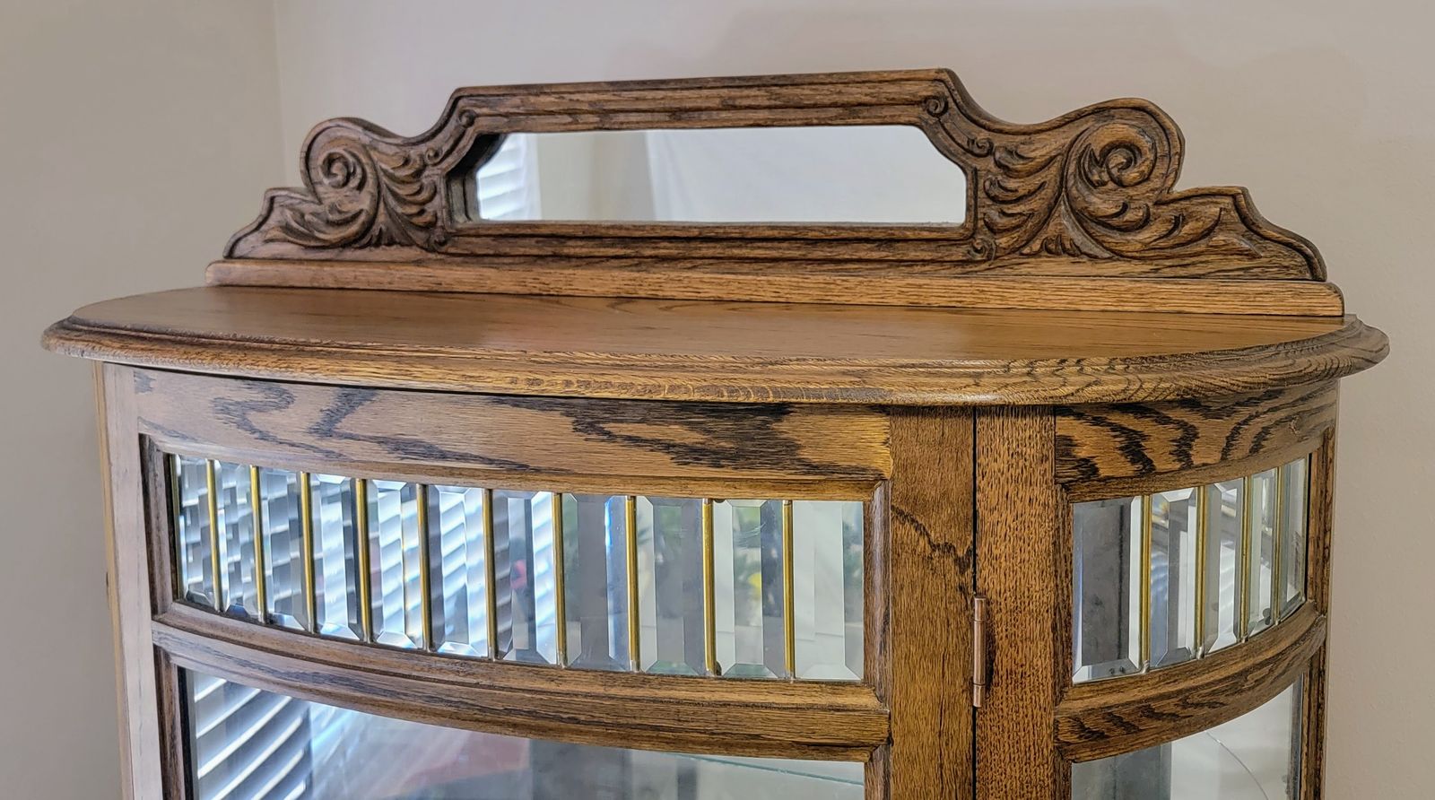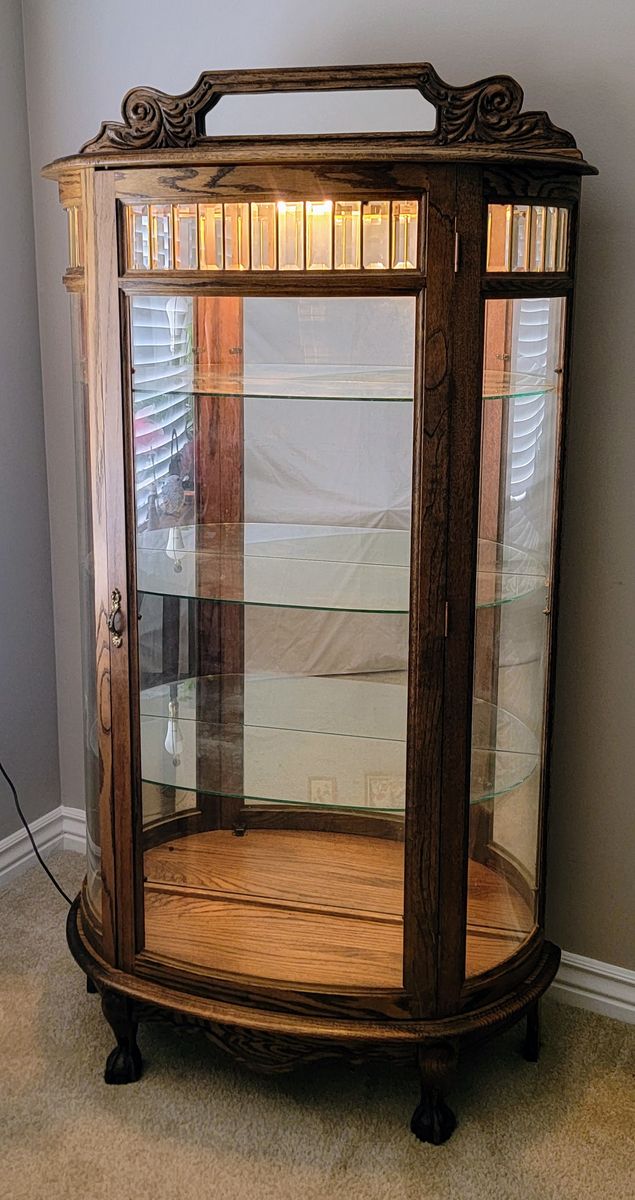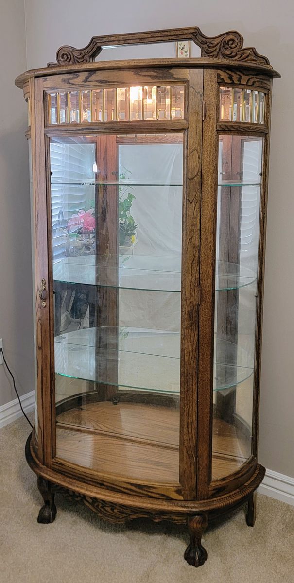 Beautiful vintage/antique oak curio cabinet in excellent condition. This is a high-quality, sturdy piece perfect for displaying glassware, trophies, or collectibles.