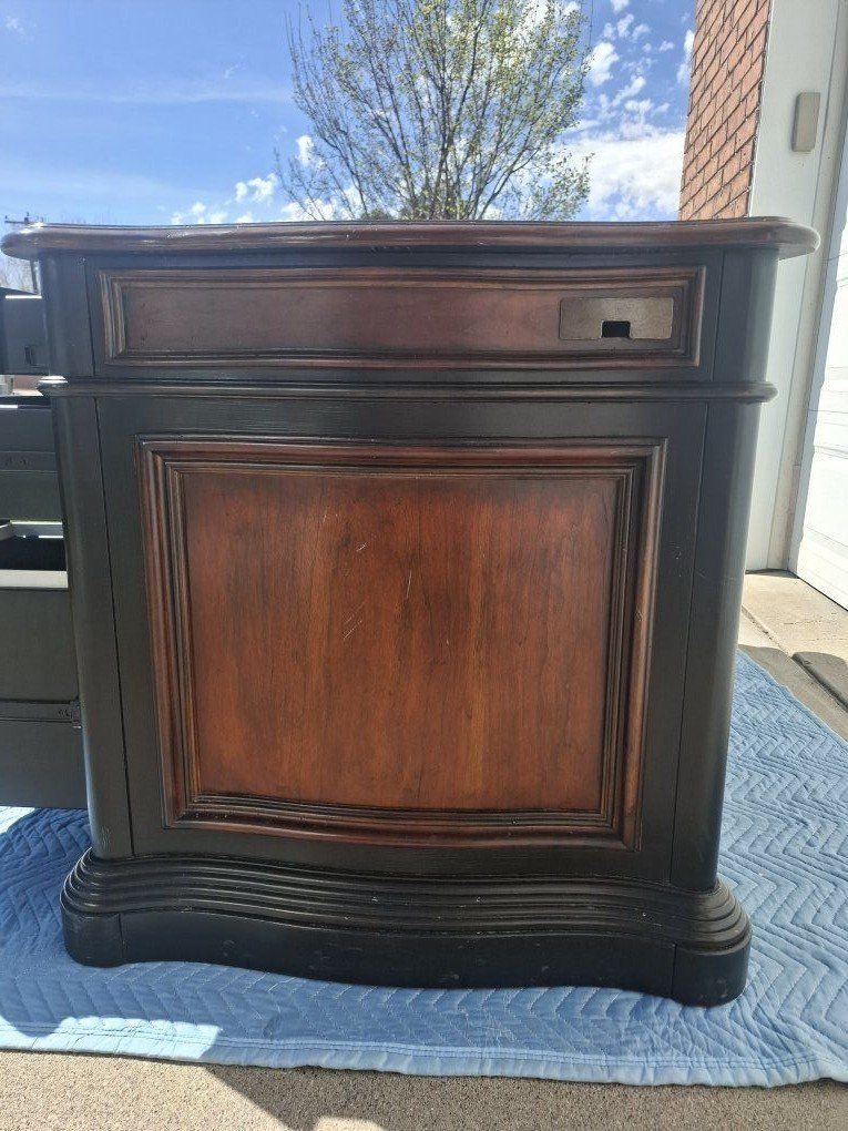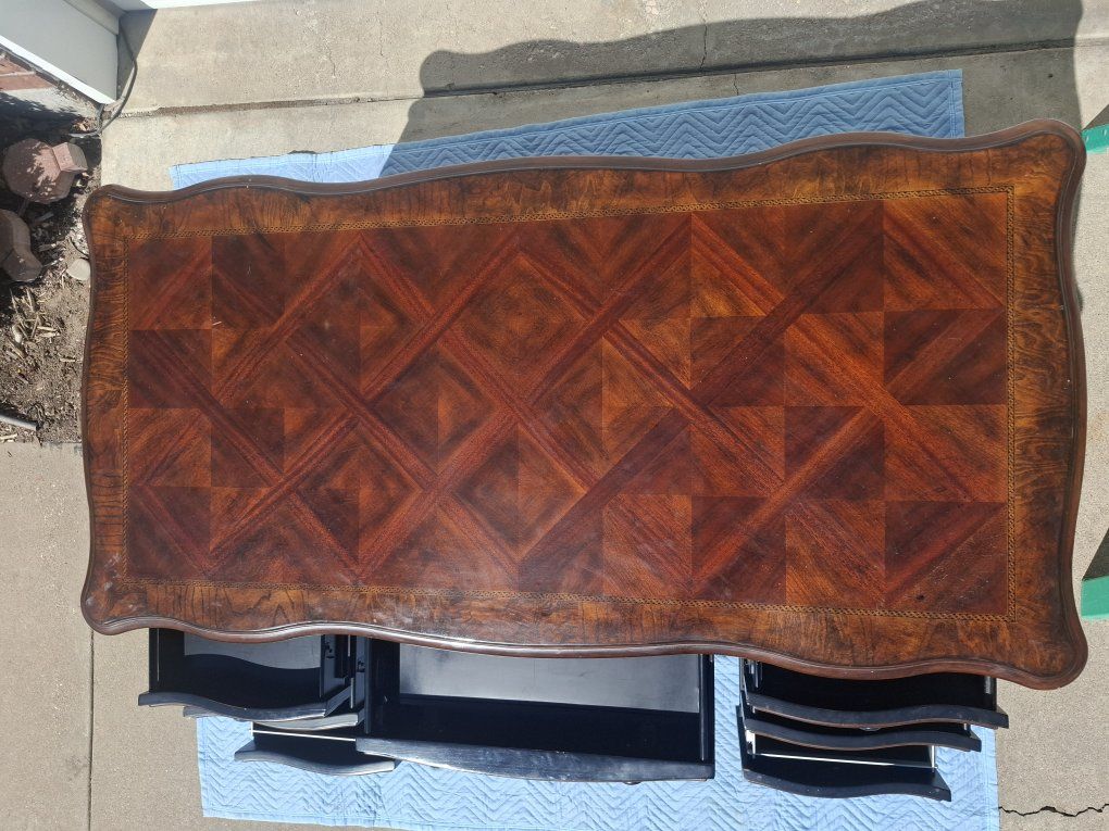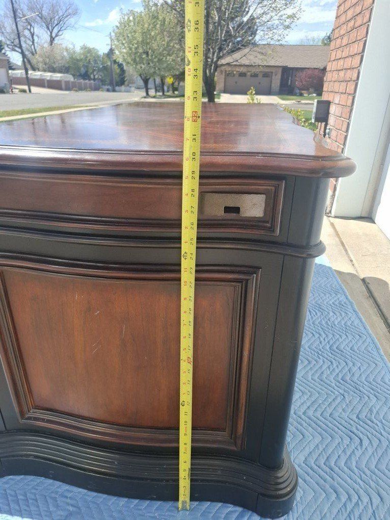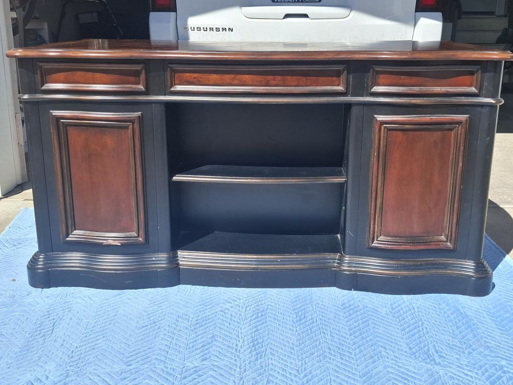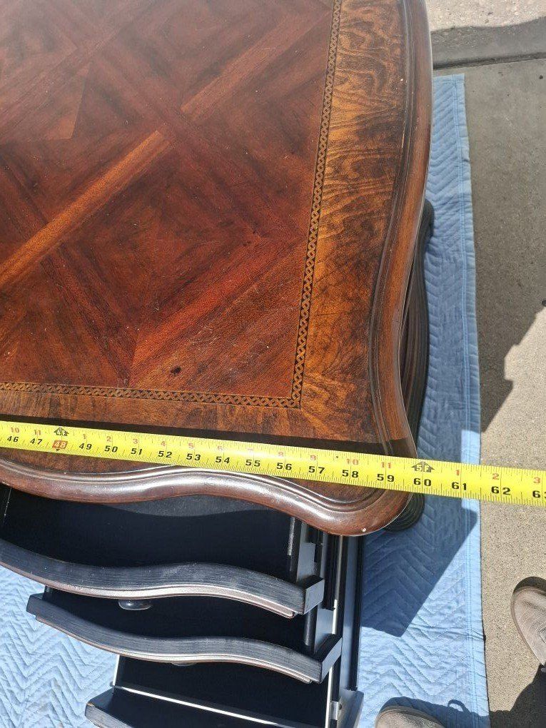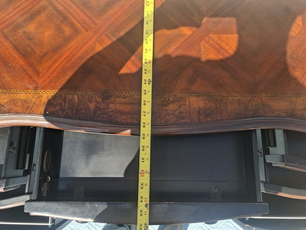 Great desk made by Hooker Furniture. Measurements are 60 in. long x 29 in. wide x 30.5 in. tall. It is pretty heavy, made from solid wood. Its a great antique peice of furniture, has been well kept for. Check the picture for one small chip on the backside.