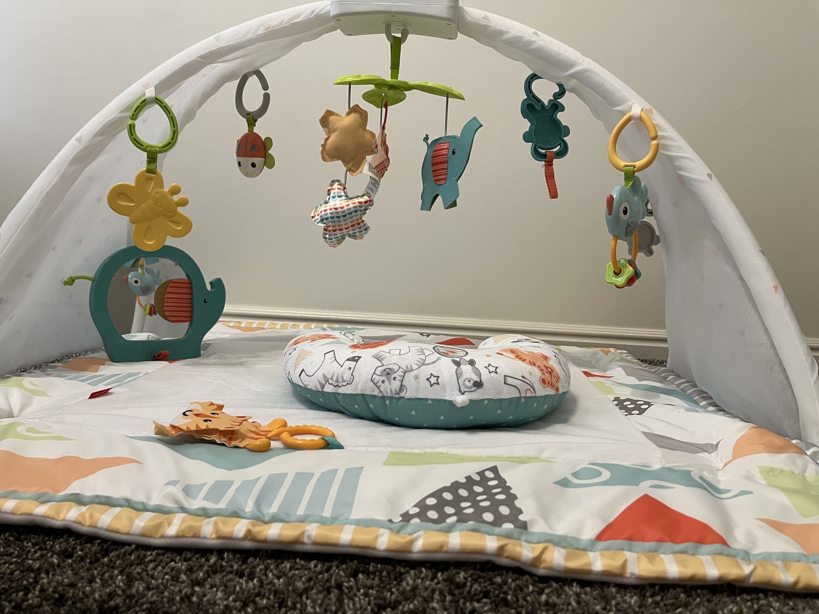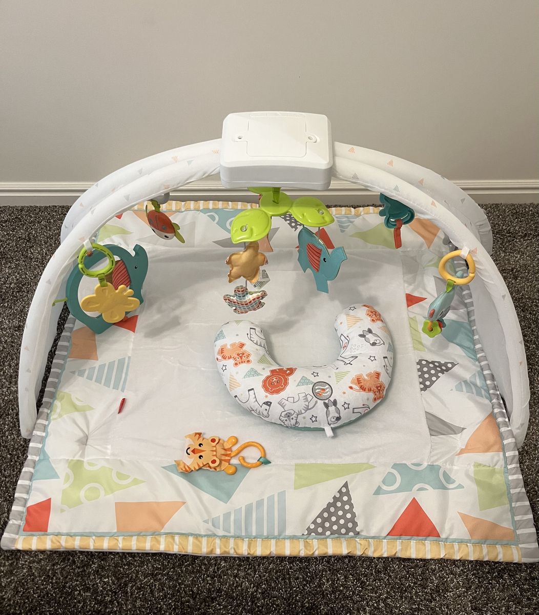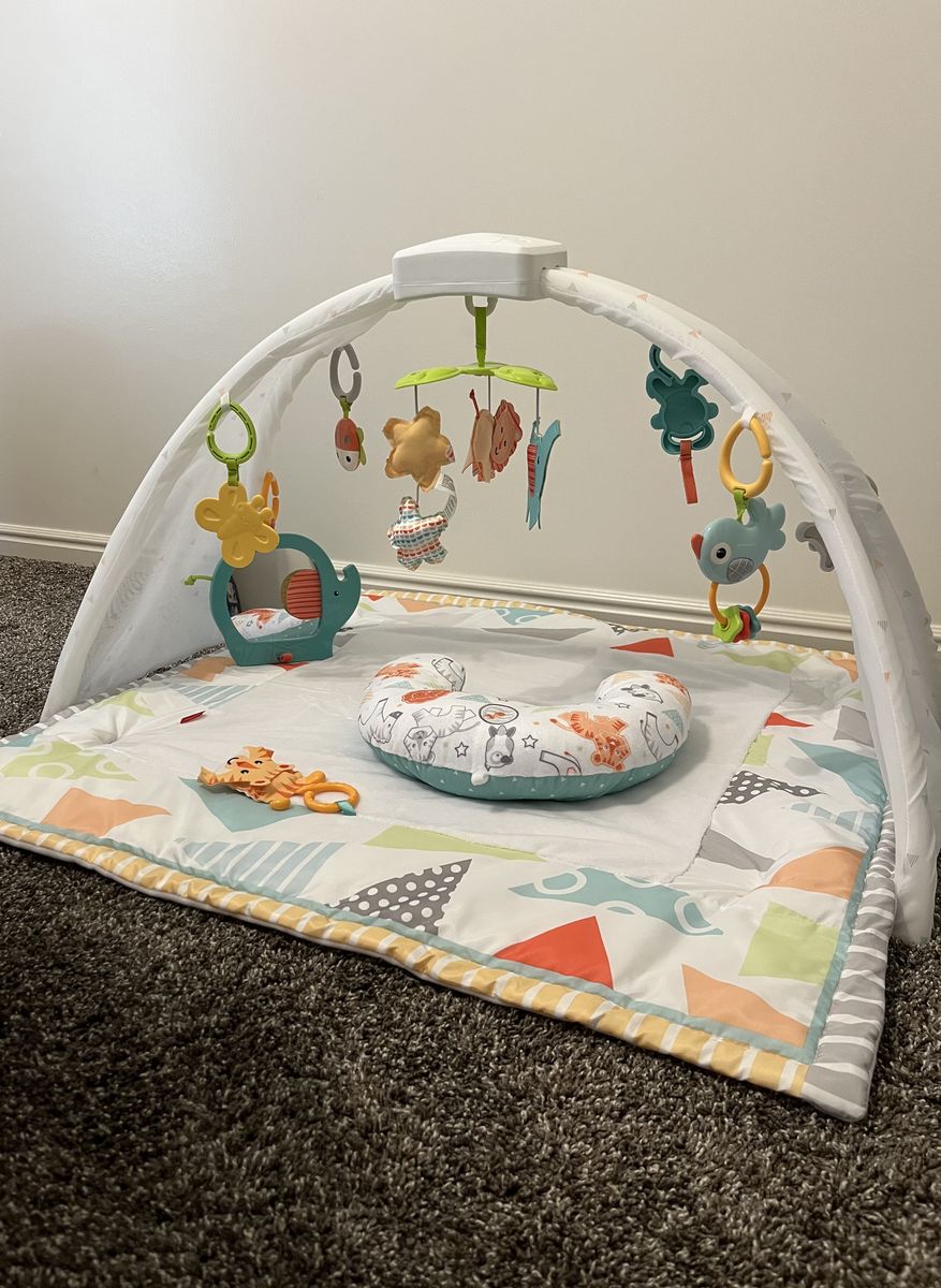 VenmoTwinkling light floor gym with tummy time pillow that vibrates and plays music. 8 attachable toys are included. In really good condition I just don’t need it anymore. Smoke free home.