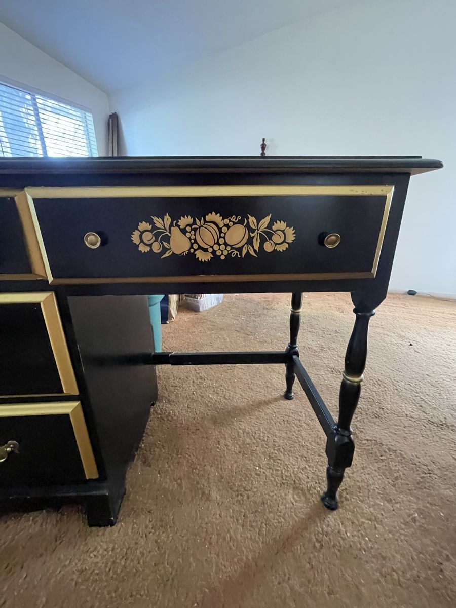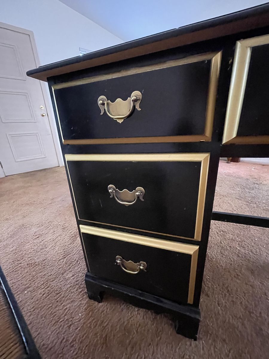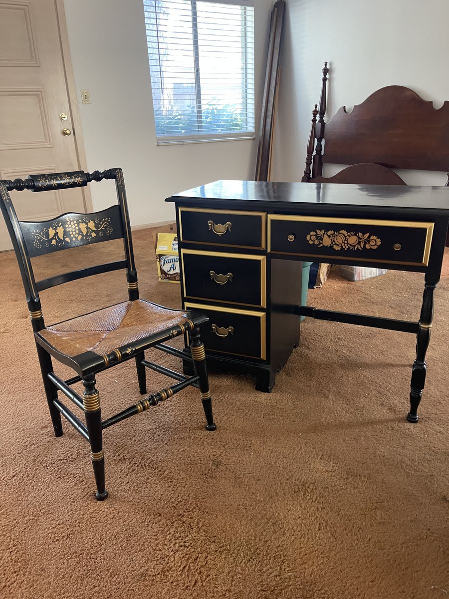 VenmoVintage desk, chair and side drawer. It’s in really great shape for the age. It has a small broken piece (shown in picture of the desk) it’s been in storage and needs a new home. Sold as set! $50