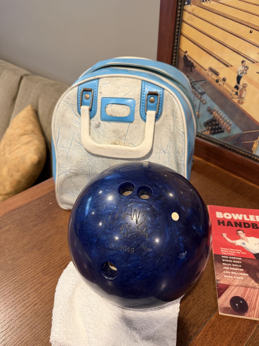Vintage bowling bag with women's Bonanza 300 bowling ball. 10 Lbs.