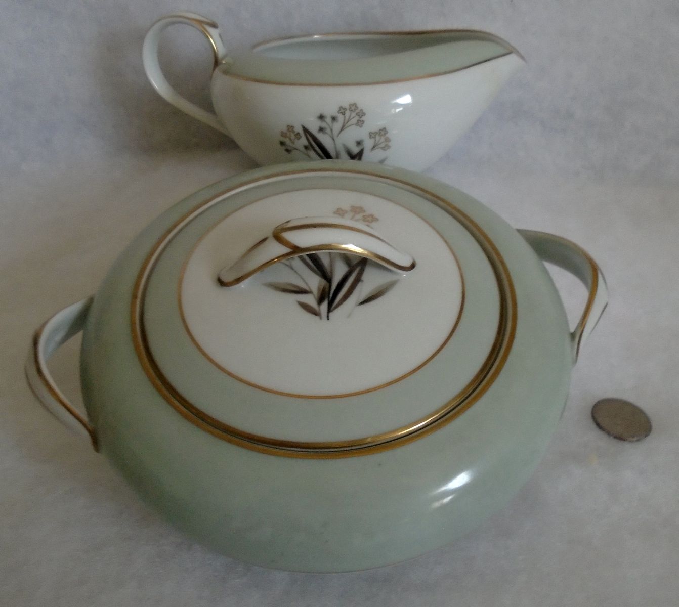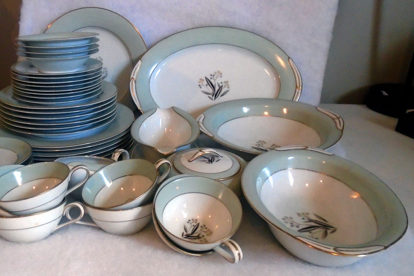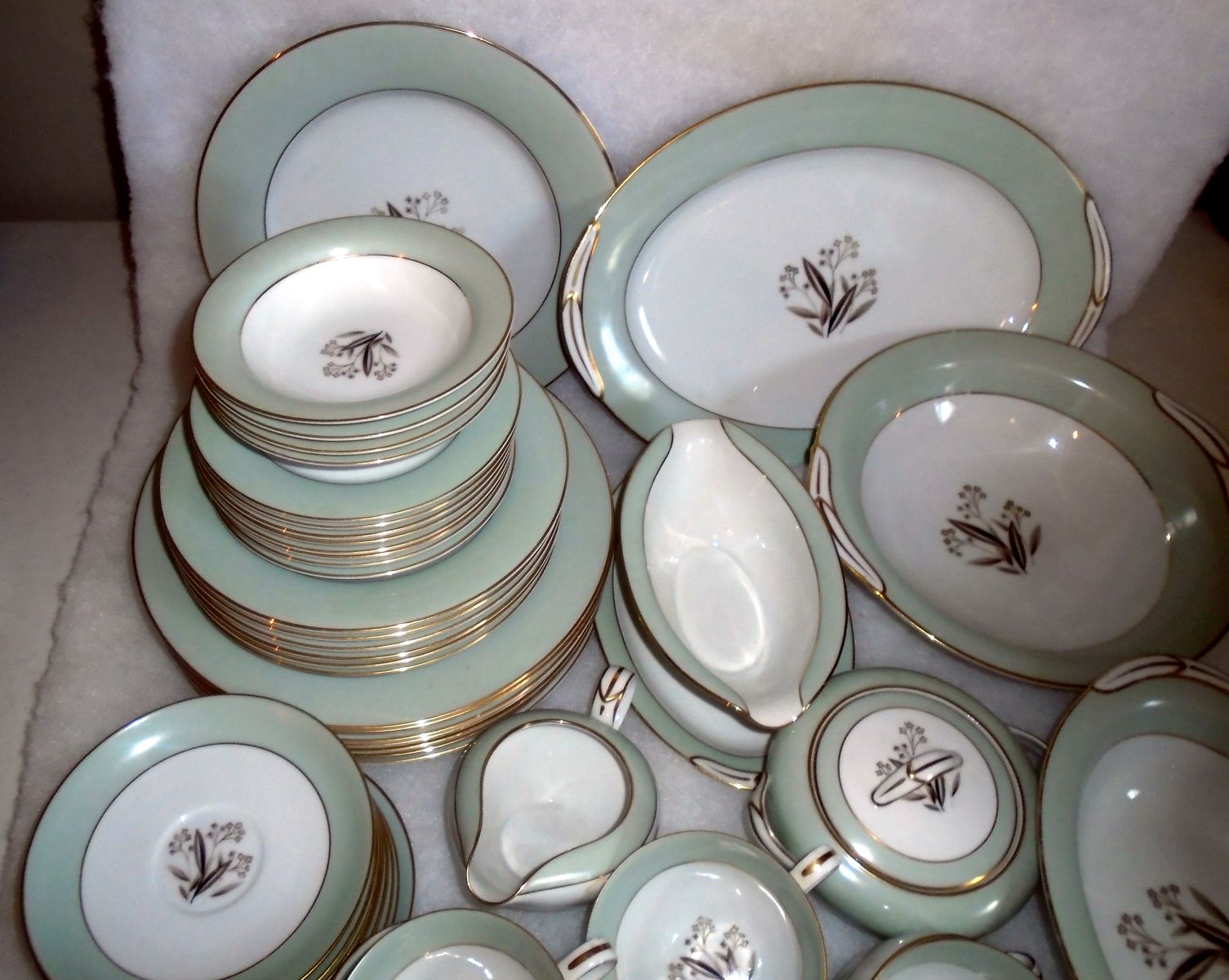 NORITAKE CHINA (5544) CARLISLE Dinner Set/Serving Ware Set Made in Japan VINTAGE SET OF A TOTAL OF 49 PIECES PRODUCED FROM 1954-1959 in a White/Mint Green Color with Gold Trim and Floral Print in Center!!