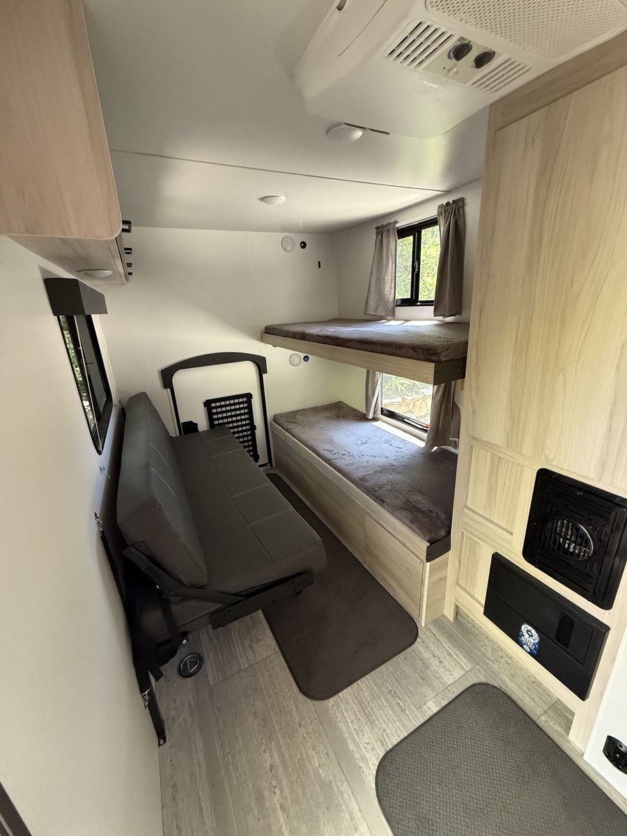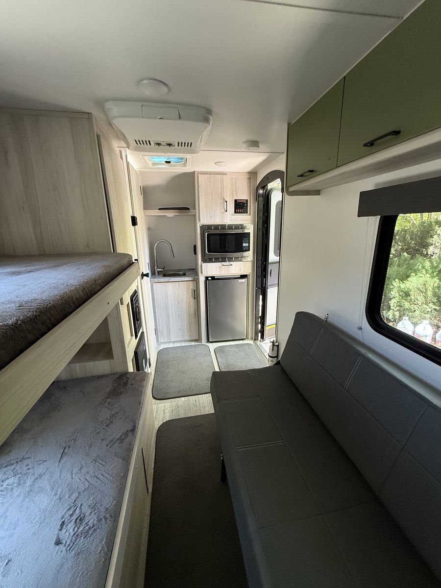 Rugged, highly sought-after TB model. Compact. Perfect for mountain bikers and other sporty types who want to get off the main roads. Plenty of room for gear. Comes loaded with extras. Adventure couples or singles - fold out the main bed for sleeping, use the upper bunk as a gear shelf.