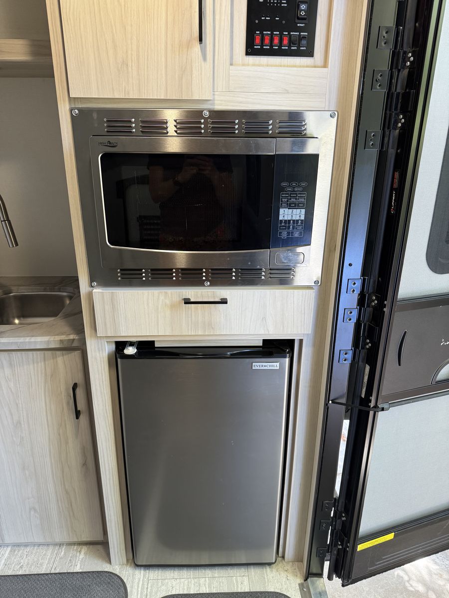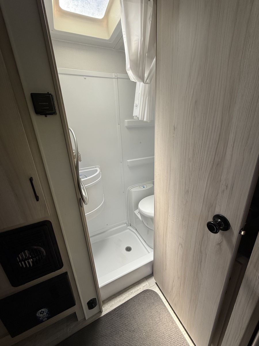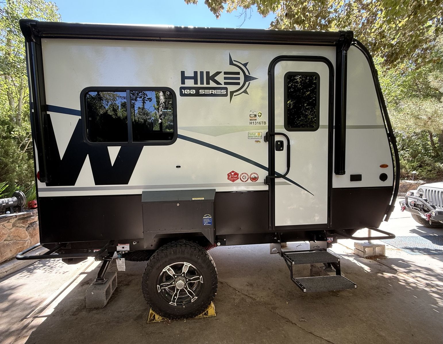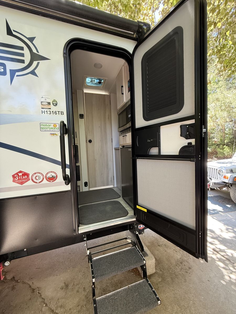 Manual rear and off-camp side batwing awning w/ drop down panels for exterior shower