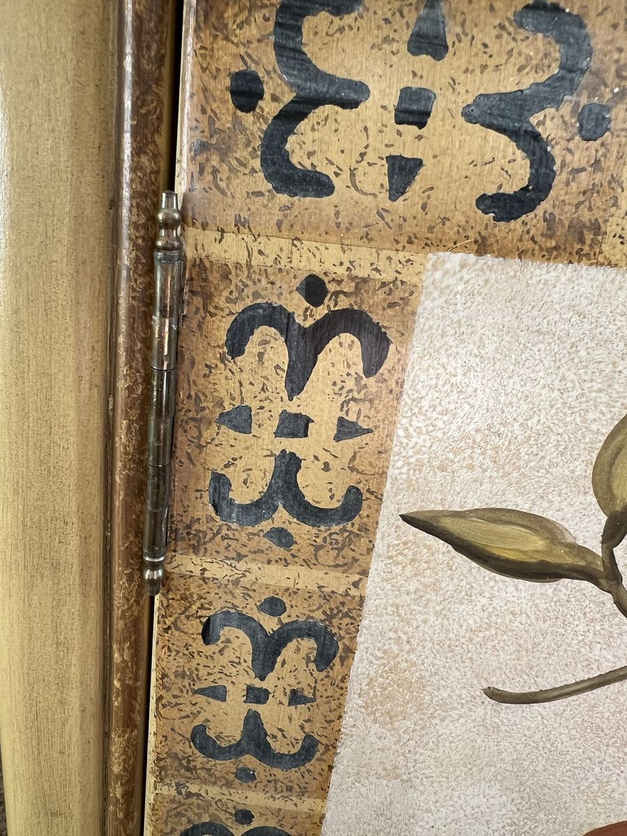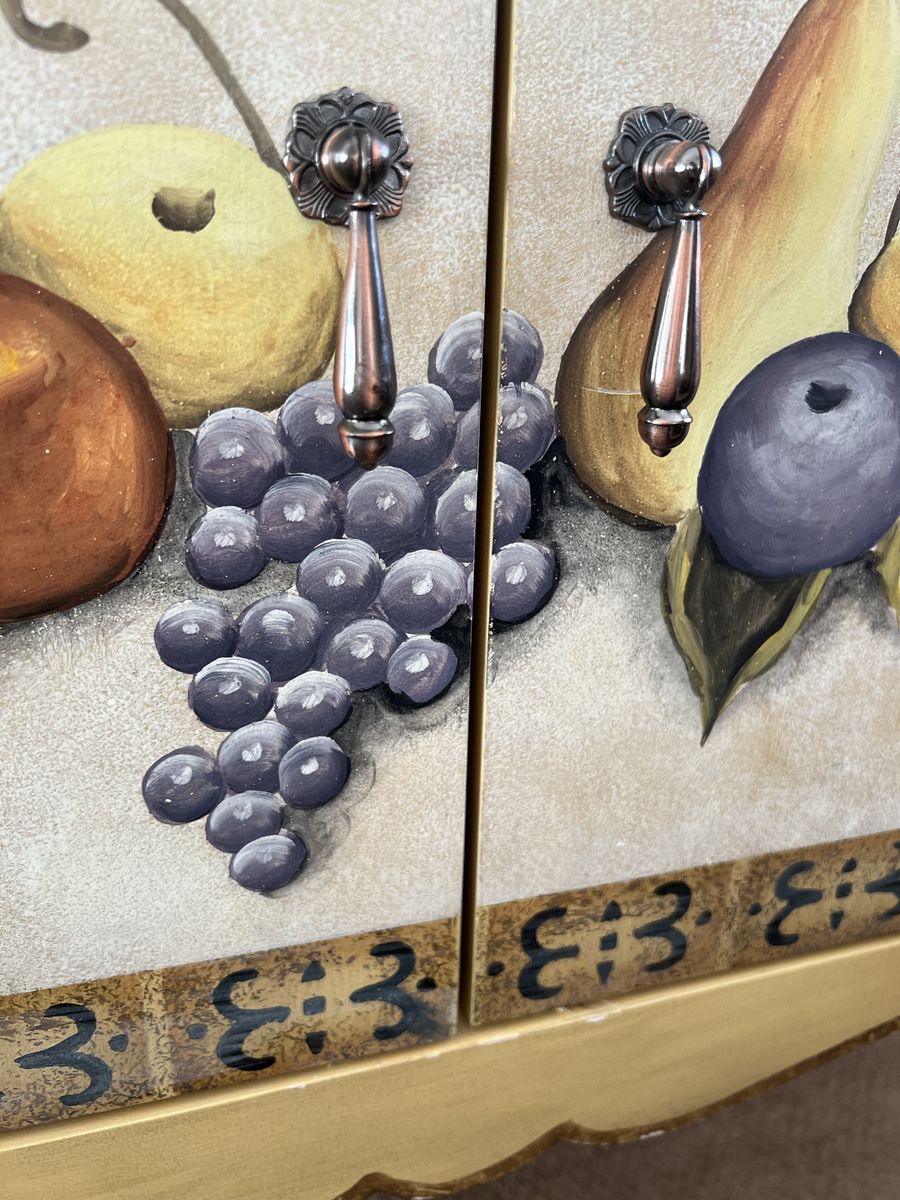 • Artisan Detail: Stunning hand-painted fruit still-life (grapes, pears, and plums) on the front doors.