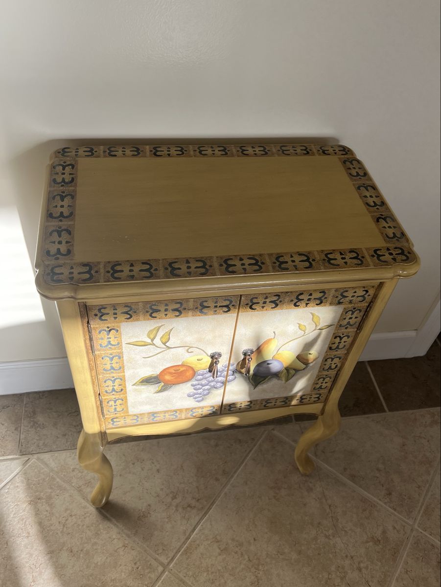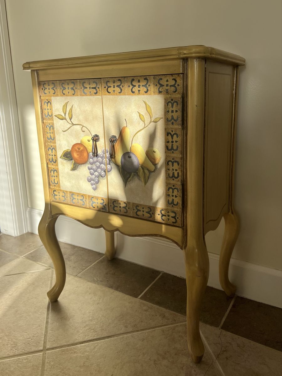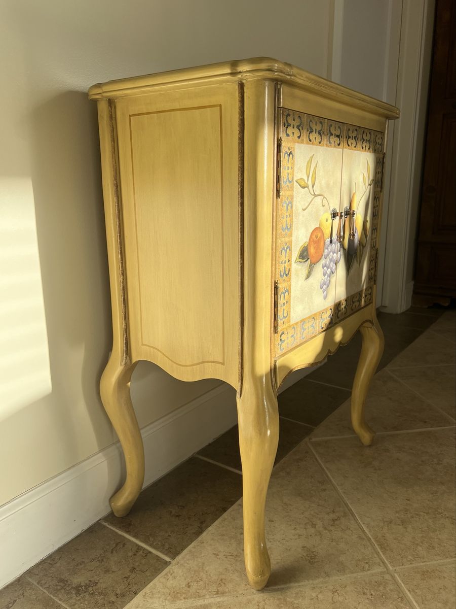 This is a very charming hand-painted vintage accent chest! This piece features a classic French Provincial silhouette with cabriole legs and a warm yellow finish that instantly brightens any room.