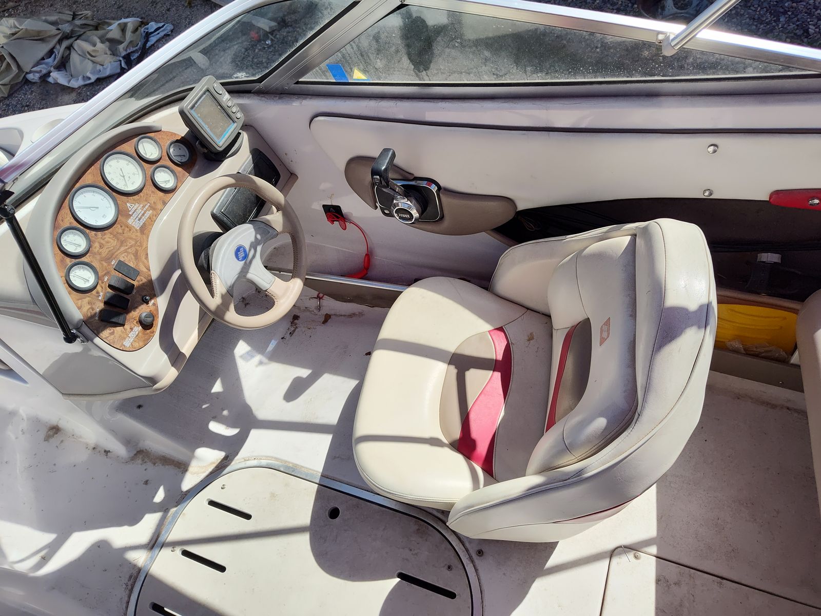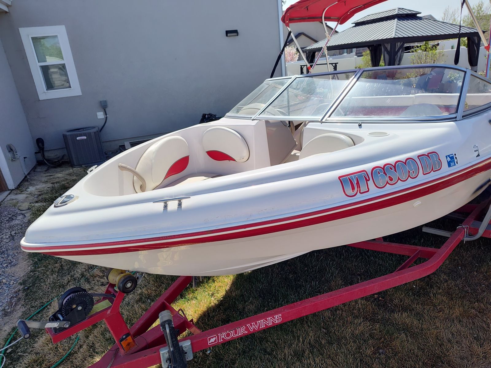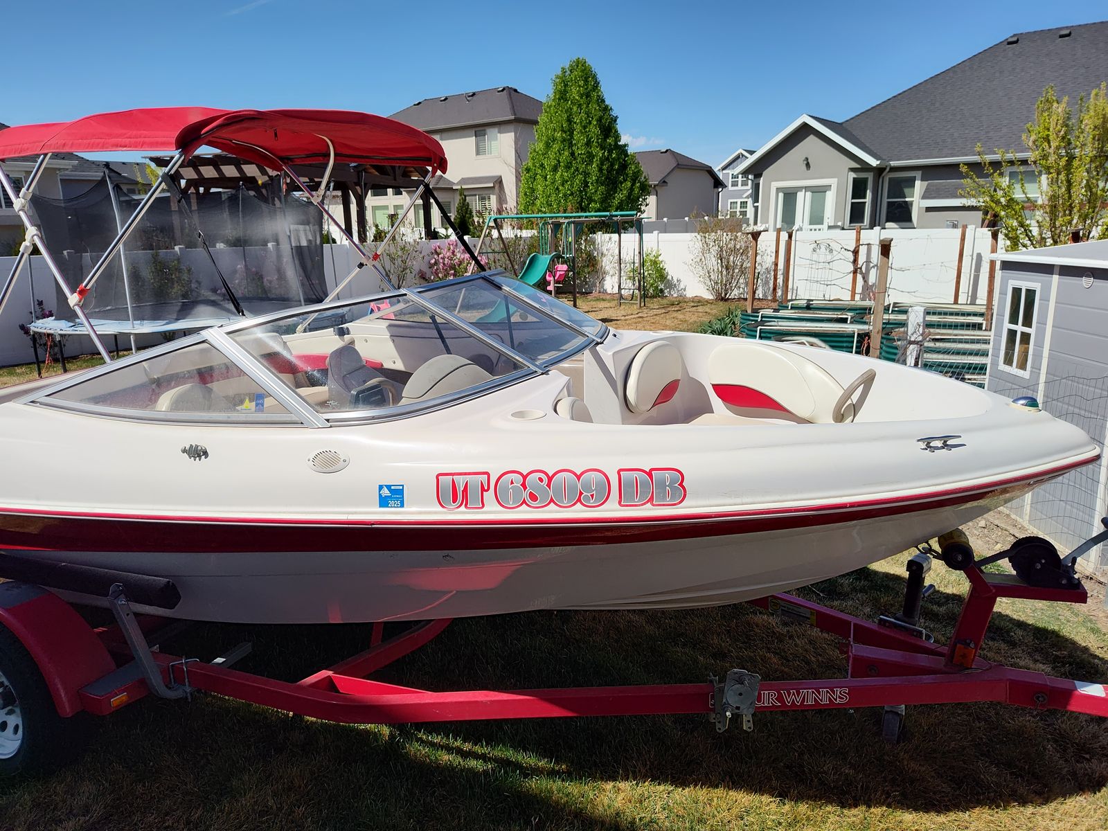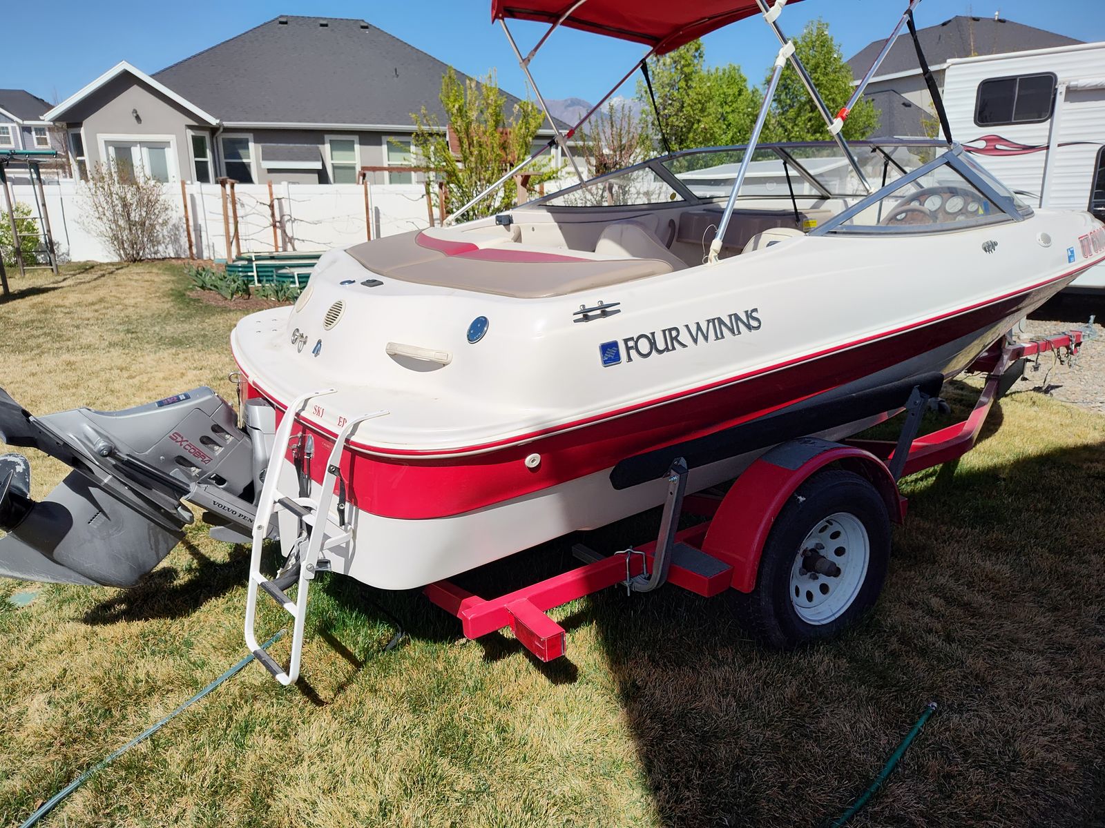 Umbrella top, bow seating, lots of storage: bow, sidewalls, ski locker Matched trailer built for the boat.