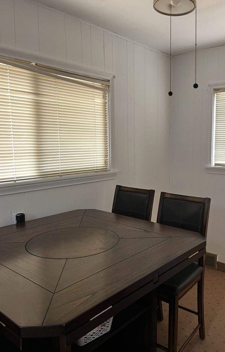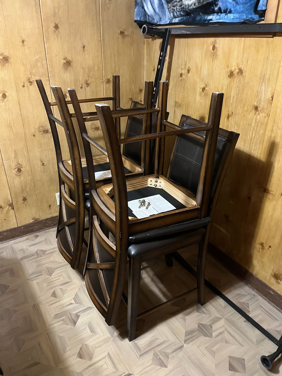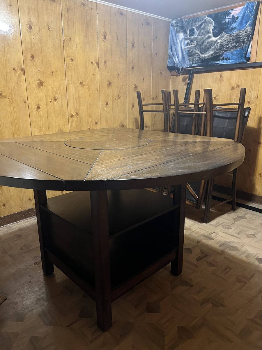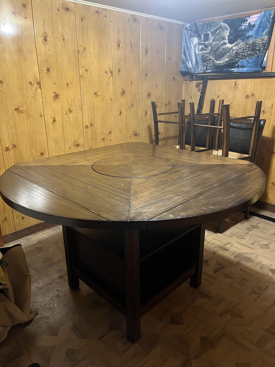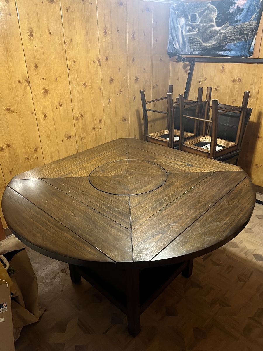 VenmoThis table is super sturdy. Just a little too big for our dining room. Has the middle turntable. Just some scrapes and dings but nothing big. It can be square or round. The round sides just fold under and then it’s square. Could use a clean as it’s been sitting in storage. Only used for a couple years. Was 700 new just for the table and about 175 per chair. Would just love it out of my storage room. $400 obo