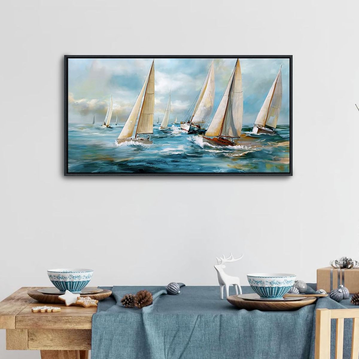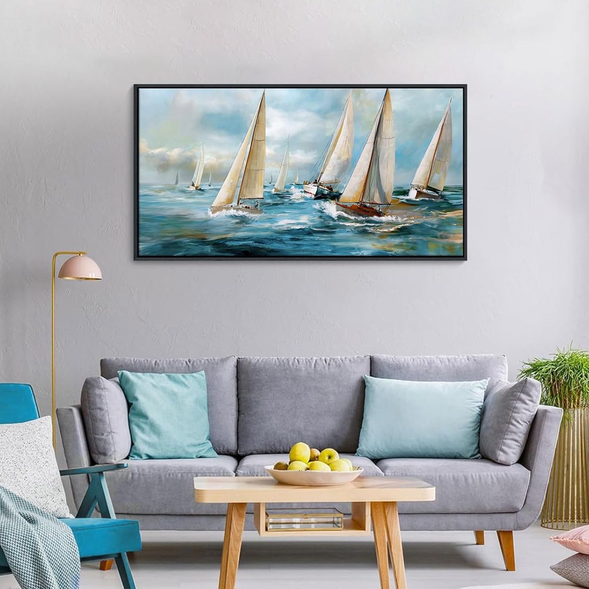 ApplePayYDYSUNE Sailboat Wall Art - Blue Canvas Retro Painting Textured Picture Artwork Vintage Nautical Large Painting Coastal Modern Print Frame for Living Room Bedroom Home 20x40inch