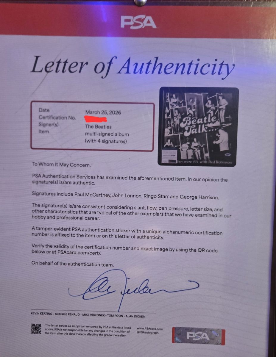 Signed by John Lennon, Paul McCartney, George Harrison, And Ringo Starr.