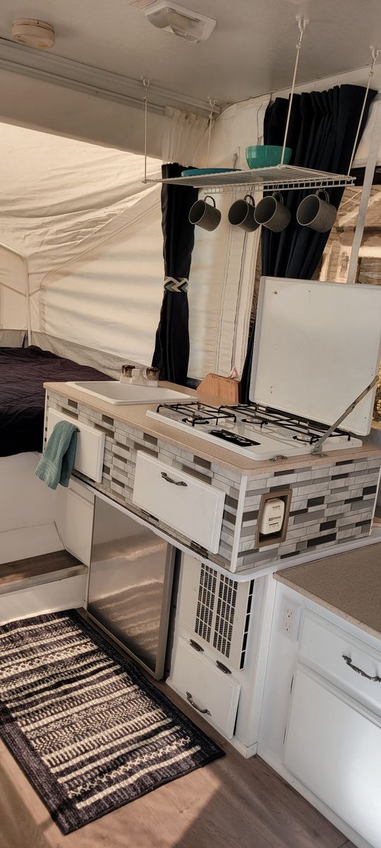 King/Queen/Dinette beds. Air Conditioner, furnace. Sink runs off battery power. Refrigerator, 3 burner stove, outdoor gas grill. Laminate flooring, custom cusion covers and blackout curtains. Lots of storage. Portable pump flush toilet. 2 propane tanks. New hand crank lift. Newer tires and battery. Stored indoors. If it's still listed it is still available.