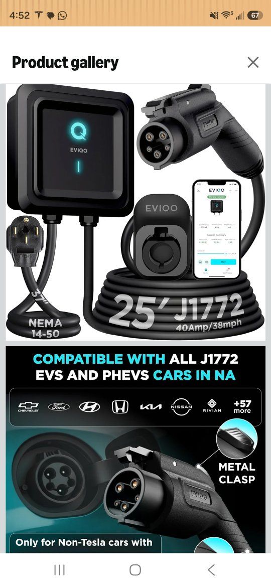 WAKE UP FULLY CHARGED: EVIQO Level 2 EV charger with a max output of 40A (9.6 kW) fully recharges most EVs overnight. This plug-in model works with a standard NEMA 14-50 outlet (40A or 50A circuit rating) COMPATIBLE w NON-TESLA EVs: Electric Vehicle Charging Stations works with all North American EV and PHEV models and also functions as a Tesla Level 2 charger when used with a J1772-to-NACS adapter (not included). The fully rubberized SAE J1772 connector with a durable metal latch provides a secure, ergonomic grip. SMART APP CONTROL: Enhanced WiFi Antenna keeps EVIQO EV car charger level 2 online in garage & basement. Control start/stop, set 6-40A current, get reminders & track consumption/cost right in the smartphone. Smart app features require the charger to be connected to 2.4 GHz WiFi (Internet) network. CERTIFIED & WEATHERPROOF: UL/ETL/FCC/Energy Star certified and built into an IP66/NEMA-4 weatherproof enclosure, so this electric vehicle charging station stands up to rain, snow, heat and dust. Mainboard steel shielding protects the internals of the charger for long term use. NEW FLUORESCENT HOLSTER: High-visibility fluorescent holster makes plug-in and storage easy even in low-light conditions. Helps quickly locate the connector at night and keeps it securely stored when not in use. SAVE MONEY: Schedule charging during off-peak night hours in the app to reduce energy costs. Remote software updates keep your charger smarter and more reliable. EASY-ACCESS SIDE RESET BUTTON: Restart the charger in seconds - no need to open the unit or disconnect power. Get back to charging and enjoy your drive. 37” NEMA 14-50 input cable + 25ft EXTRA-LONG charging cable for effortless reach to every corner of your garage and convenient outdoor charging. High-visibility fluorescent holster makes plug-in and storage easy even in low-light conditions.