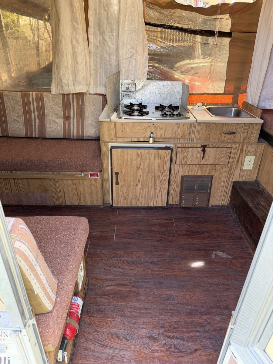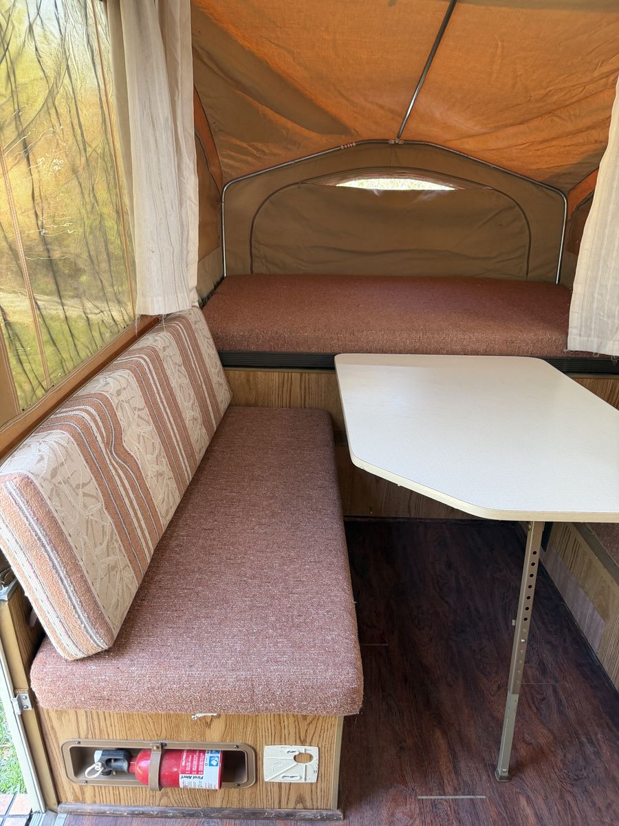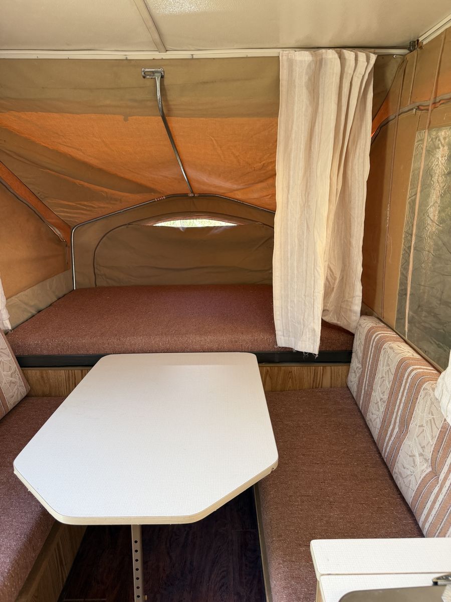 Key Features: • Sleeps up to 6 comfortably • Lightweight & easy to tow (perfect for SUVs and smaller trucks) • Expands into a spacious camper in minutes • Dinette seating converts into additional sleeping space • Built-in storage cabinets • Sink and countertop space for food prep • Classic pop-up design for easy storage and transport