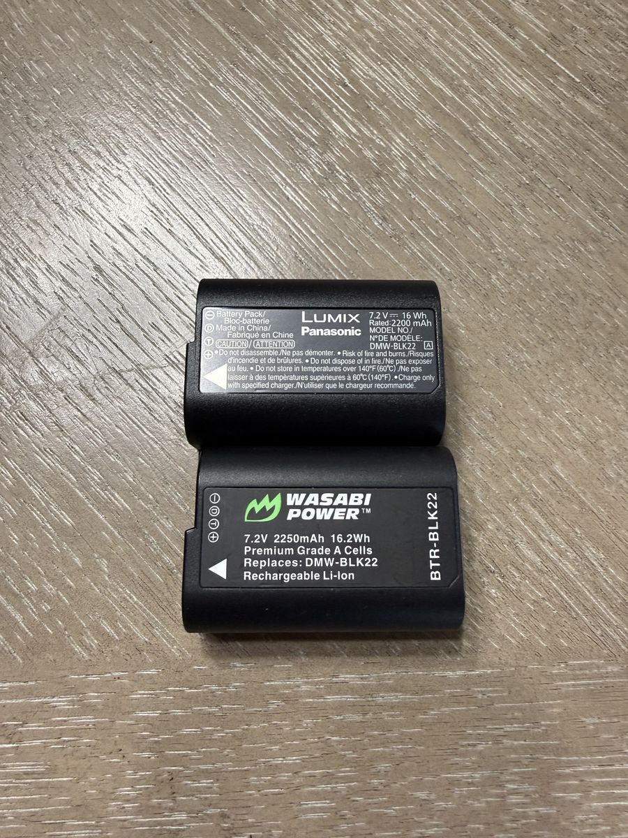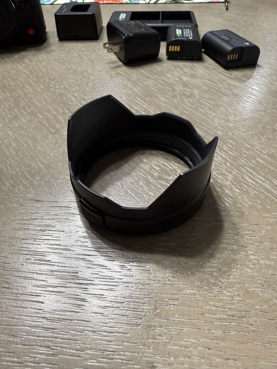 Comes with both a genuine and third party battery, chargers and cables for each, a lens hood for the 12-60mm kit lens (not included), the original strap, and the manual.