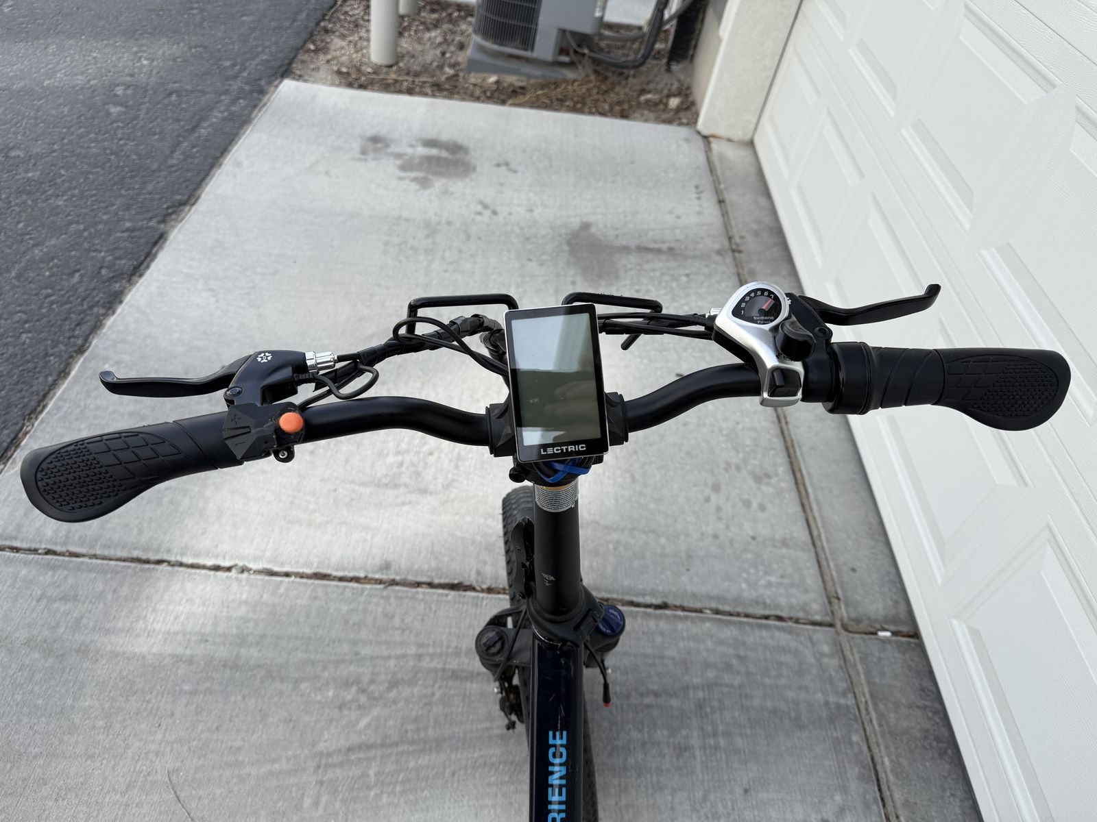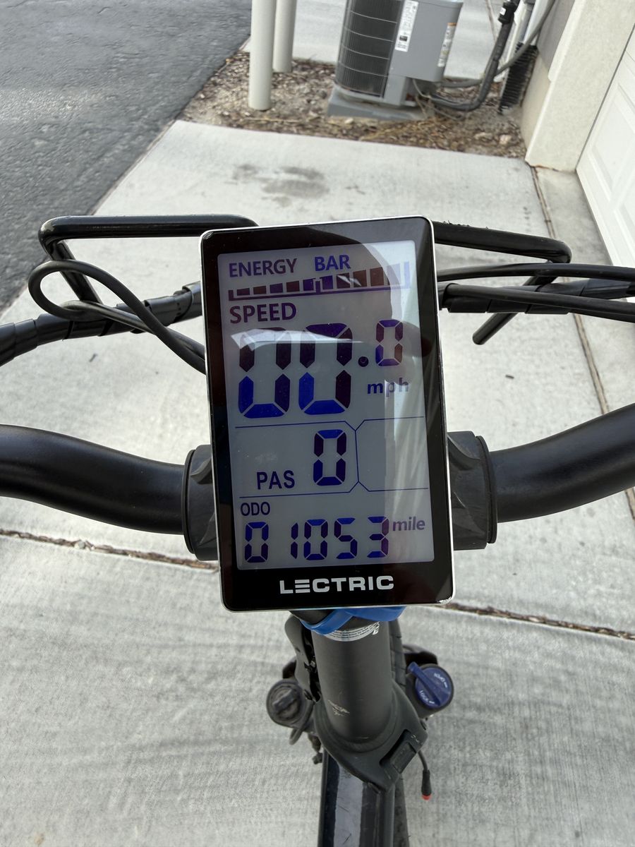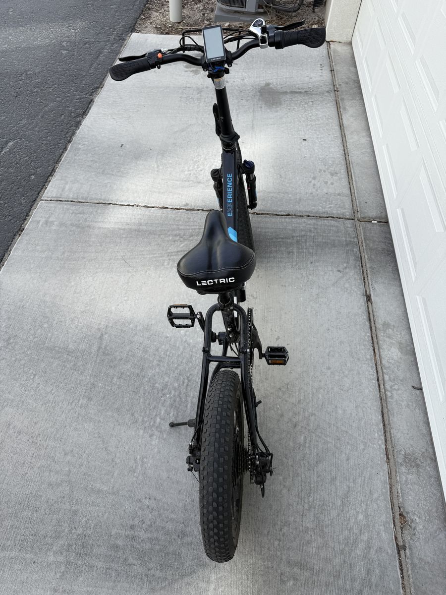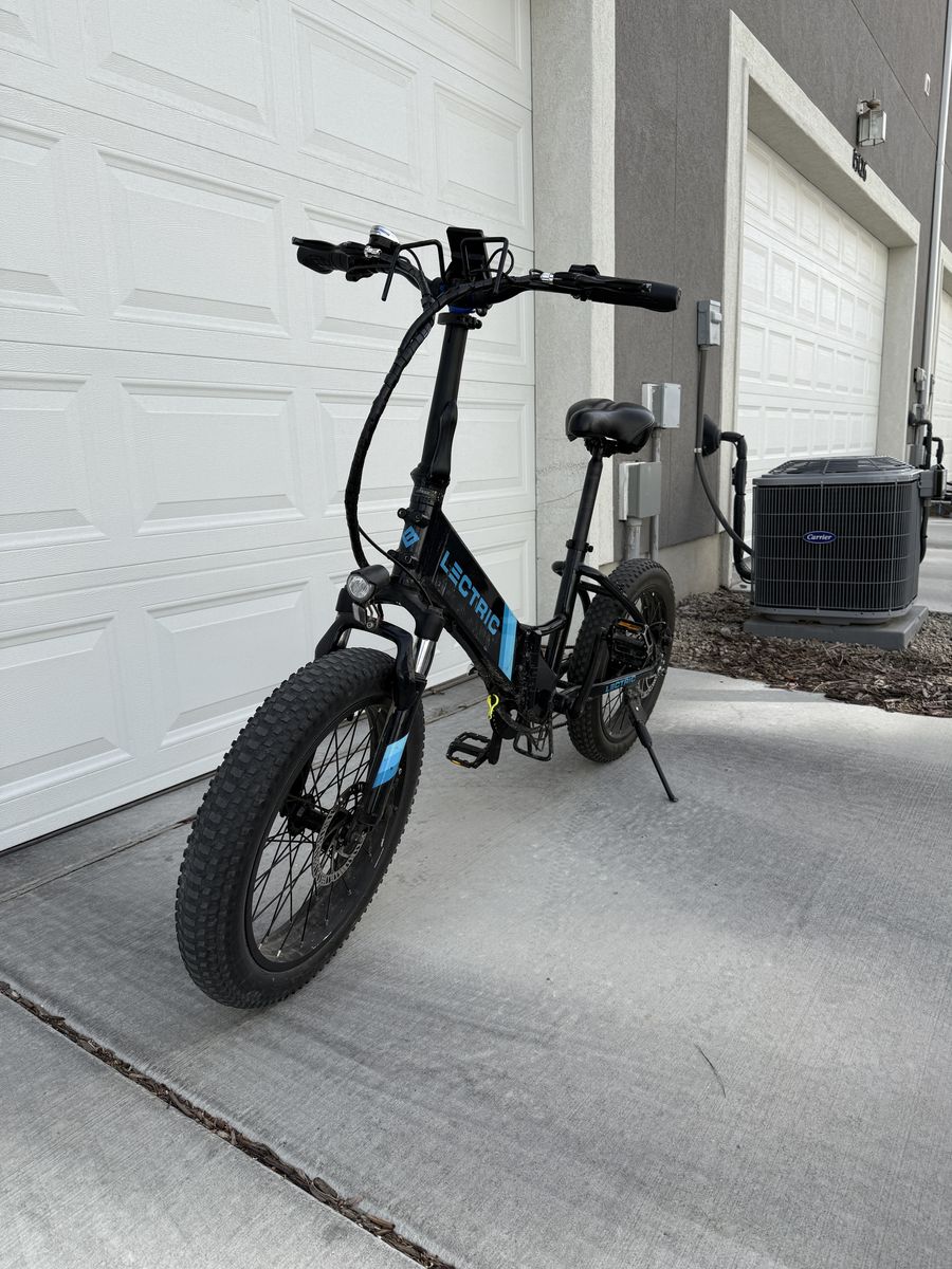 VenmoReliable Lectric XP 2.0 Step-Thru electric bike has black frame with blue accents. It features 20-inch fat tires, front suspension fork, and integrated headlight. Handlebars include digital display and Shimano 7-speed shifter. Selling because we upgraded to a larger bike and no longer need this one. It has been a fun, reliable ride.