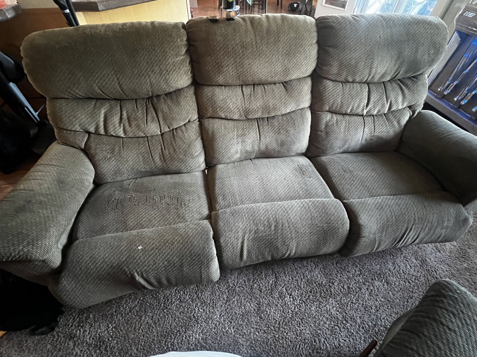 Reclining Couch and Loveseat. All recliners work. In good condition. Couch has a small paint spot. No rips or tears.