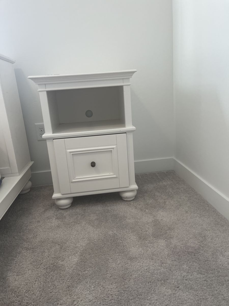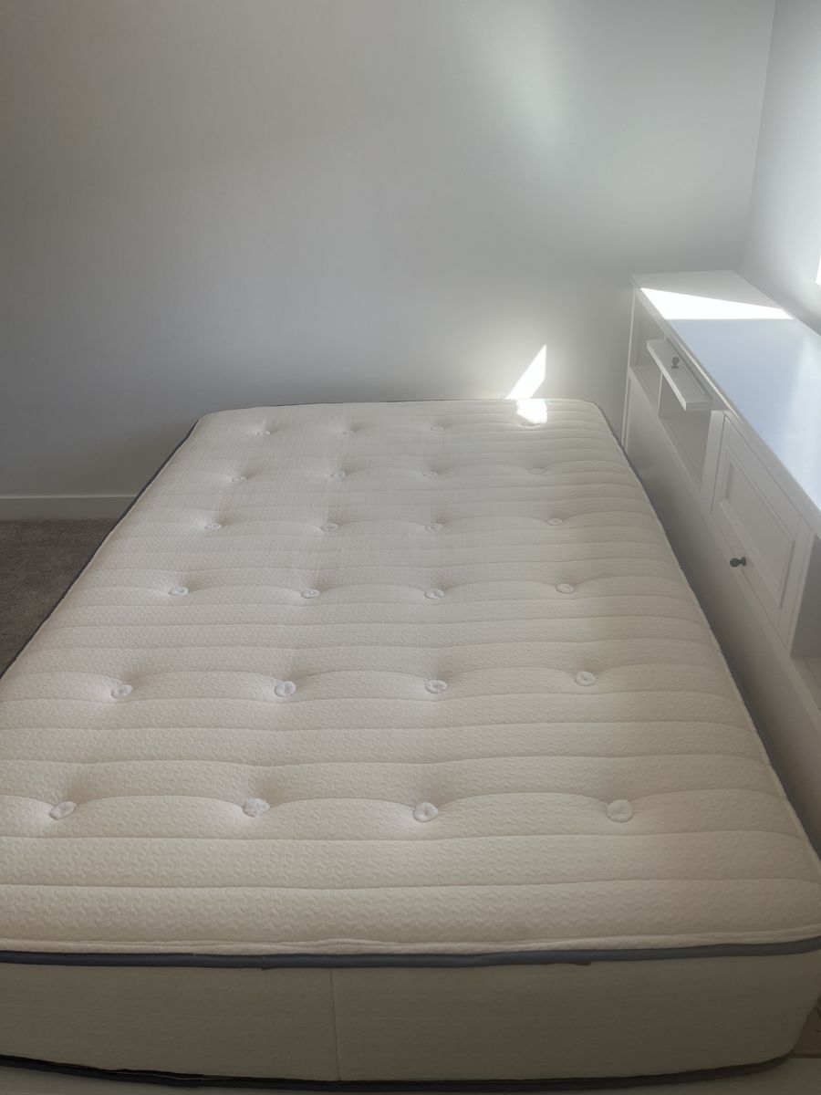 Bed: Platform bed with storage and book case on opposite side. Organic full long mattress 10.5inch thick good shape no stains. Matching Bedstand with lots of storage.