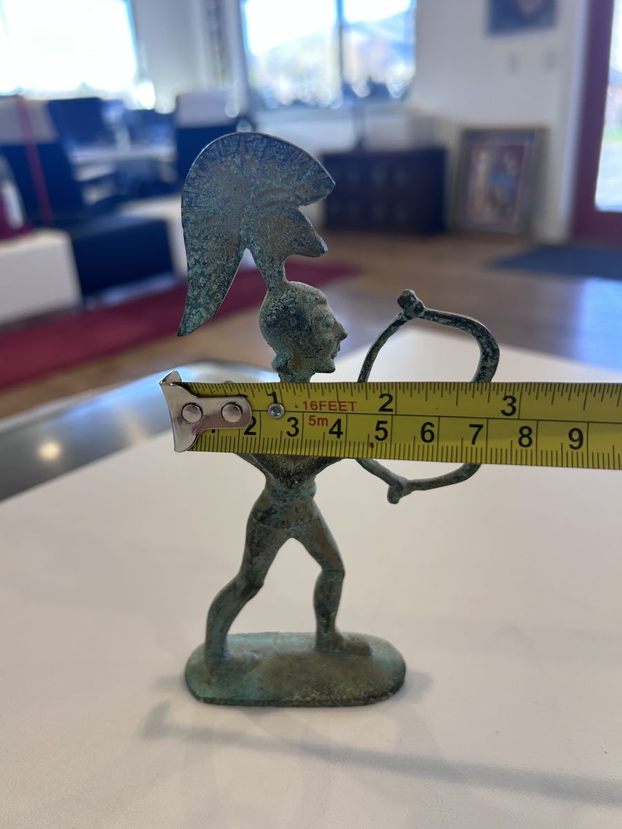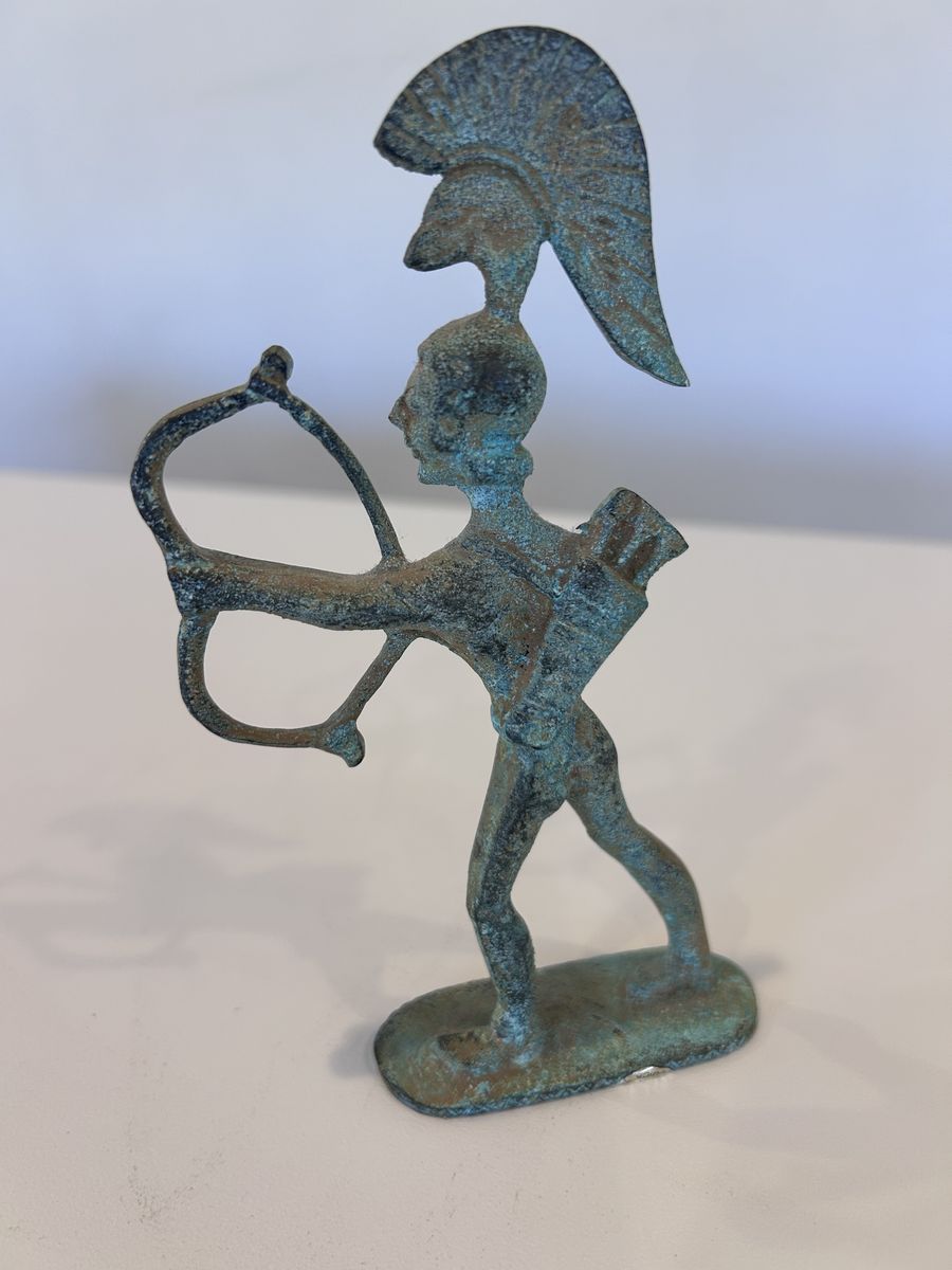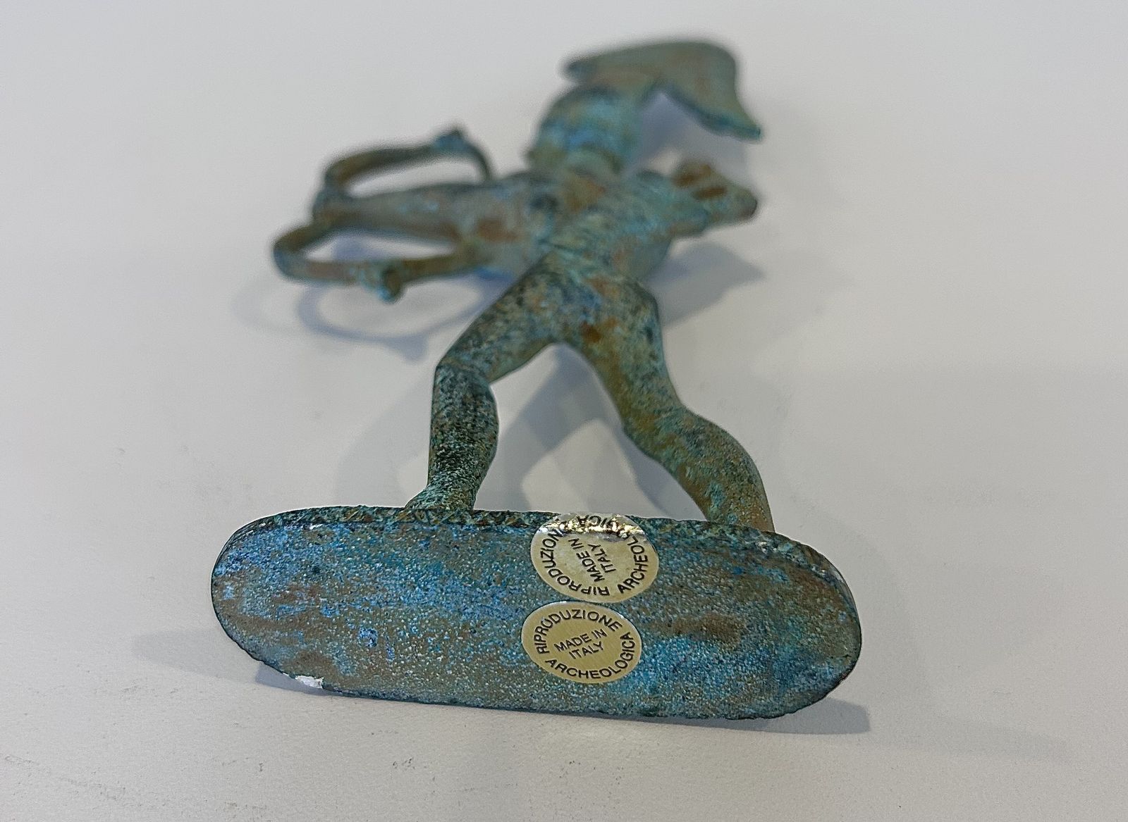 ZelleThis small bronze reproduction depicts an Etruscan warrior standing at 6.25 inches tall. The multicolor statue showcases intricate details and a patina finish, adding to its historical authenticity. Made in Italy, this piece reflects the style and craftsmanship of the Etruscan civilization, making it a unique and decorative collectible for art enthusiasts and collectors alike.